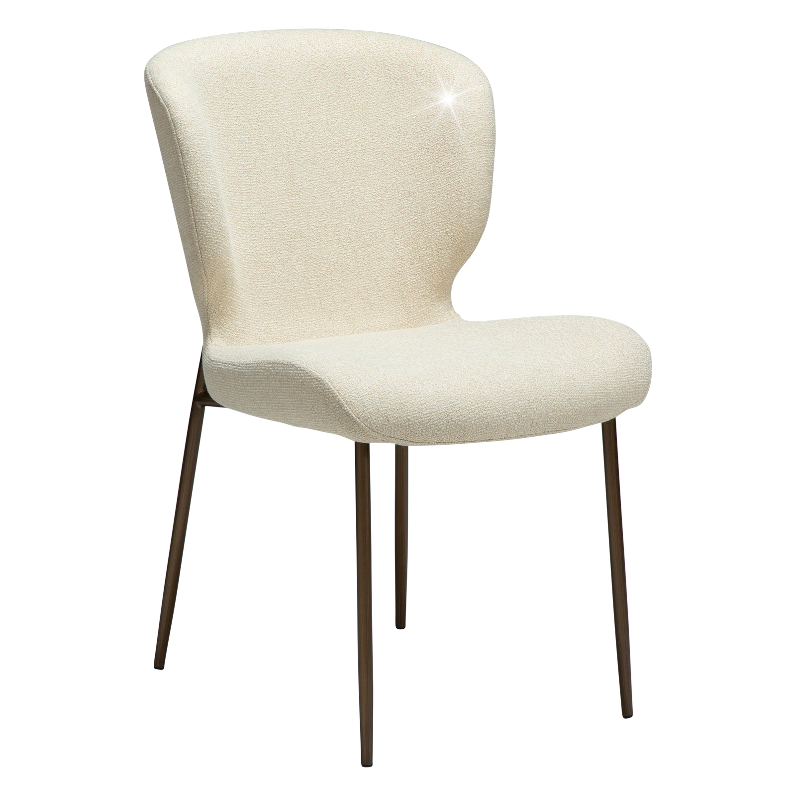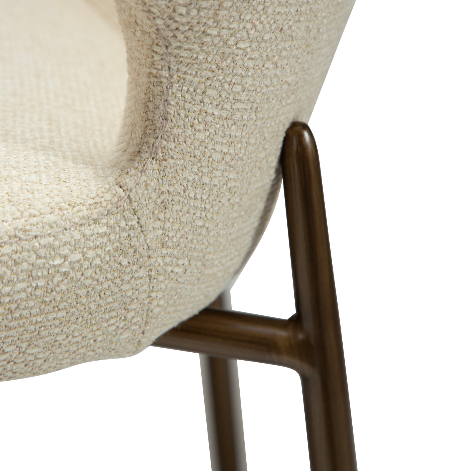 The GLORY chair has a fresh and funky design. Its back forms into "wings“ on each side, creating a beautiful curved back which, in combination with the extended legs on the back, makes the chair interesting to look at from any angle. This bouclé fabric has a subtle shimmer that makes the chair sparkle ever so slightly. THE GLORY COLLECTION consists of chairs and counter stools.