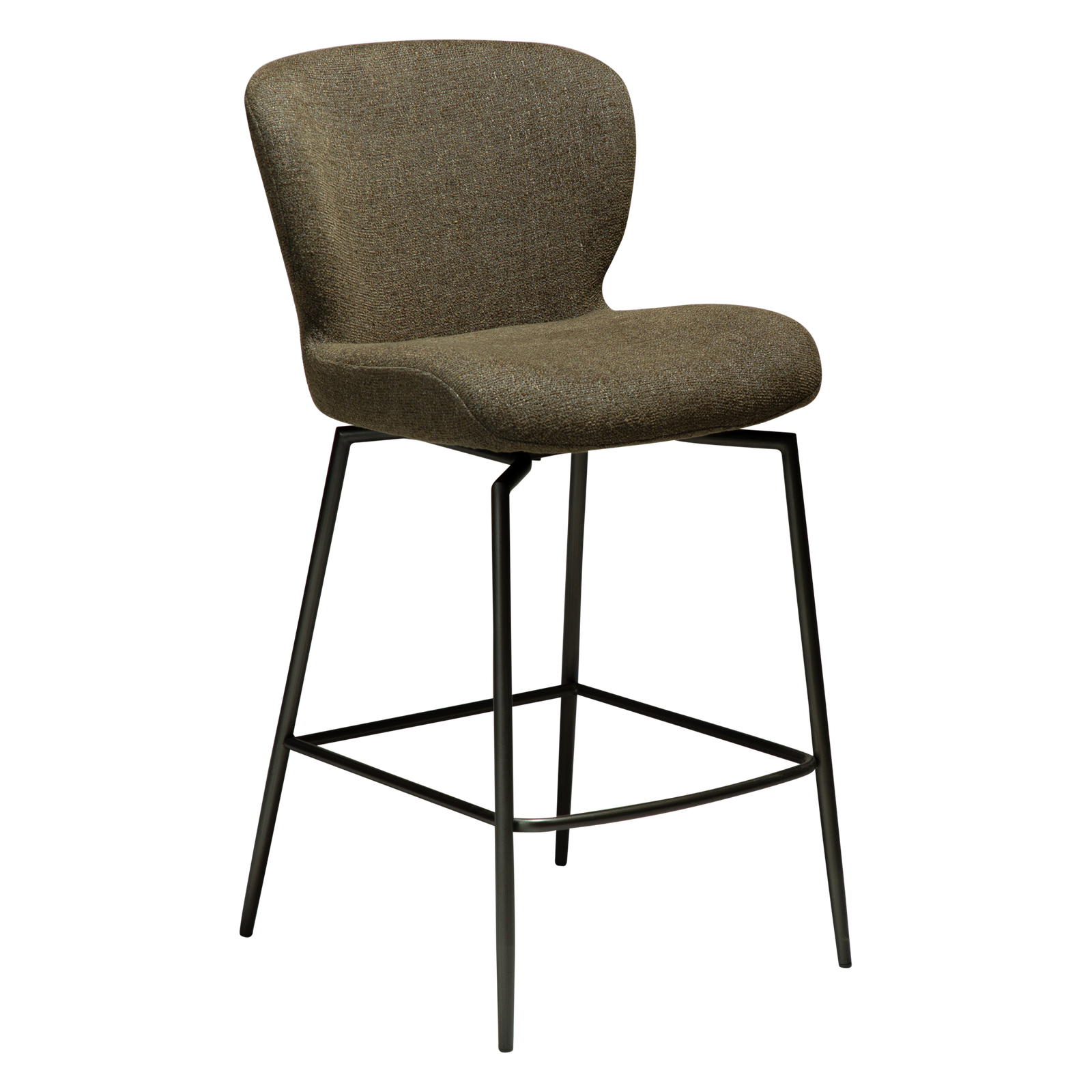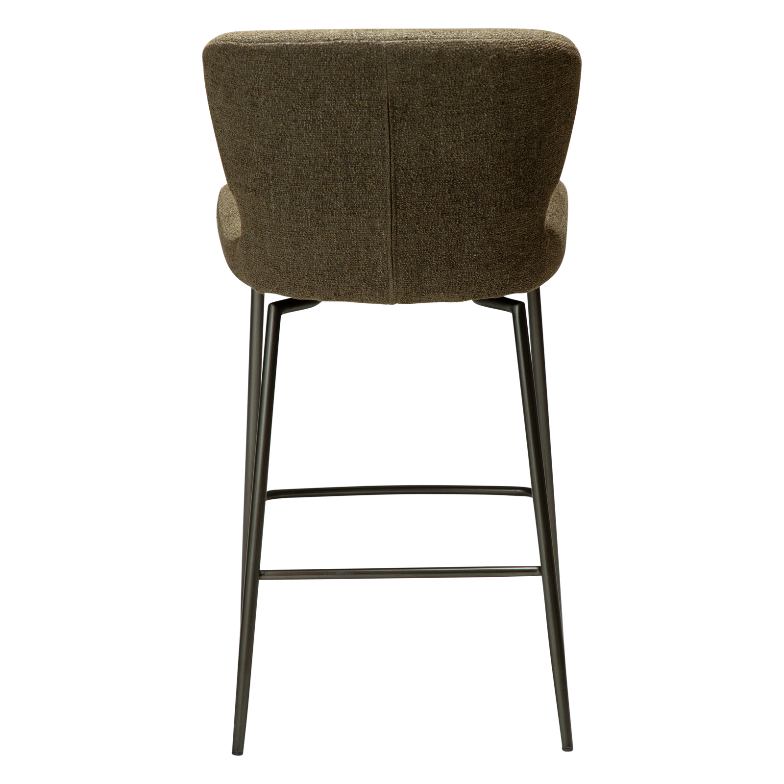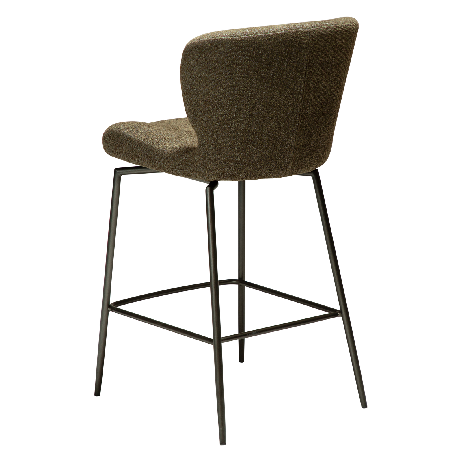 Dark olive bouclé fabric with antique pewter swivel legs