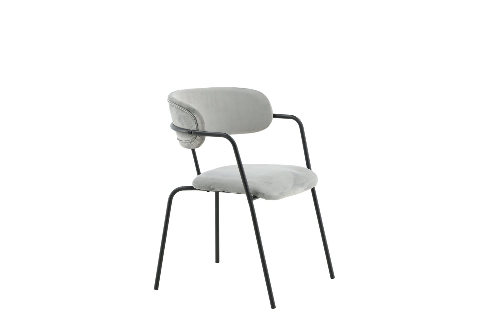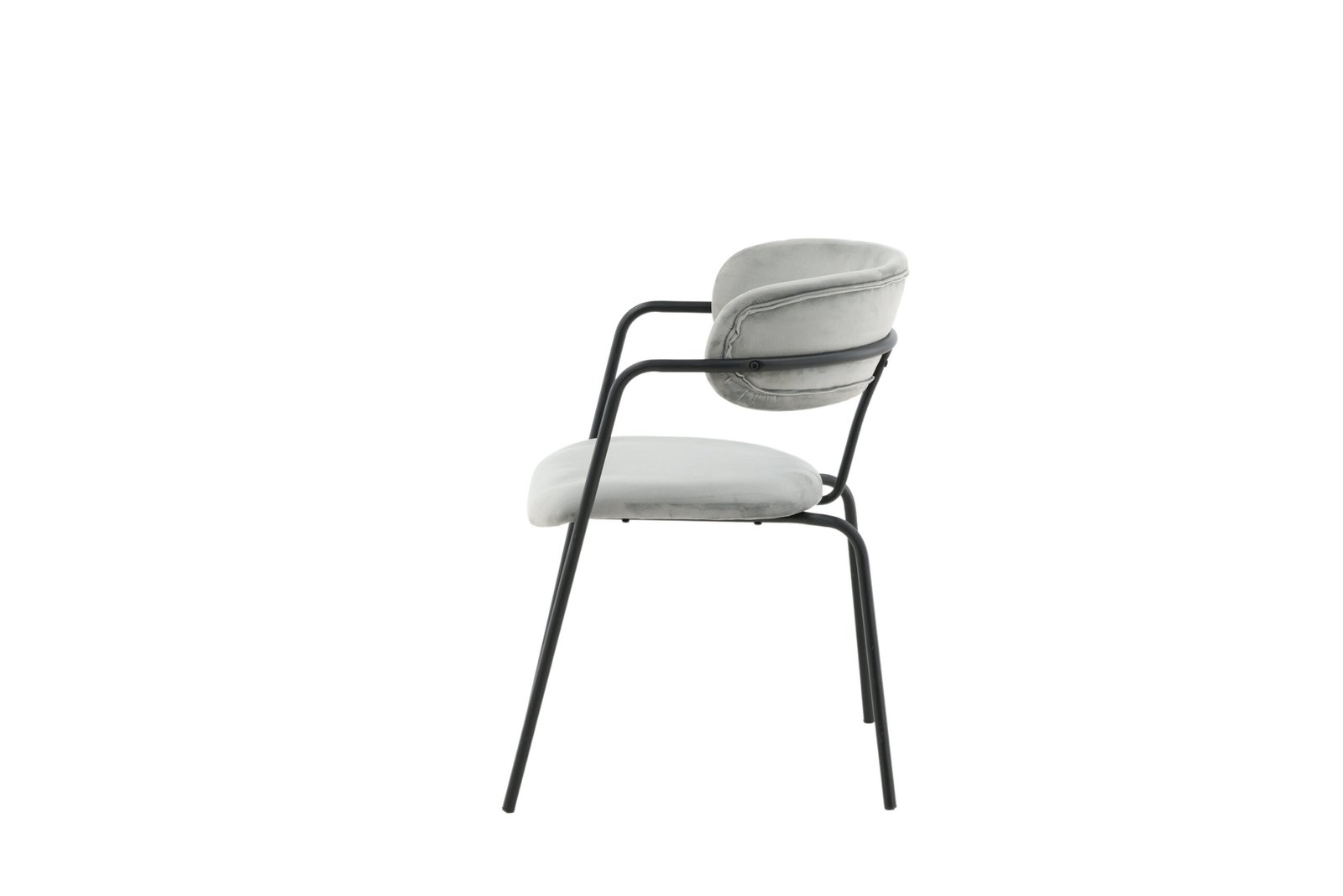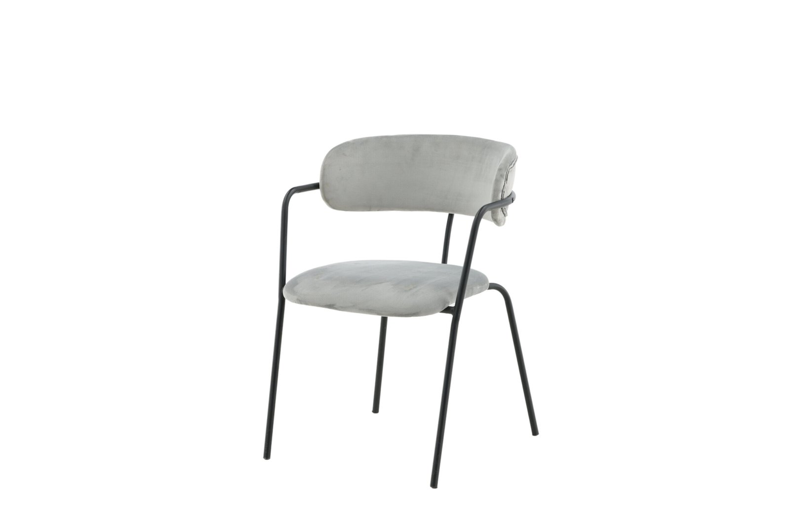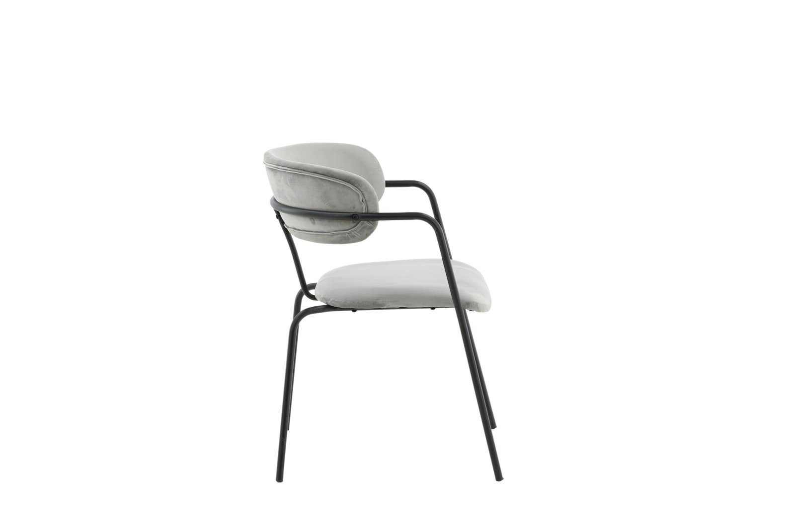 As comfortable as it is eye-catching! This stylish dining chair from the Arrow series features a modern frame with legs and integrated armrests in black powder-coated metal. The backrest is gently rounded in the same material as the seat, in padded gray velvet fabric. Create a pleasant focal point in the heart of your home! Some assembly required.