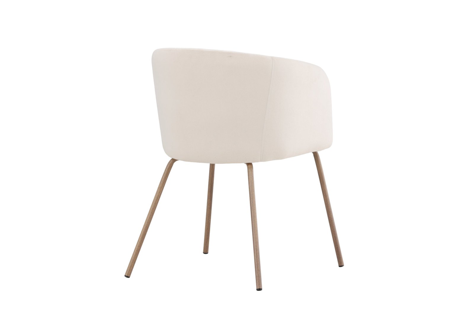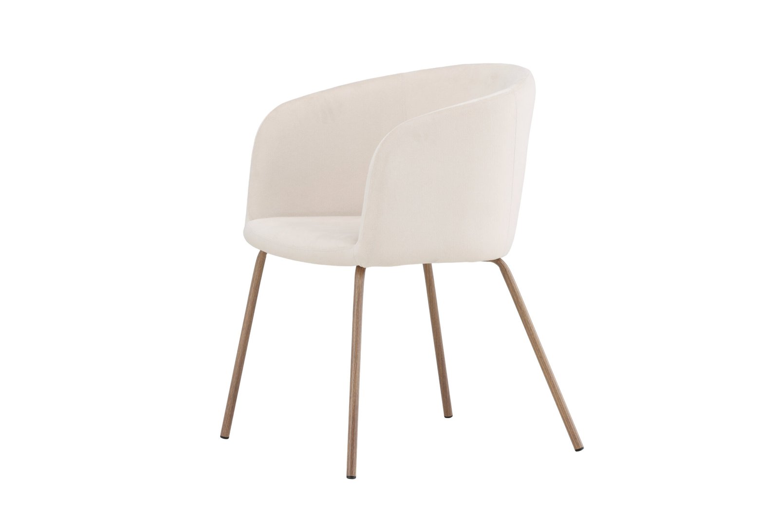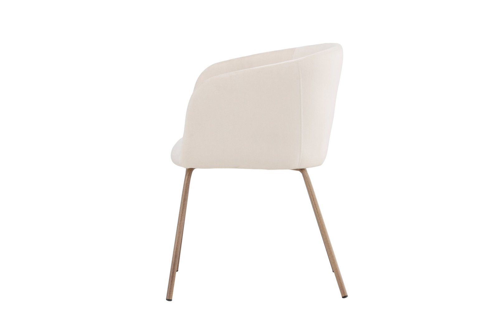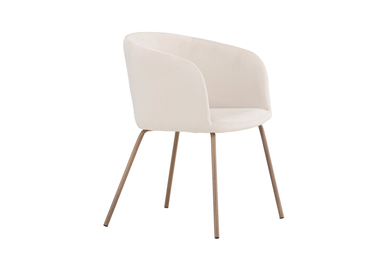 Berit is a sleek dining chair that combines comfort with modern aesthetics. The chair features wood-colored legs in durable steel, providing both stability and a warm, natural look. The seat is upholstered in a soft beige velvet fabric that offers an inviting feel and fits perfectly in most homes. With its generous seating comfort, Berit is a chair you'll want to linger in – whether for dinners, conversations, or long coffee breaks.
