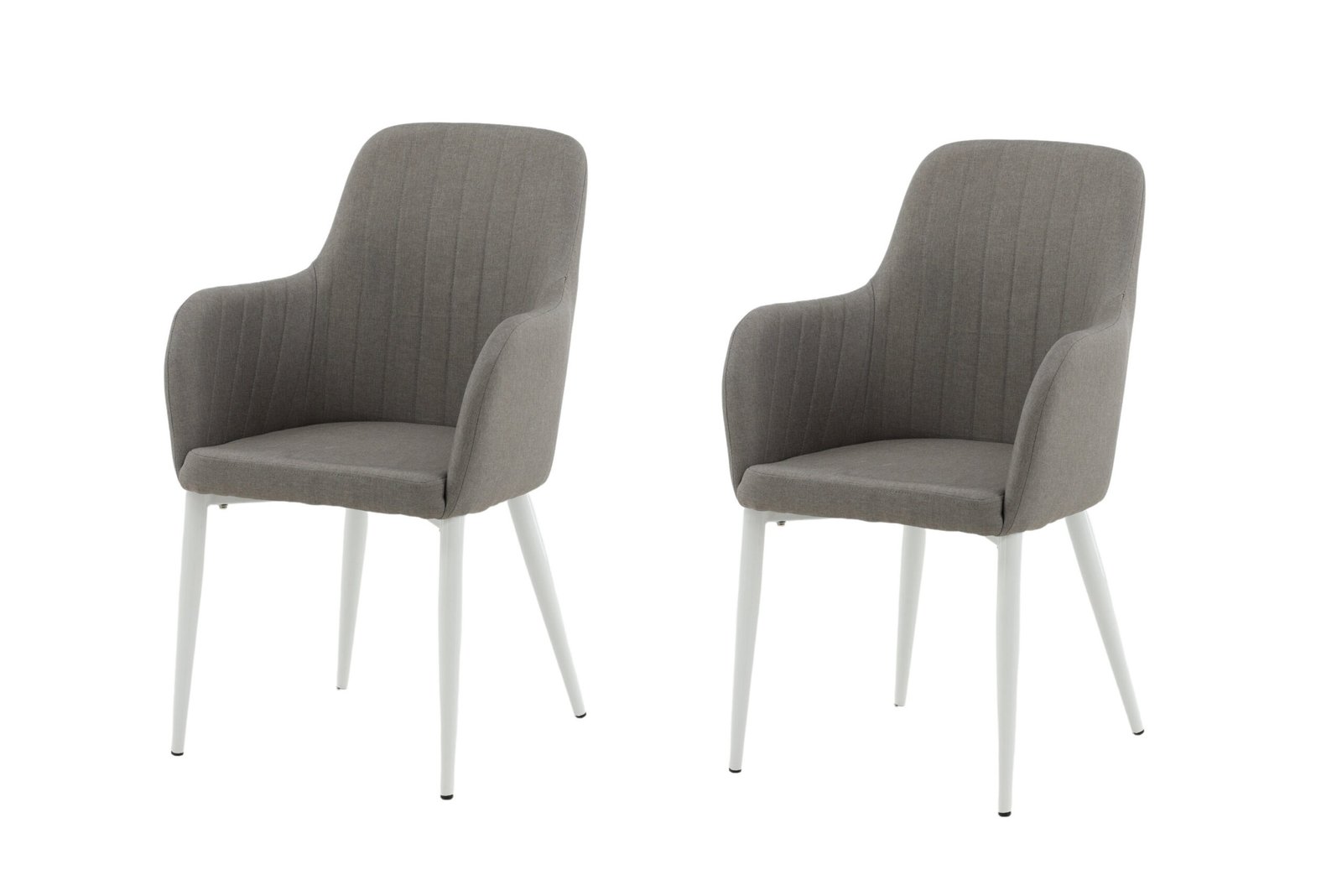 Sit comfortably and enhance the pleasant atmosphere around the dining table but a relaxing dining chair from the Comfort series! It has a tough fully dressed design with legs in white powder coated metal and back and seat with integrated armrests in gray polyester fabric with comfortable sitting comfort. Decorable stitches on the inside of the back and armrests become a stylish detail. Lighter assembly is required.