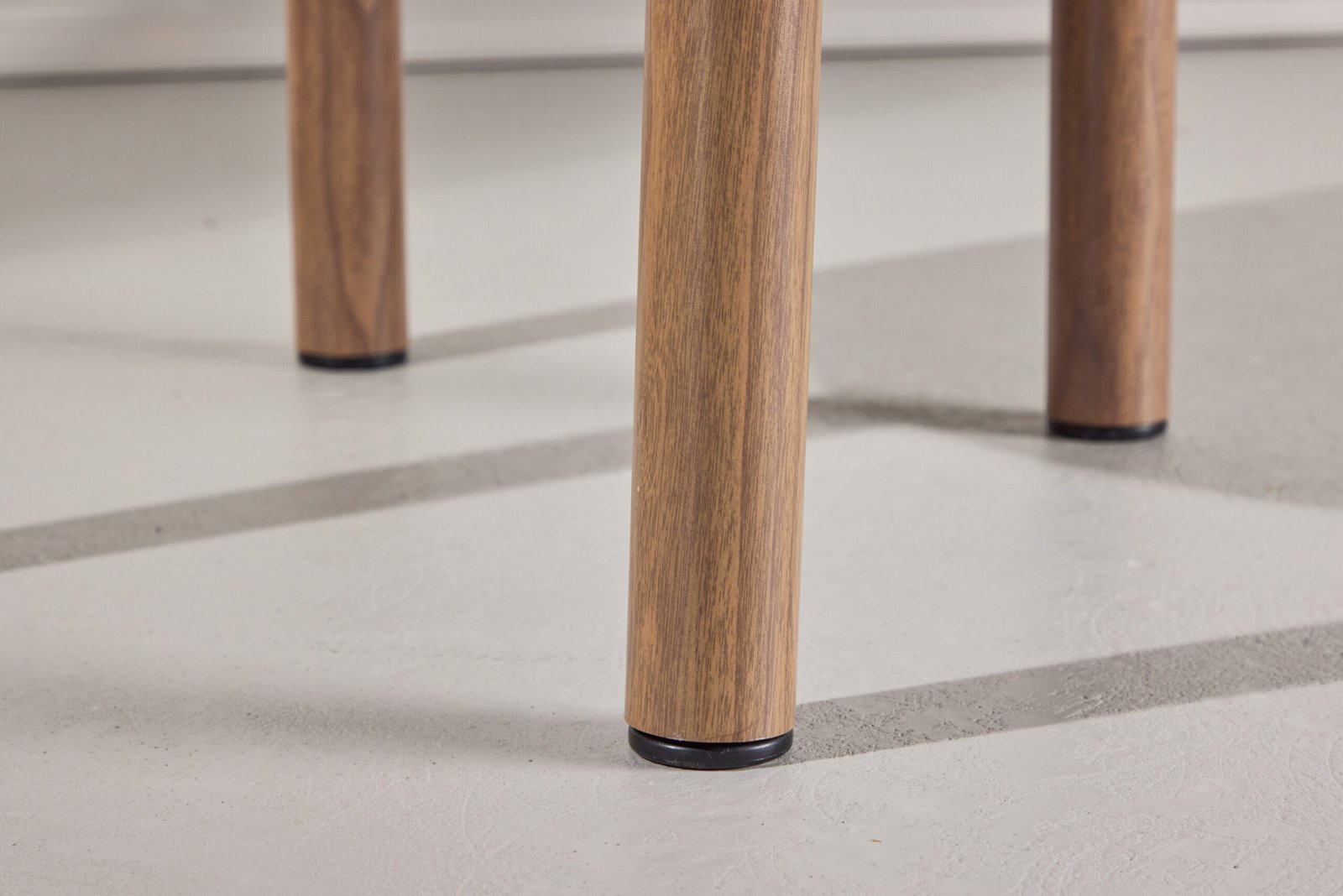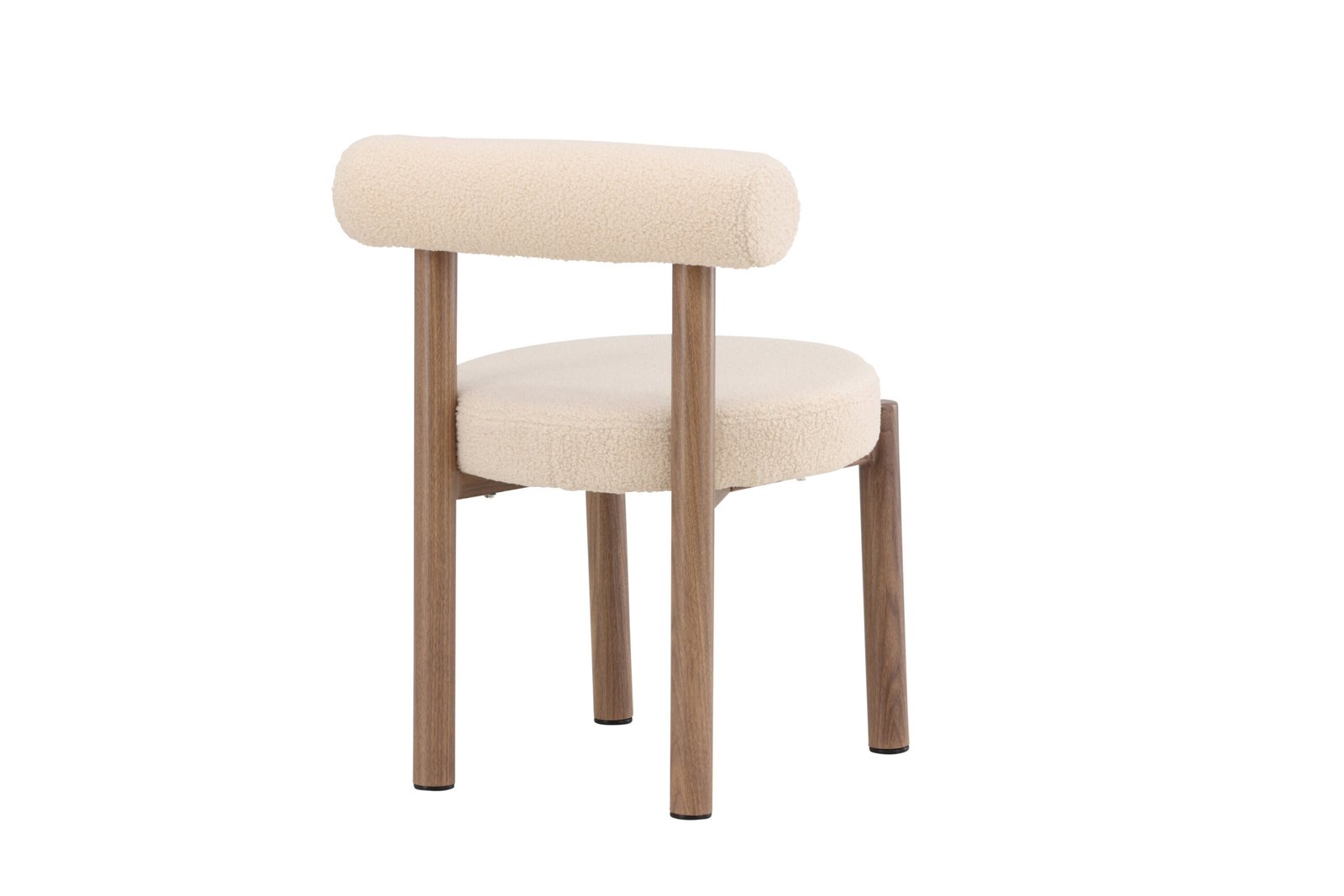 The seat is upholstered in white bouclé fabric, giving a warm and inviting feel with its soft, textured surface. The combination of the sturdy base and the comfortable seat makes Tillo both a stylish and practical choice for your kitchen or dining room.