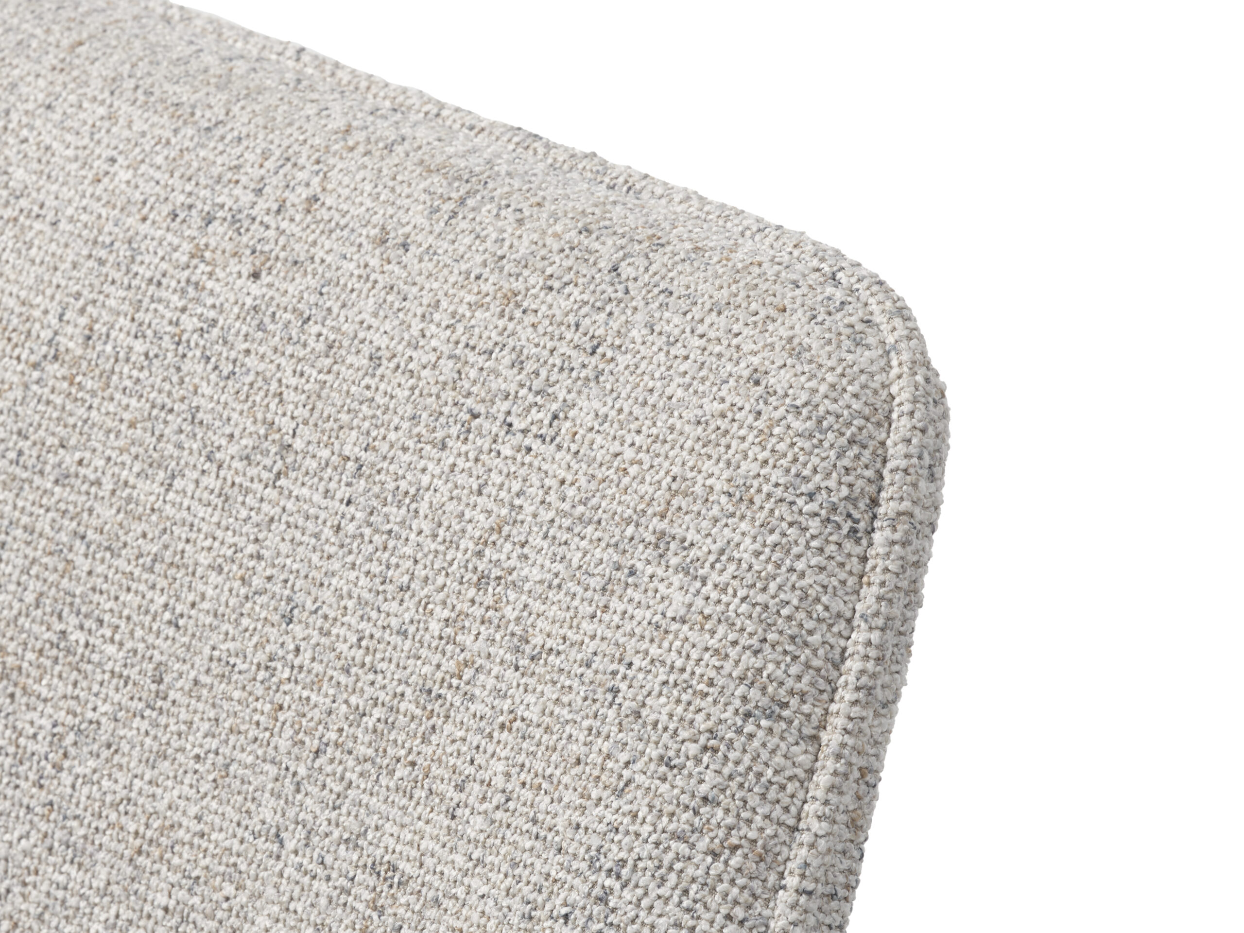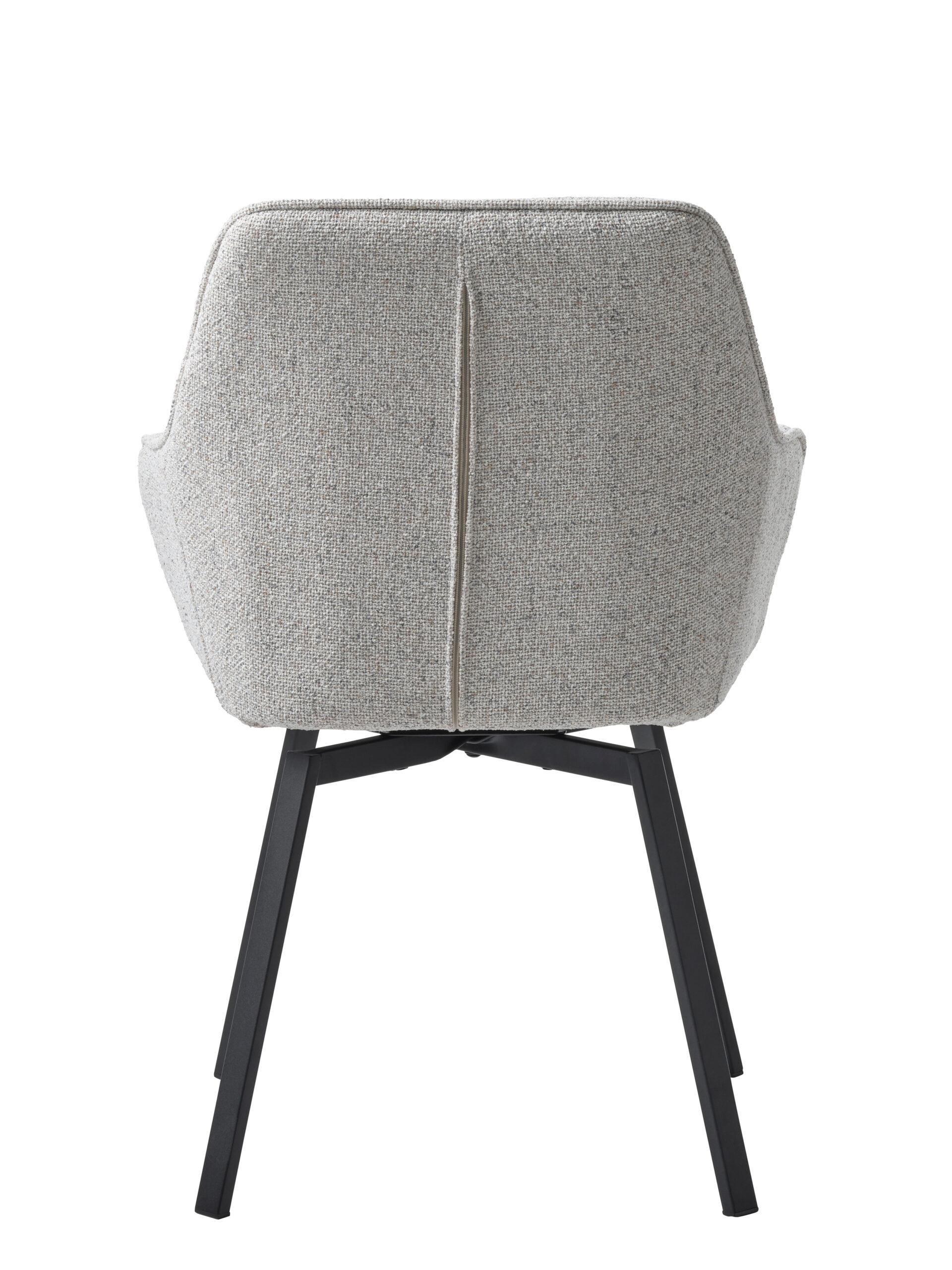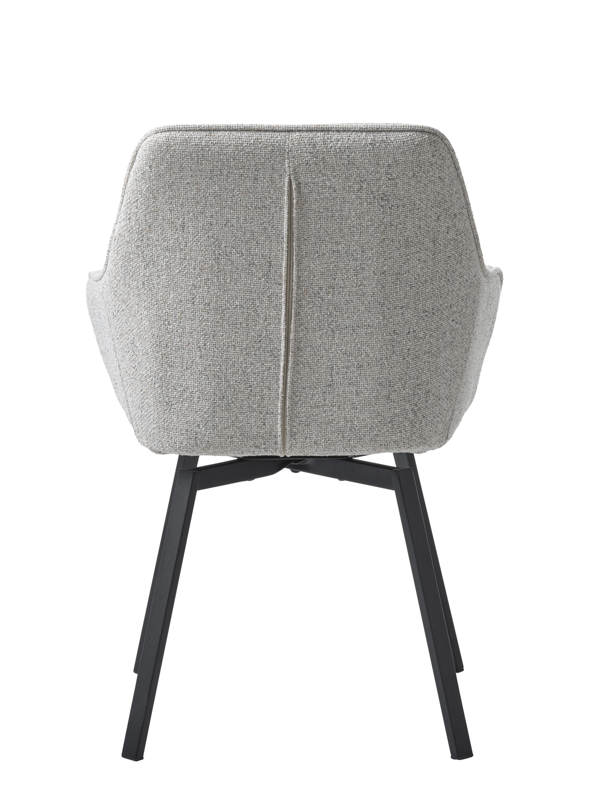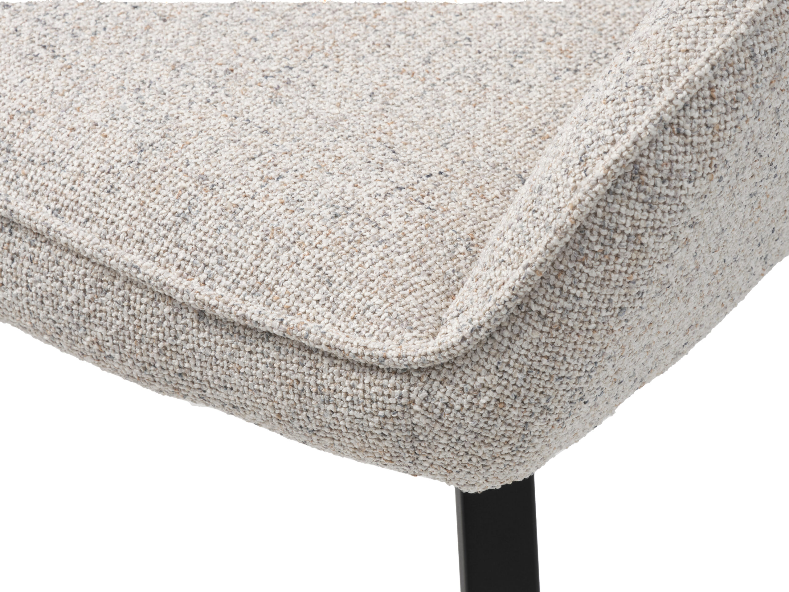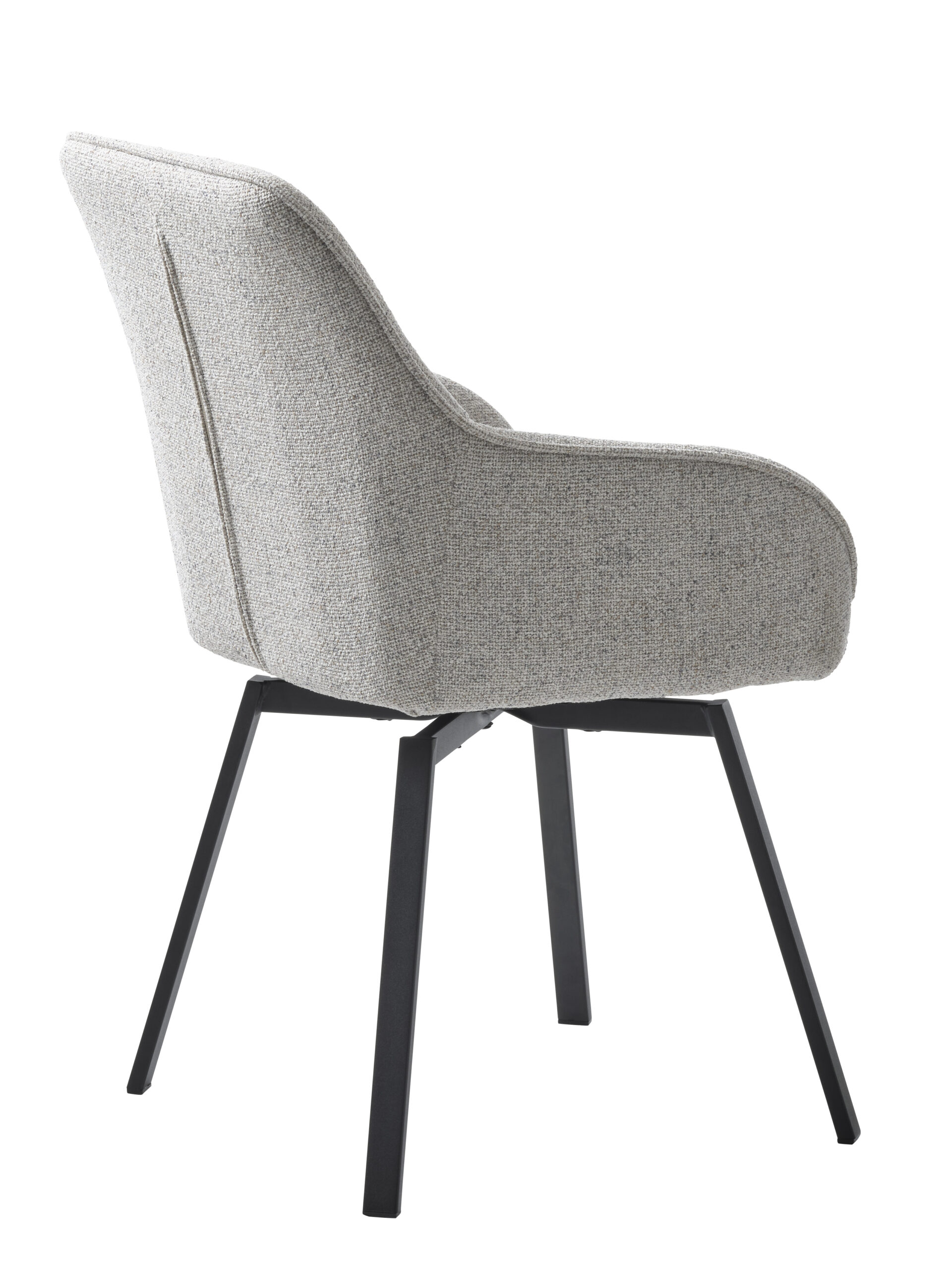 Kaučiukmedis 22, juodos MPG kojos, pasukamas, KD Hevre – dviejų siūlų sudėties audinys. Pūkuoti daugiasruogiai siūlai, sudaryti iš skirtingų spalvų pluoštų, susipynusių su plonesniais siūlais, suteikia buklė efektą. Dėl smulkių audinio kilpelių paviršius švelnus ir atsparesnis tempimui nei įprasta buklė, o harmoningai suderintos spalvos kuria patrauklų vaizdinį įspūdį iš arti.