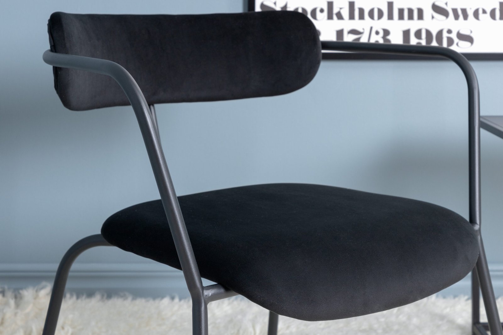 Papuoškite savo namus foteliu, sukurtu atsižvelgiant į šiuolaikines mados tendencijas ir susikurkite patrauklų ir modernų interjerą! Fotelio Duffy atlošas ir sėdimoji dalis aptraukti minkštu juodos spalvos aksomu, kuris kuria jaukią kambario nuotaiką. Apgalvota visuma, minimalistinis dizainas, rėmas, kojos ir integruoti porankiai pagaminti iš juodo milteliniu būdu dažyto metalo. Pakylėkite interjerą į kitą lygį su stiliaus ikona, kuri dera ir komplekte su sofa!