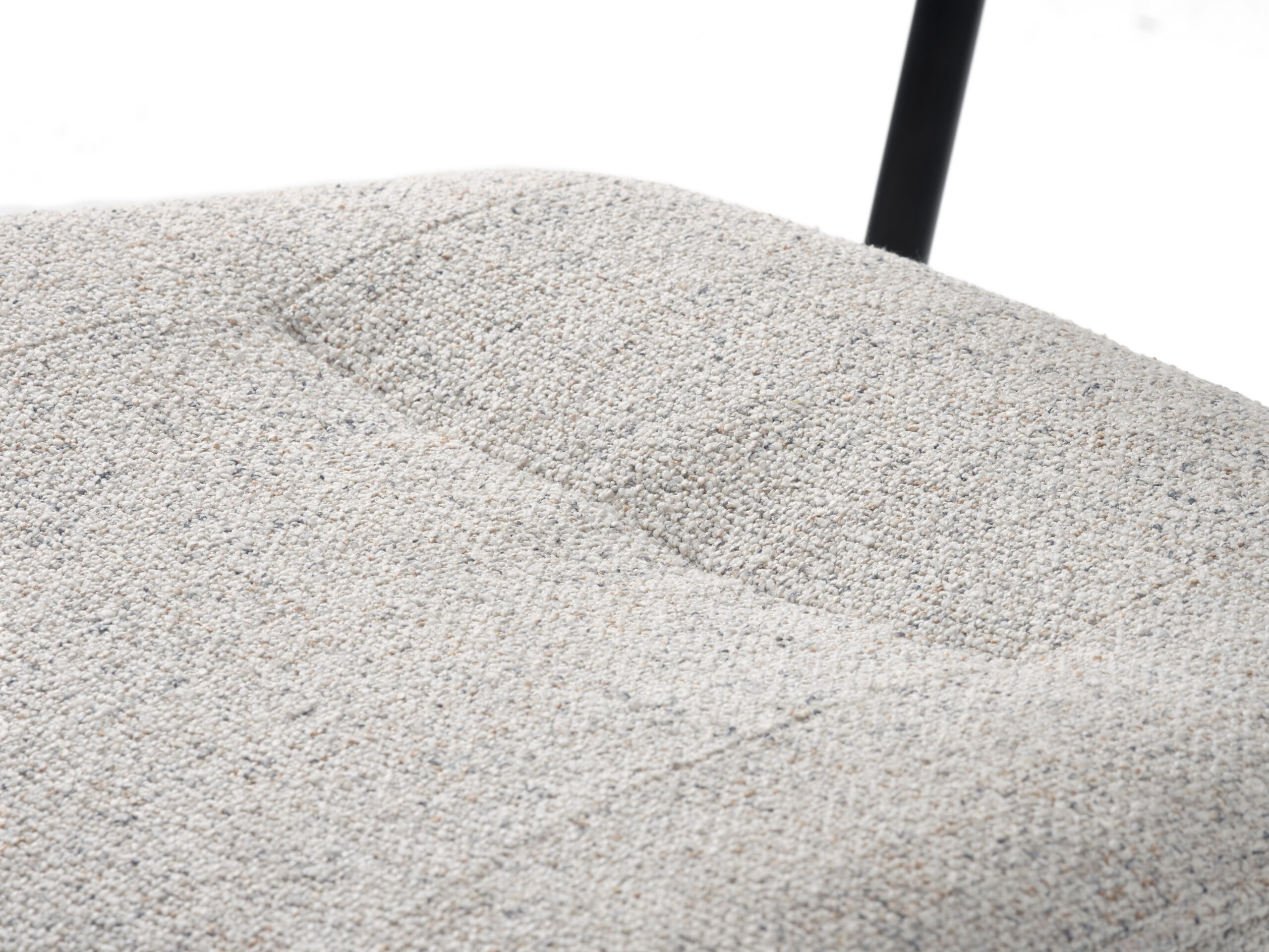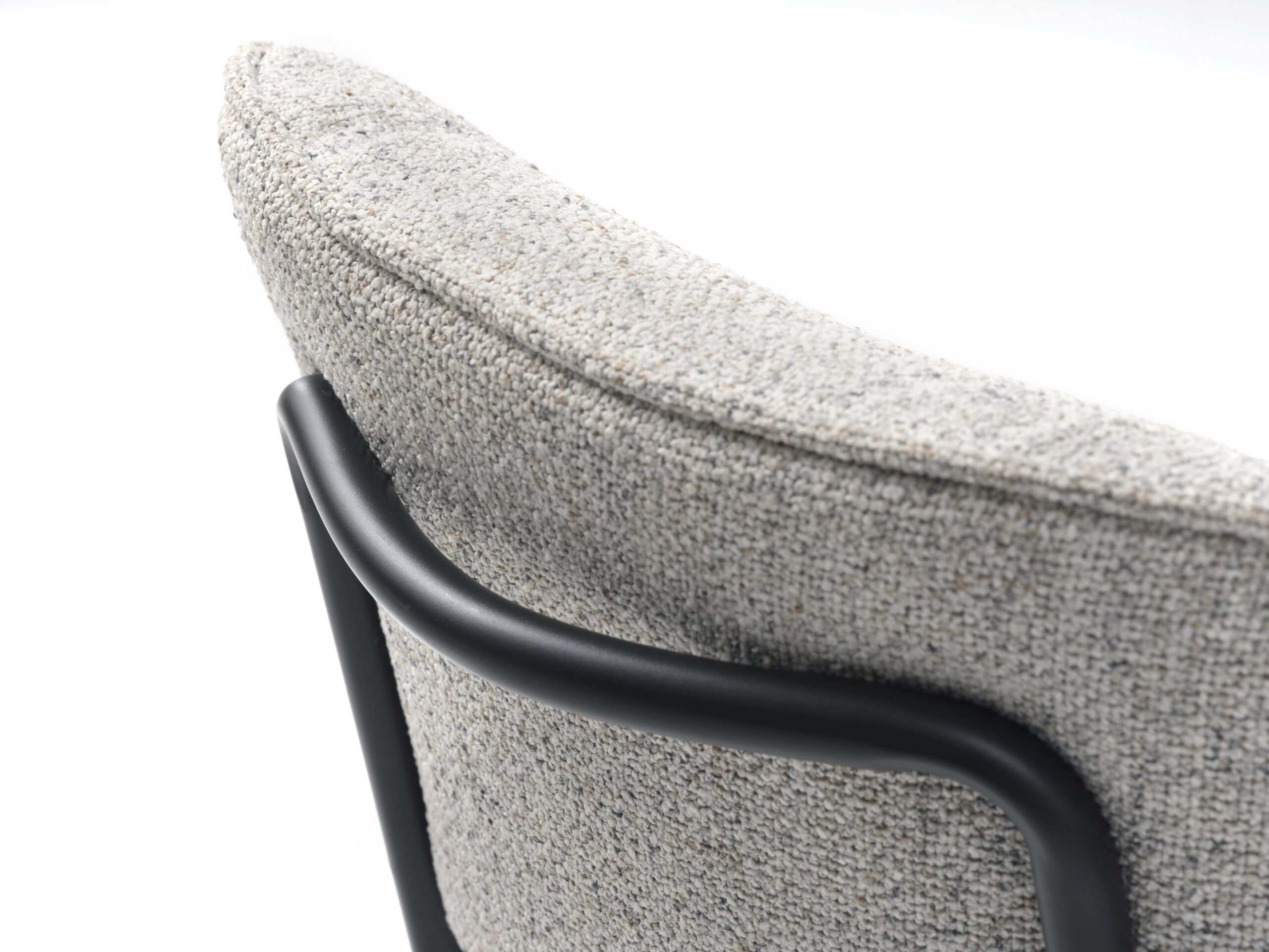 Kaučiukmedis 22, juodos MPG kojos, KD HEVRE – dvigubo siūlo sudėties audinys. Pūkuoti daugiasluoksniai siūlai iš skirtingų spalvų pluoštų, persipynę su plonesniais siūlais, sukuria buklė efekto paviršių. Smulkios kilpelės suteikia malonų švelnumo pojūtį ir užtikrina didesnį atsparumą tempimui nei įprasti buklė audiniai, o harmoningai suderintos spalvos, suteikia audiniui įdomią, giluminę dimensiją.