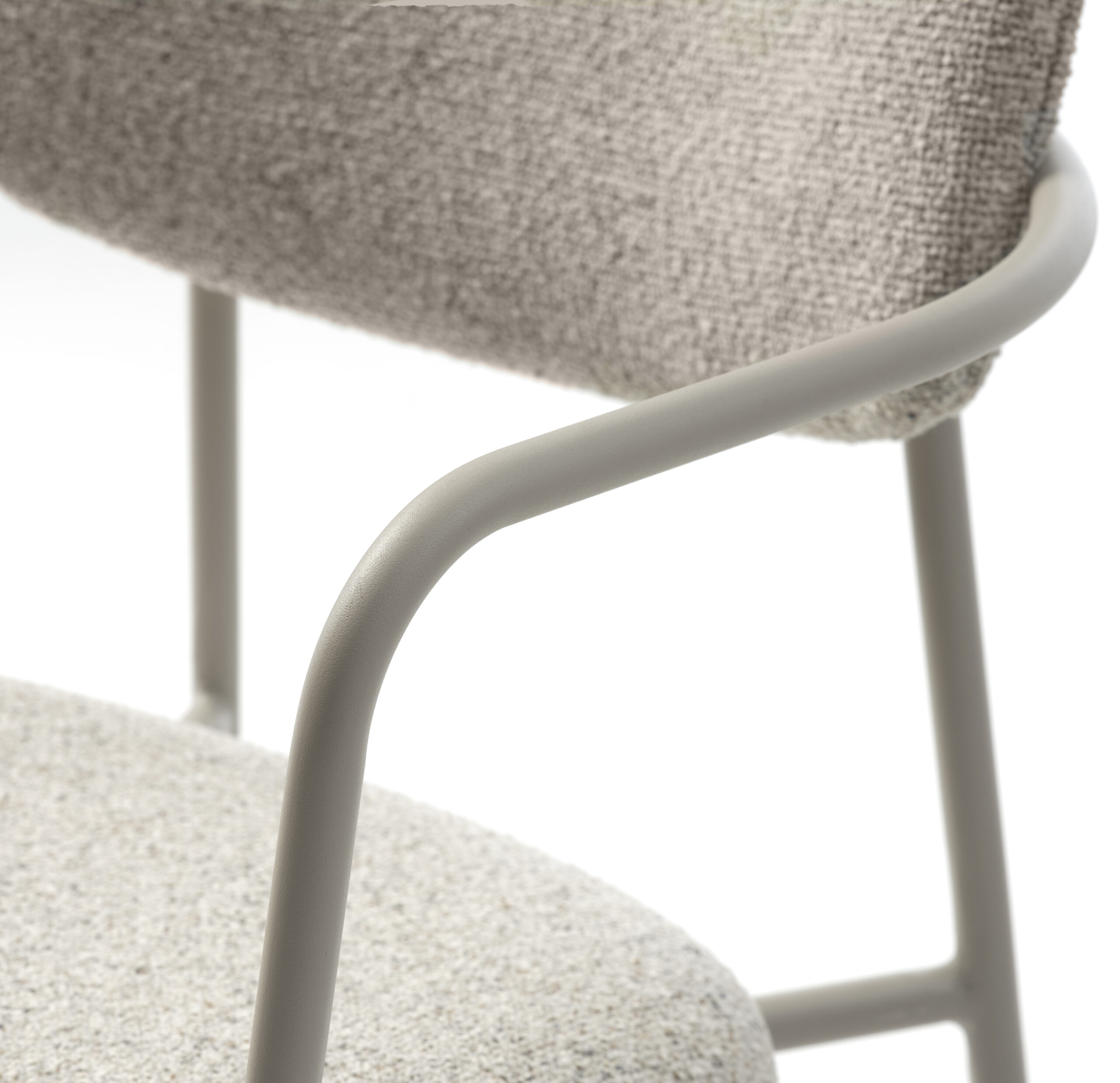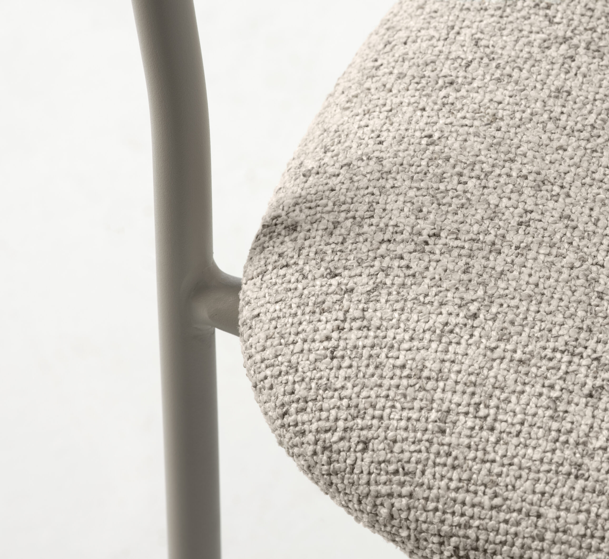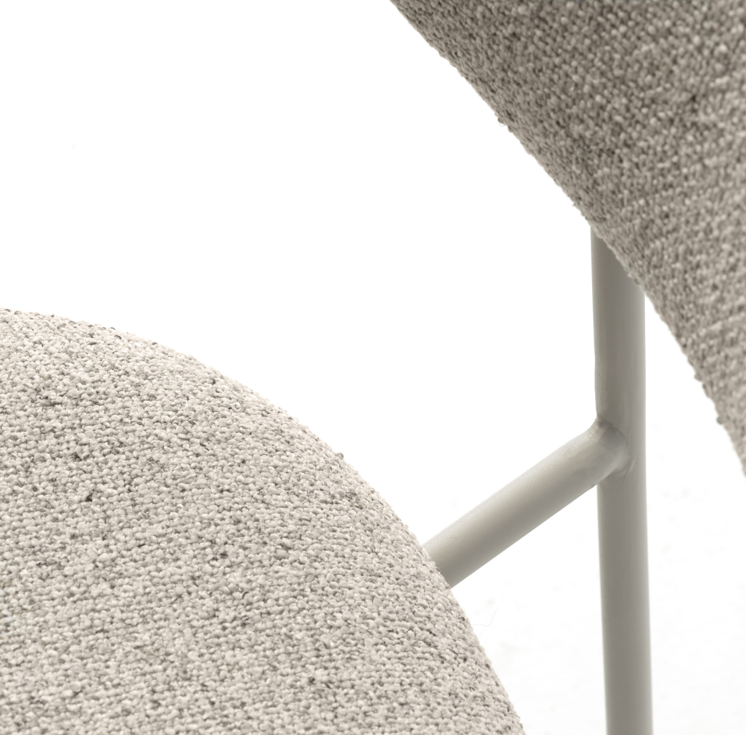 Hevre 22, pilkos, metalinės kojos, SEMI-KD Hevre – dviejų siūlų sudėties audinys. Pūkuoti daugiasruogiai siūlai, sudaryti iš skirtingų spalvų pluoštų, susipynusių su plonesniais siūlais, suteikia buklė efektą. Dėl smulkių audinio kilpelių paviršius švelnus ir atsparesnis tempimui nei įprasta buklė, o harmoningai suderintos spalvos kuria patrauklų vaizdinį įspūdį iš arti.