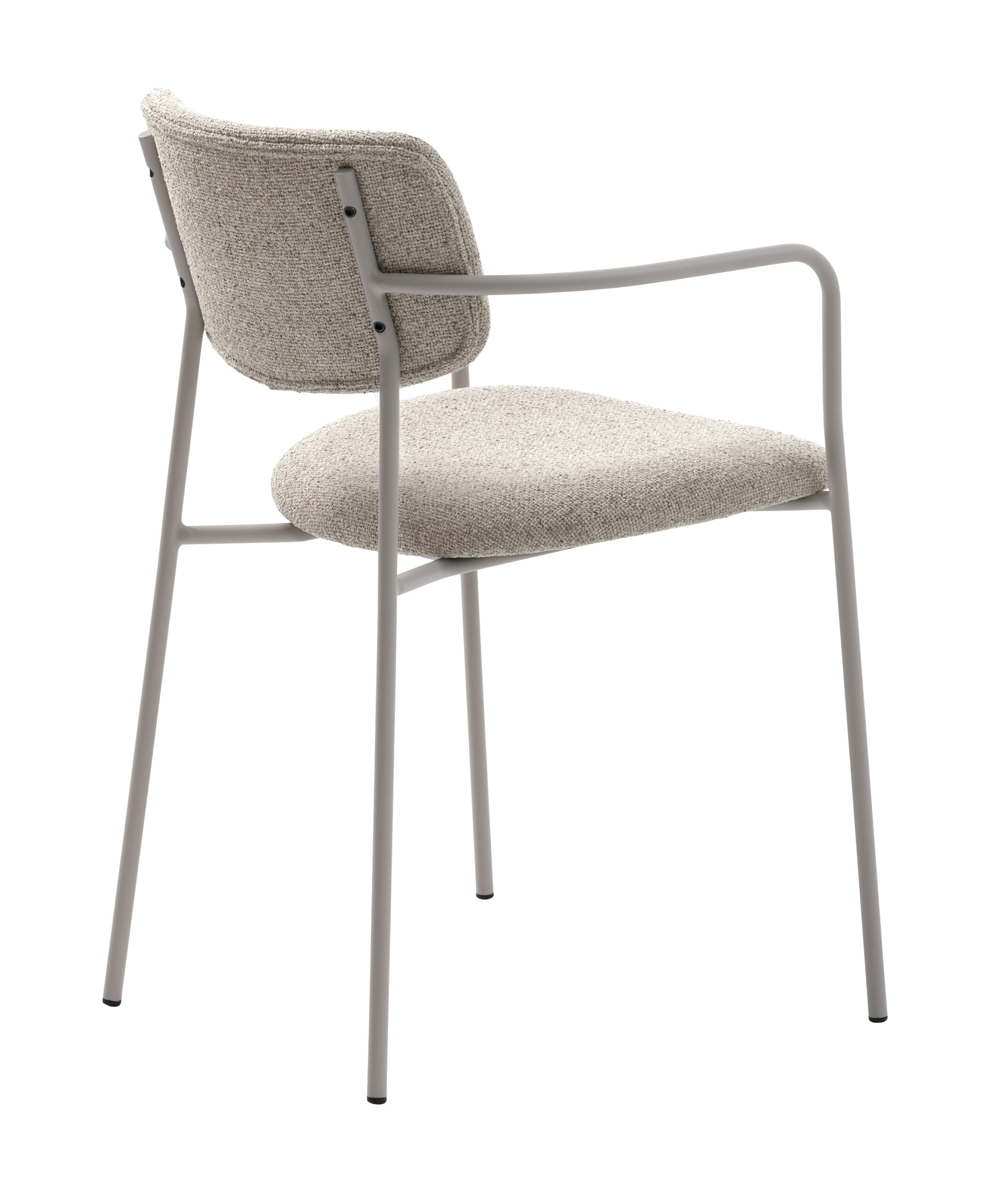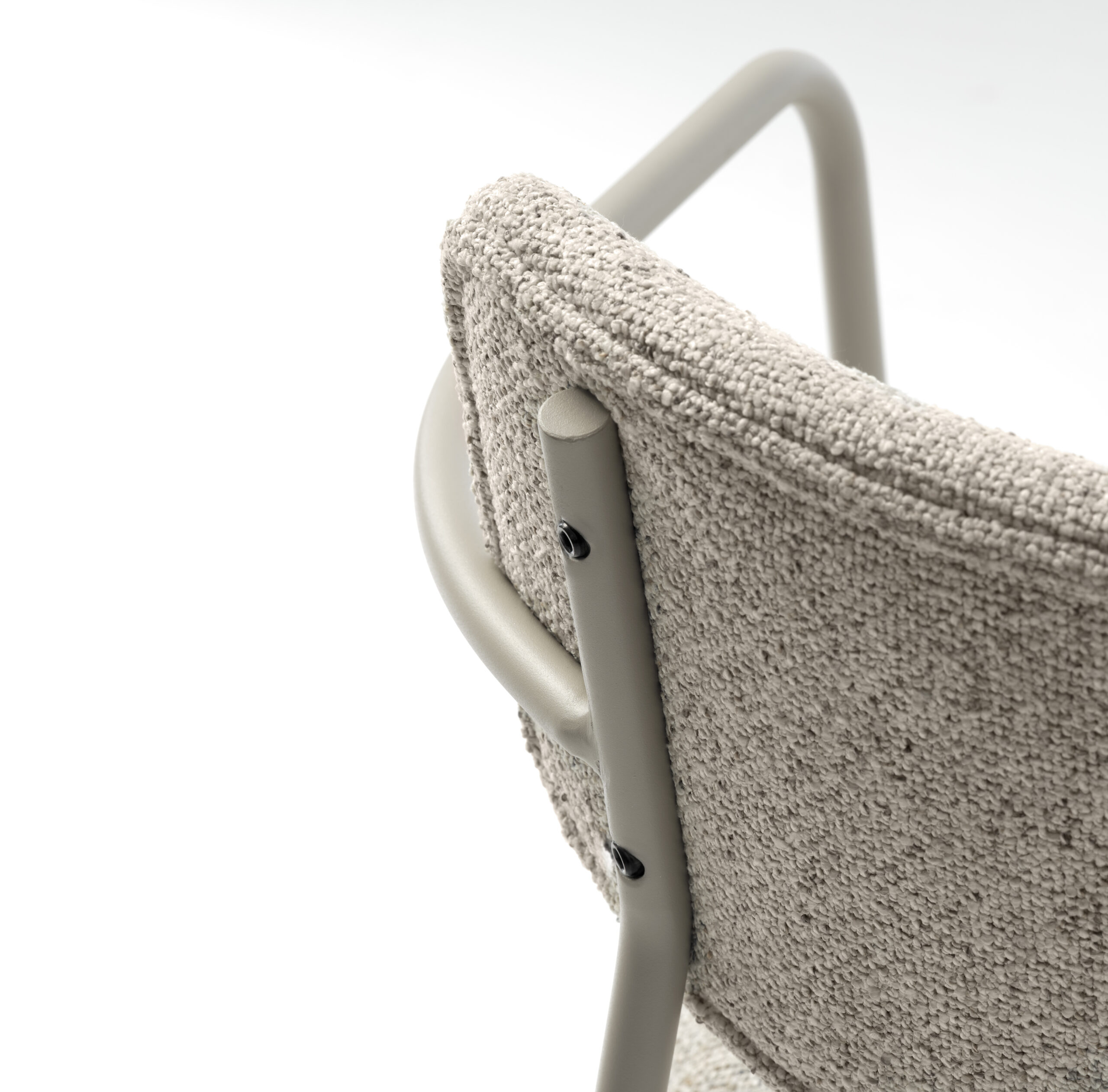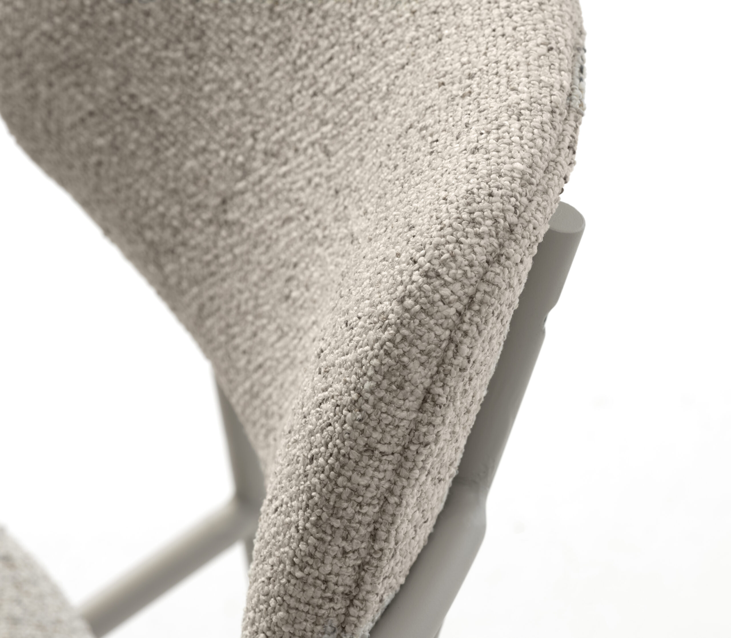 Hevre 22, pilkos, metalinės kojos, SEMI-KD Hevre – dviejų siūlų sudėties audinys. Pūkuoti daugiasruogiai siūlai, sudaryti iš skirtingų spalvų pluoštų, susipynusių su plonesniais siūlais, suteikia buklė efektą. Dėl smulkių audinio kilpelių paviršius švelnus ir atsparesnis tempimui nei įprasta buklė, o harmoningai suderintos spalvos kuria patrauklų vaizdinį įspūdį iš arti.