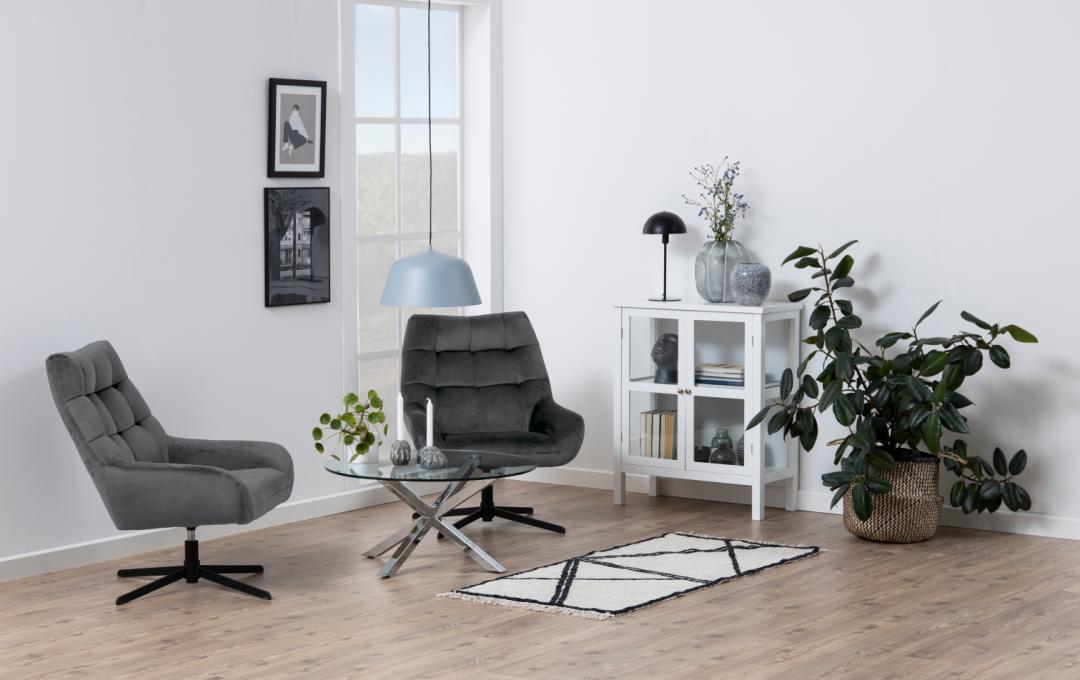 Paris poilsio krėslas, Vic kolekcijos tamsiai pilkos spalvos audinys 28, keturių atšakų pagrindas – juodas matinis šiurkščios faktūros milteliniu būdu dengtas plienas, kvadratiniai dygsniai, pasukimo funkcija, su užtrauktuku, 73 × 76 × 89 cm.