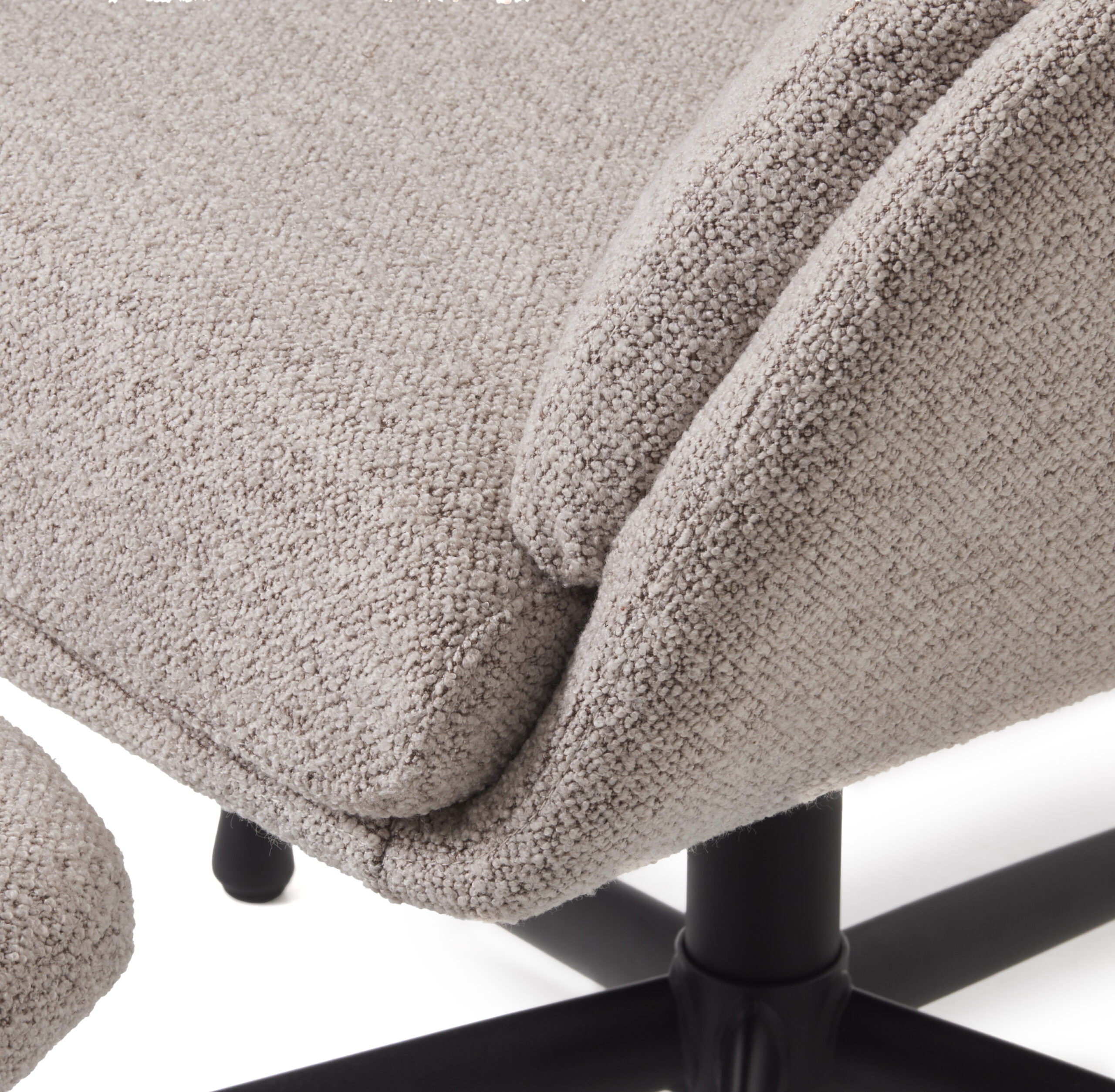 Crush 60, juodas MPG 5 žvaigždučių pagrindas, KD Crush priklauso buklė audinių šeimai – madingas ir puikiai papildantis šiuolaikinius Teddy tipo audinius savo unikaliu, trumpų garbanėlių raštu. Buklė audiniai išsiskiria ryškia tekstūra, suteikiančia baldui išraiškingumo. Jie gaminami supinant du buklės siūlus: vienam suteikiama įtampa, o kitas paliekamas laisvas. Supynus dvigubai susuktus siūlus, laisvasis suformuoja atpažįstamas ir švelnias kilpeles.