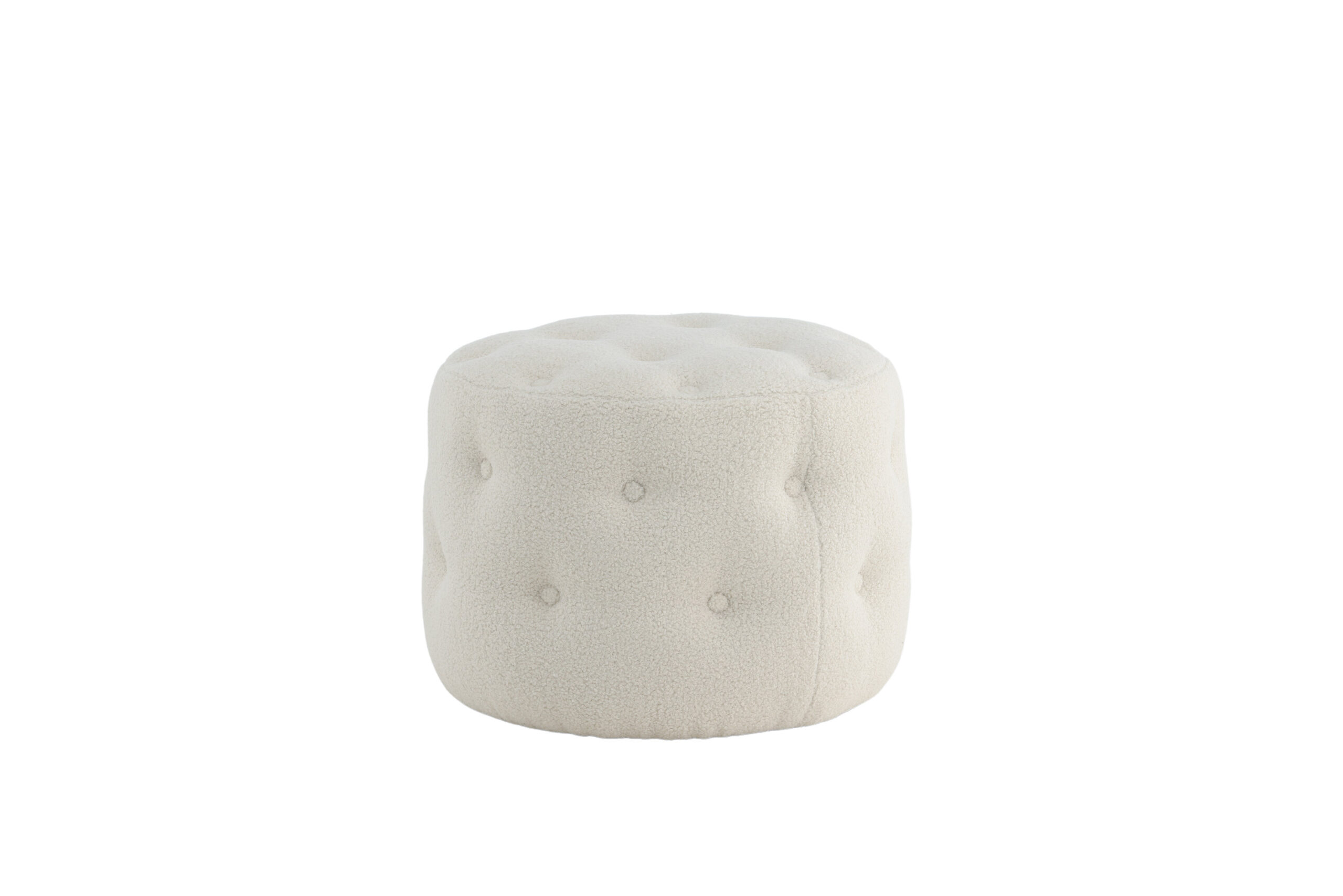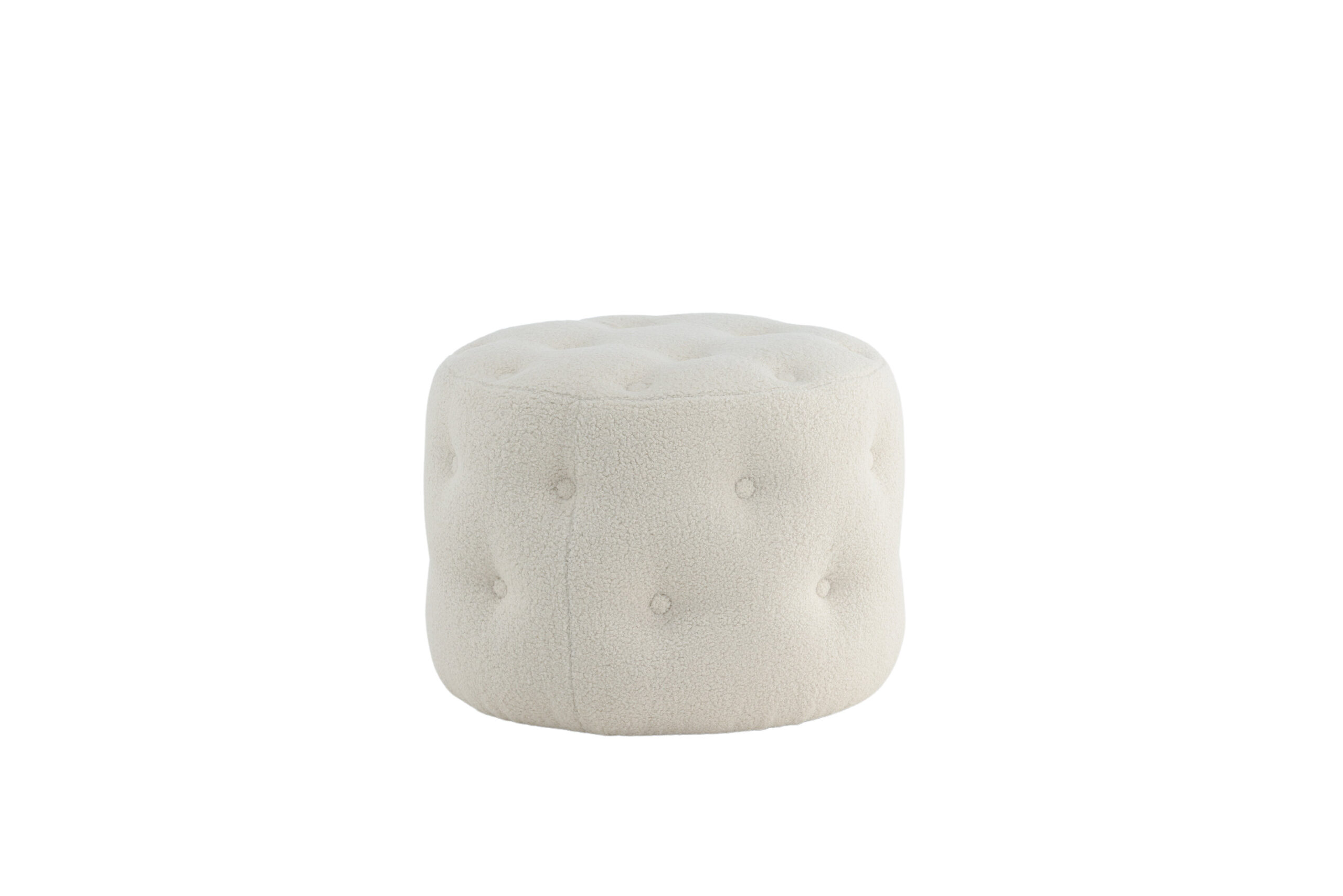 Papuoškite namus išmaniai ir stilingai! Benjamin – cilindro formos daugiafunkcinis sėdimas pufas iš kailinio Teddy audinio, baltos spalvos, su dekoratyviomis giliomis dekoratyvinėmis sagomis, kurios sukuria elegantišką bendrą išvaizdą. Dėl minkštų formų ir storos paminkštintos sėdimosios dalies jis yra itin patogus ir puikiai tinka kaip papildoma vieta, kai svečių daug. Naudokite jį kaip kėdutę kojoms ar pastatykite vieną kaip stiliaus akcentą – pasirinkimas priklauso nuo jūsų! Pagamintas iš putplasčio, medvilnės pluošto, Teddy audinio ir lenktos medienos. Pufas: aukštis 44 cm, skersmuo 55 cm.