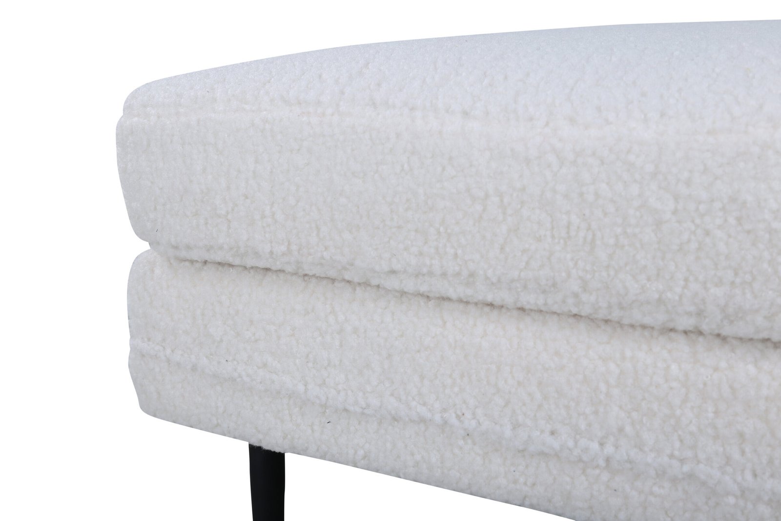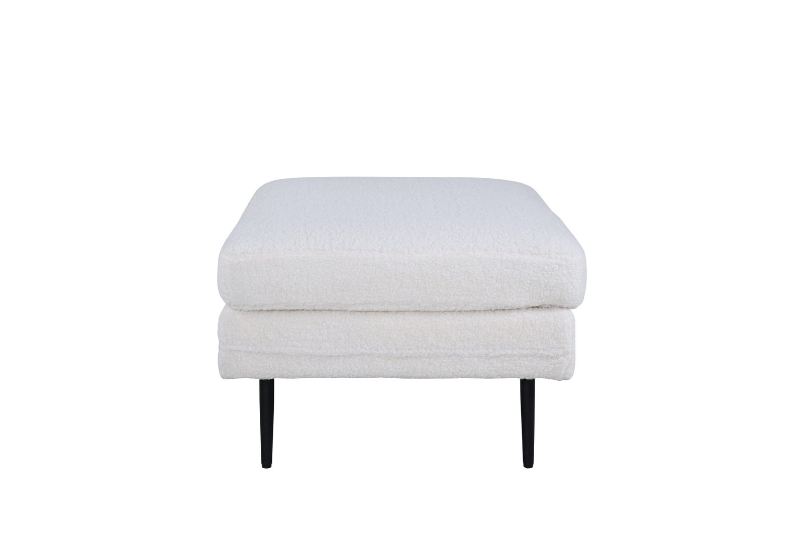Boom serijos pufas žavi savo prabangia išvaizda ir taps gražia interjero detale. Pagamintas iš baltos spalvos Teddy audinio, medžio ir metalo. Juodos milteliniu būdu dengto metalo kojelės suteikia elegancijos ir patalpai suteikia erdvės. Matmenys: ilgis – 85 cm, plotis – 64 cm, aukštis – 47 cm. Derinkite jį su foteliais ar sofa iš tos pačios serijos ir sukurkite harmoningą stilių!