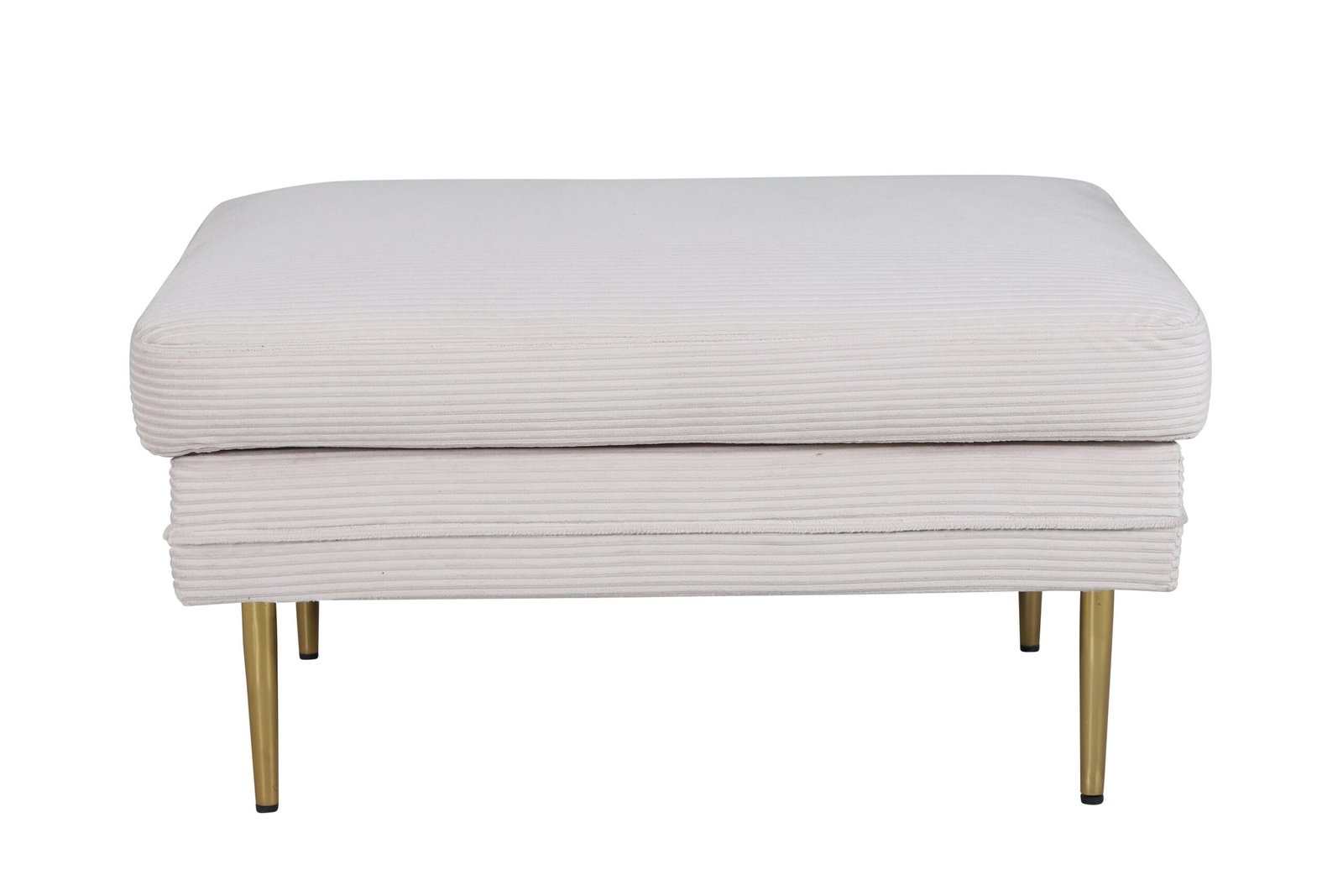 Leiskite šiuolaikiškam dizainui susilieti su šeštojo dešimtmečio nostalgija, pasirinkdami šį madingą Boom kolekcijos velvetinės medžiagos pufą! Šis baldas išsiskiria prabanga ir taps stilinga interjero detale. Pagamintas iš baltos arba smėlio spalvos velveto audinio, medžio ir metalo. Milteliniu būdu dengtos žalvario spalvos metalinės kojelės yra aptakios ir gražiai atrodo interjere. pufo matmenys: ilgis 90 cm, plotis 70 cm, aukštis 49 cm. Jame šiaurietiškas dizainas derinamas su švelniomis formomis – pastatykite vieną, kaip akcentą arba derinkite su tos pačios kolekcijos foteliais ir sofomis!