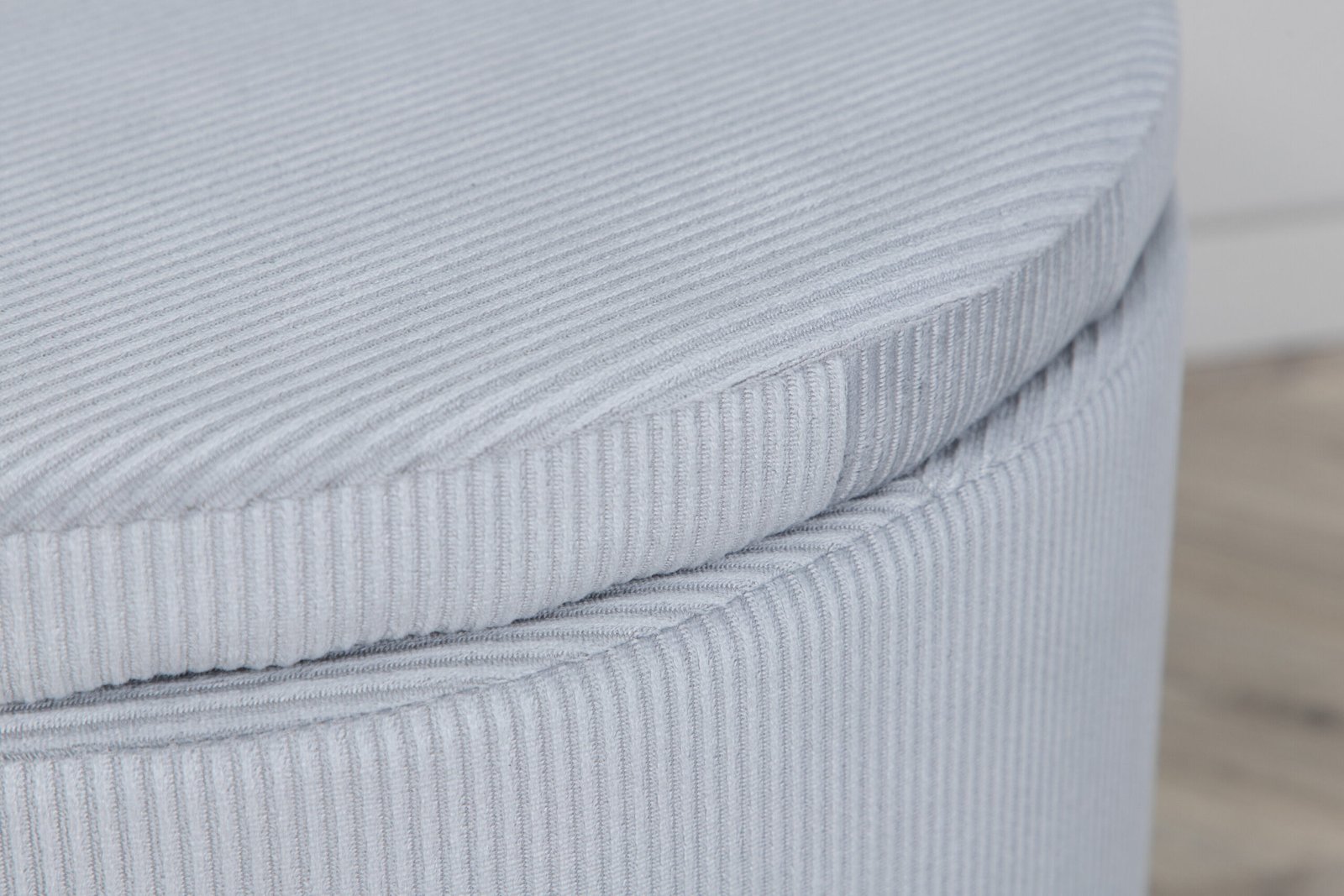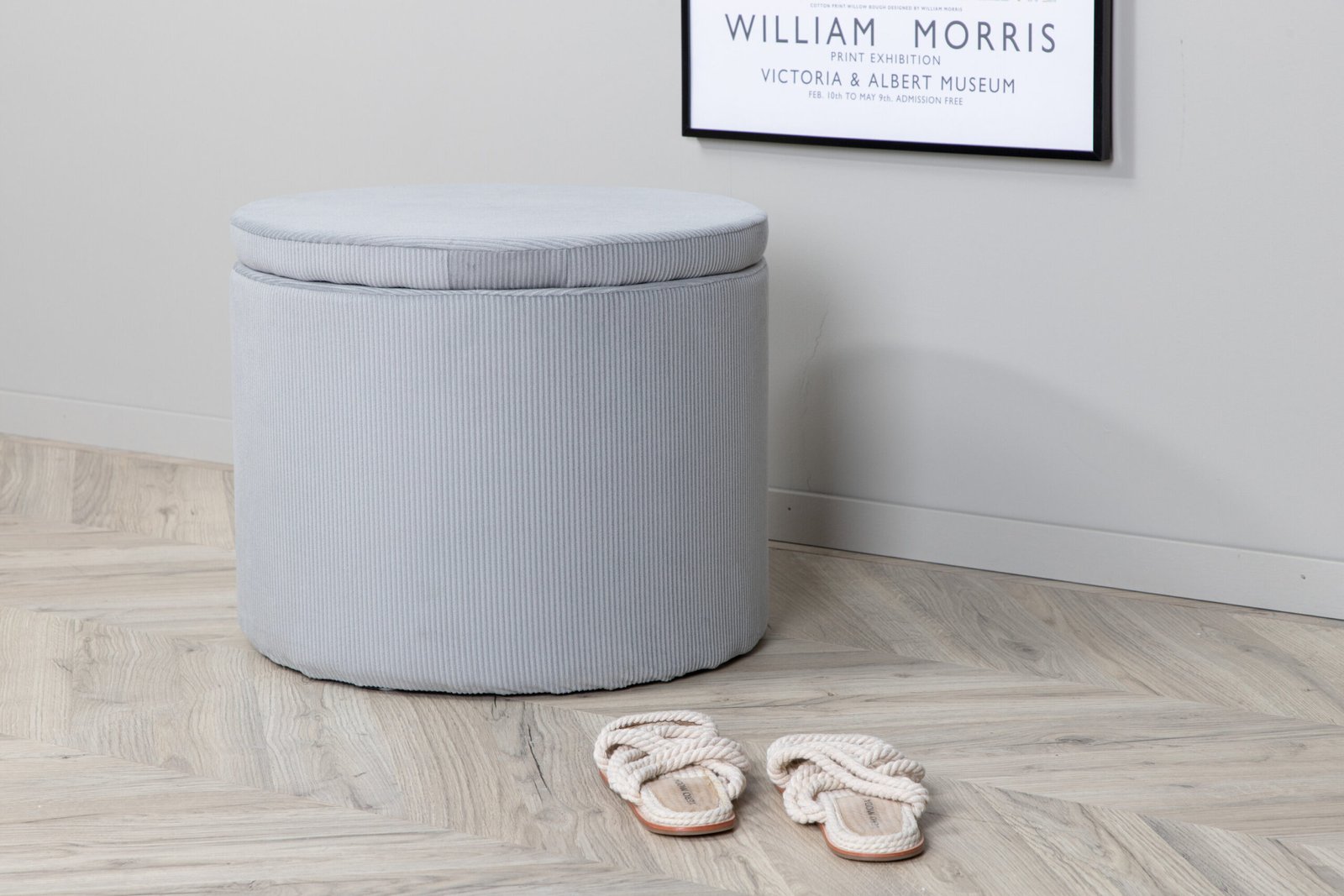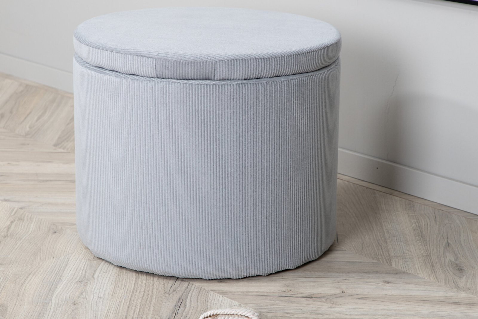 Derinkite modernų dizainą su 50-ųjų nostalgija su šia pilka velveto kėdute! Dunken pufas yra lengvai pritaikomas, praktiškas ir traukiantis akį. Cilindro formos pufas turi nuimamą dangtį, leidžiantį paslėpti daiktus, taip pat puikiai tinka kaip atrama kojoms, paviršius daiktams dėti ar papildoma sėdimoji dalis. Pagaminta iš putplasčio, medvilnės pluošto, audinio ir lenktos medienos. Pufų matmenys: aukštis: 43 cm, skersmuo: 51 cm.
