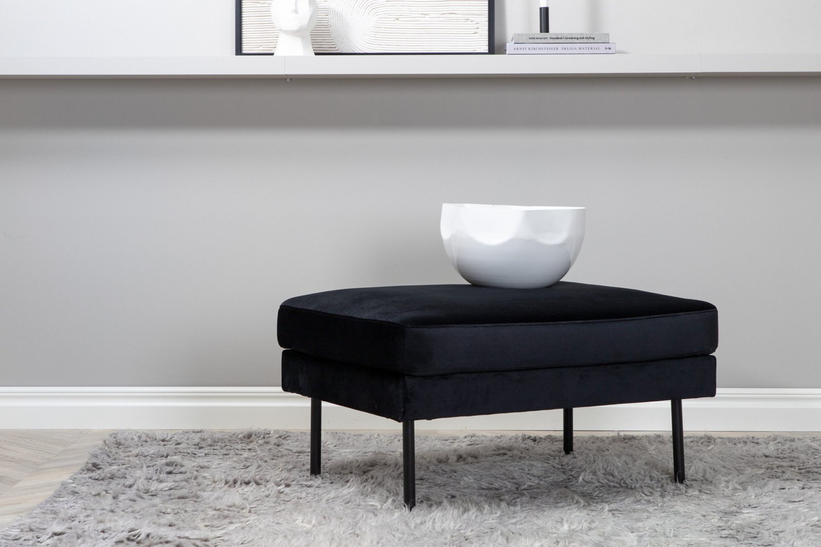 Prabangus, elegantiškas ir nesenstantis – įspūdingas ir žvilgsnius prikaustantis pufas. Čia šiaurietiškas griežtumas puikiai dera su švelniomis formomis. Dėl apgalvoto dizaino jis tampa stiliaus ikona, puikiai atrodys tiek atskirai, tiek derinyje su tos pačios serijos sofų grupe. Pagamintas iš juodo aksominio audinio, rėmas iš medžio ir metalo. Stilingos, siauros juodo metalo kojelės suteikia praktišką aukštį. Patobulinkite savo interjerą su šiuo daugiafunkciu baldu! Pufo matmenys: plotis 64 cm, gylis 85 cm, aukštis 47 cm.