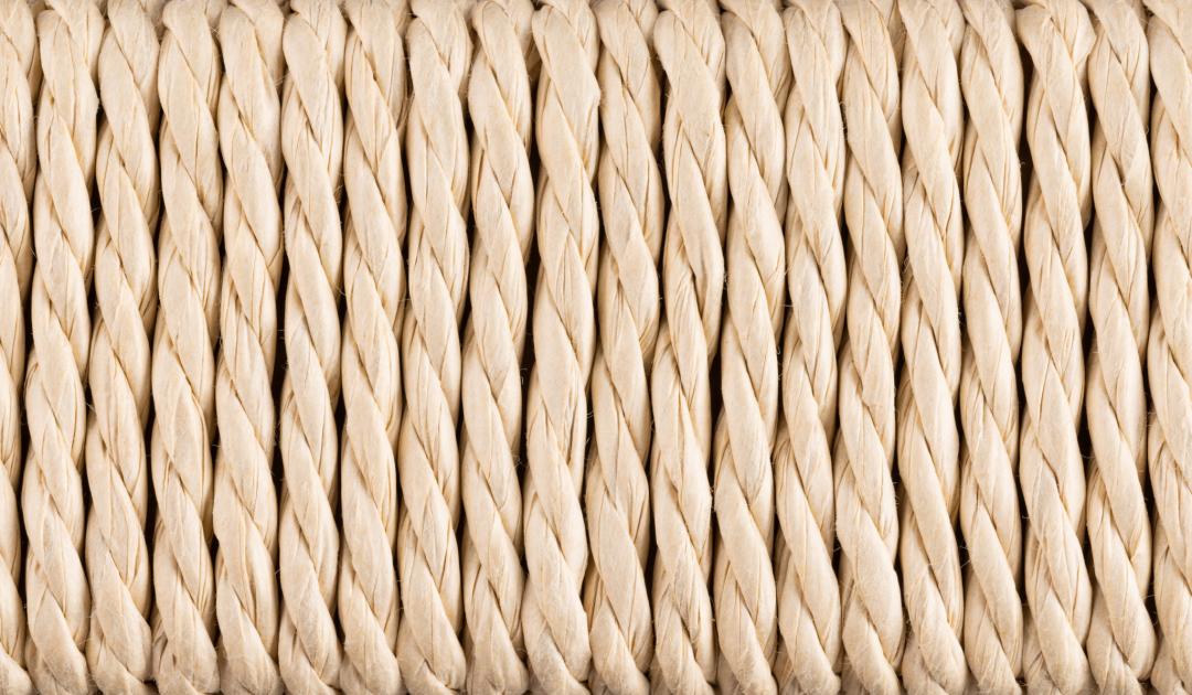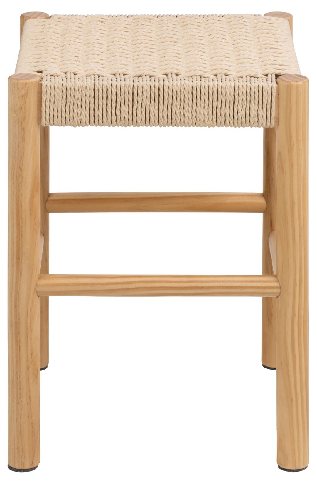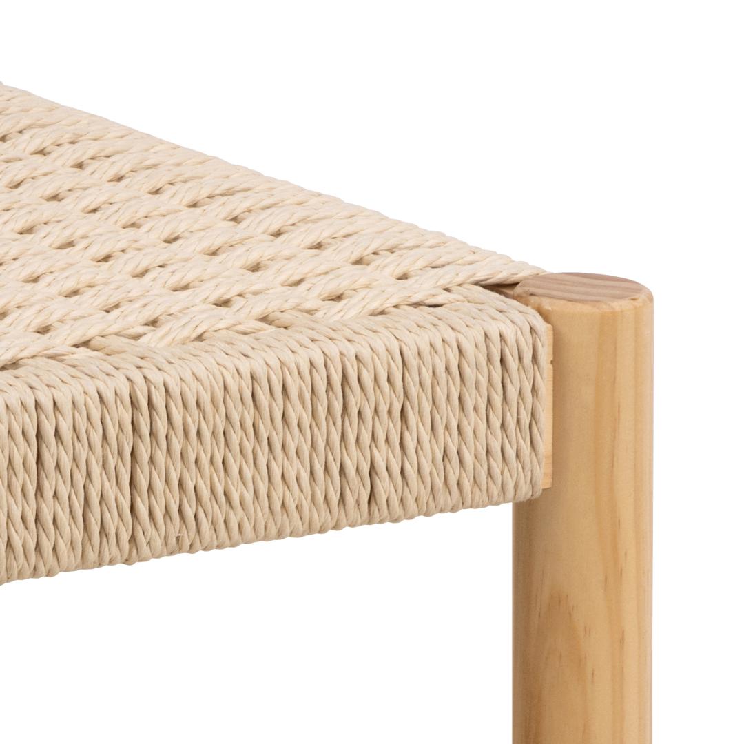 Alvin taburetė, kreminės spalvos pintos popierinės virvelės, pagrindas – NC lakuota pušis su pynimo raštu; 35 × 35 × 45 cm.