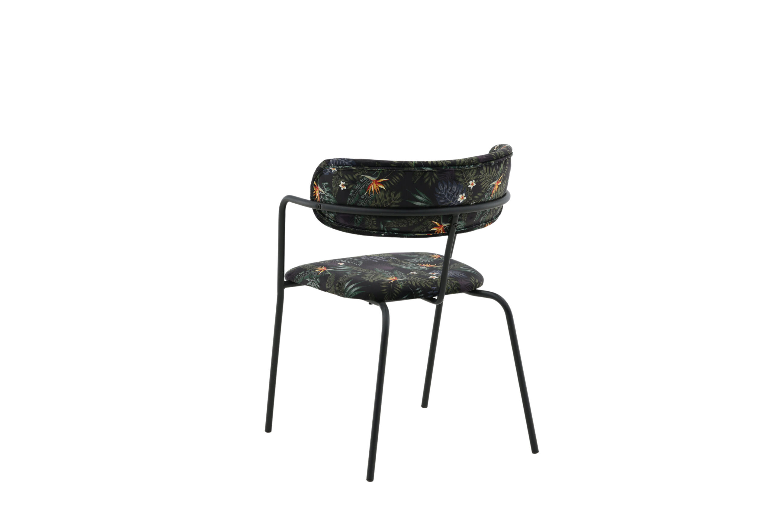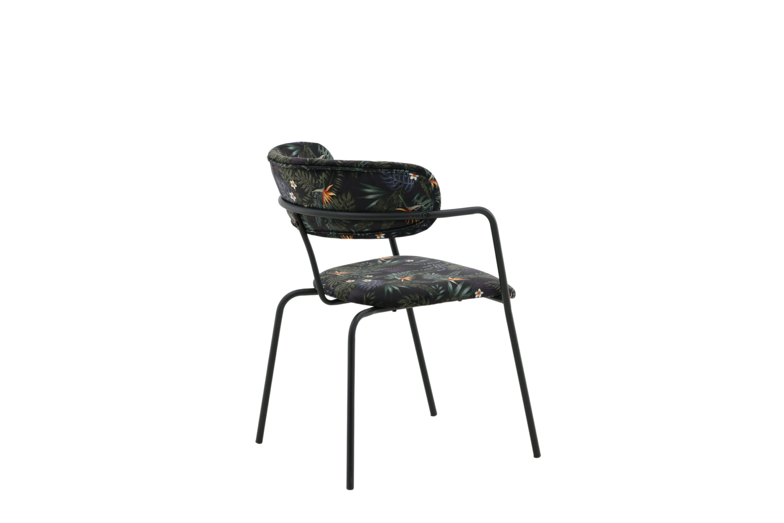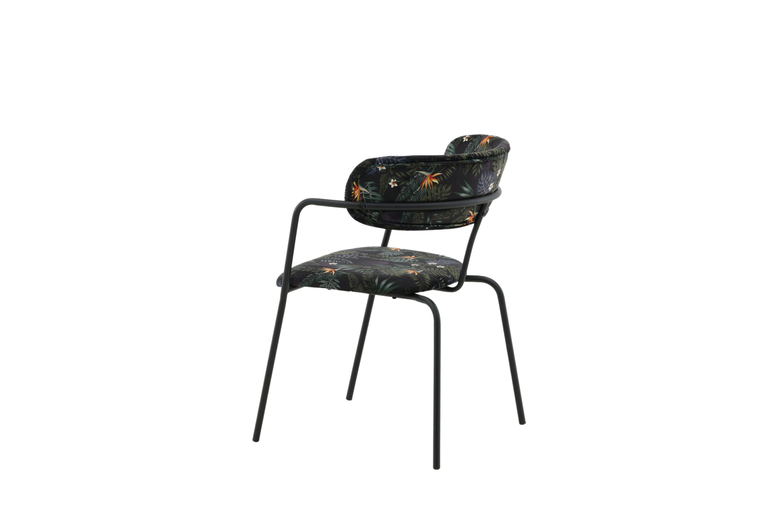 Fotelis su juodu milteliniu būdu dengtu metaliniu rėmu, kojomis ir integruotais porankiais. Suapvalintas atlošas ir sėdimoji dalis iš juodos spalvos gėlių raštais dekoruoto poliesterio audinio su paminkštinimu. Sukurkite išskirtinį dėmesio centrą su įvairiaspalvėmis valgomojo kėdėmis iš kolekcijos Arrow! Atlošo ir sėdimosios dalies, kurie apmušti juodu gėlių raštuotu poliesterio audiniu dėka, sukuriamas individualų interjero vaizdas. Nesudėtingai surenkama.