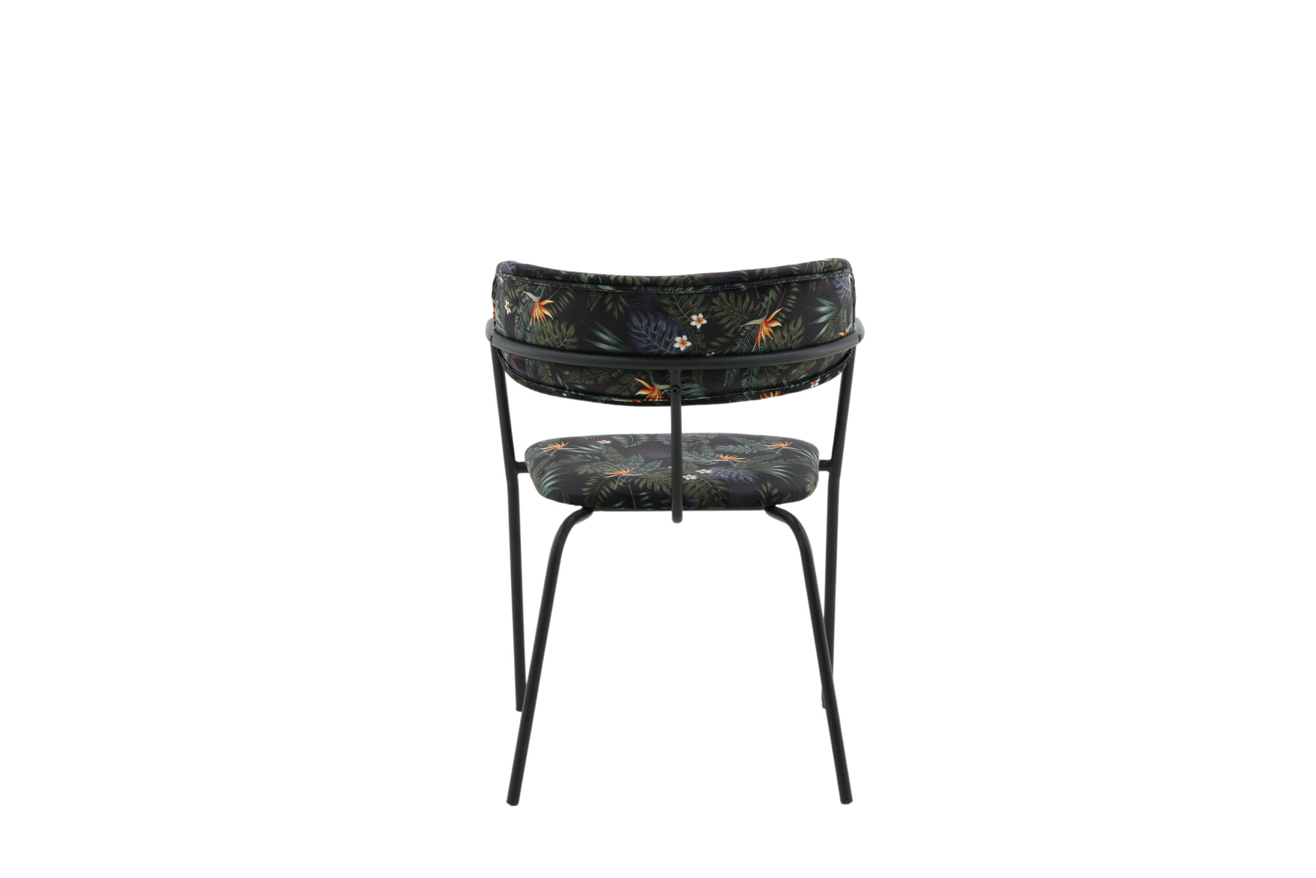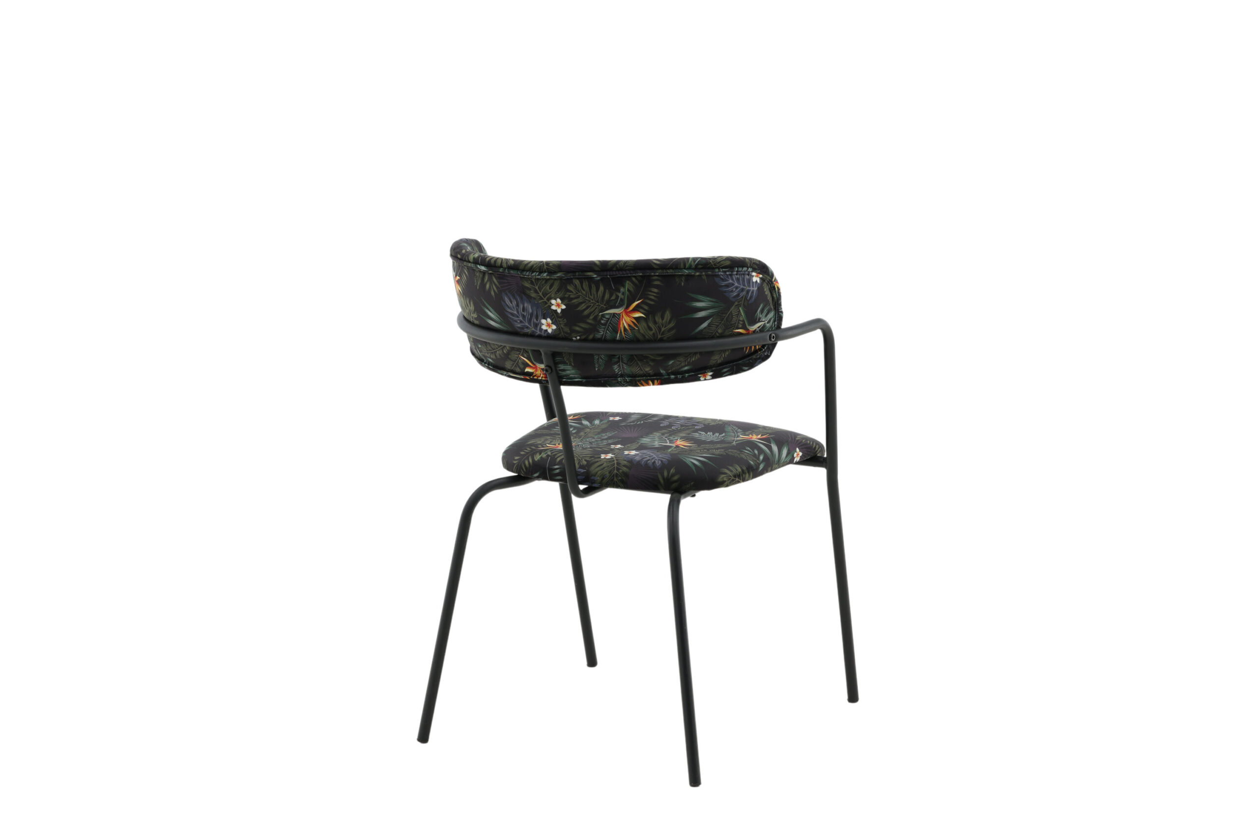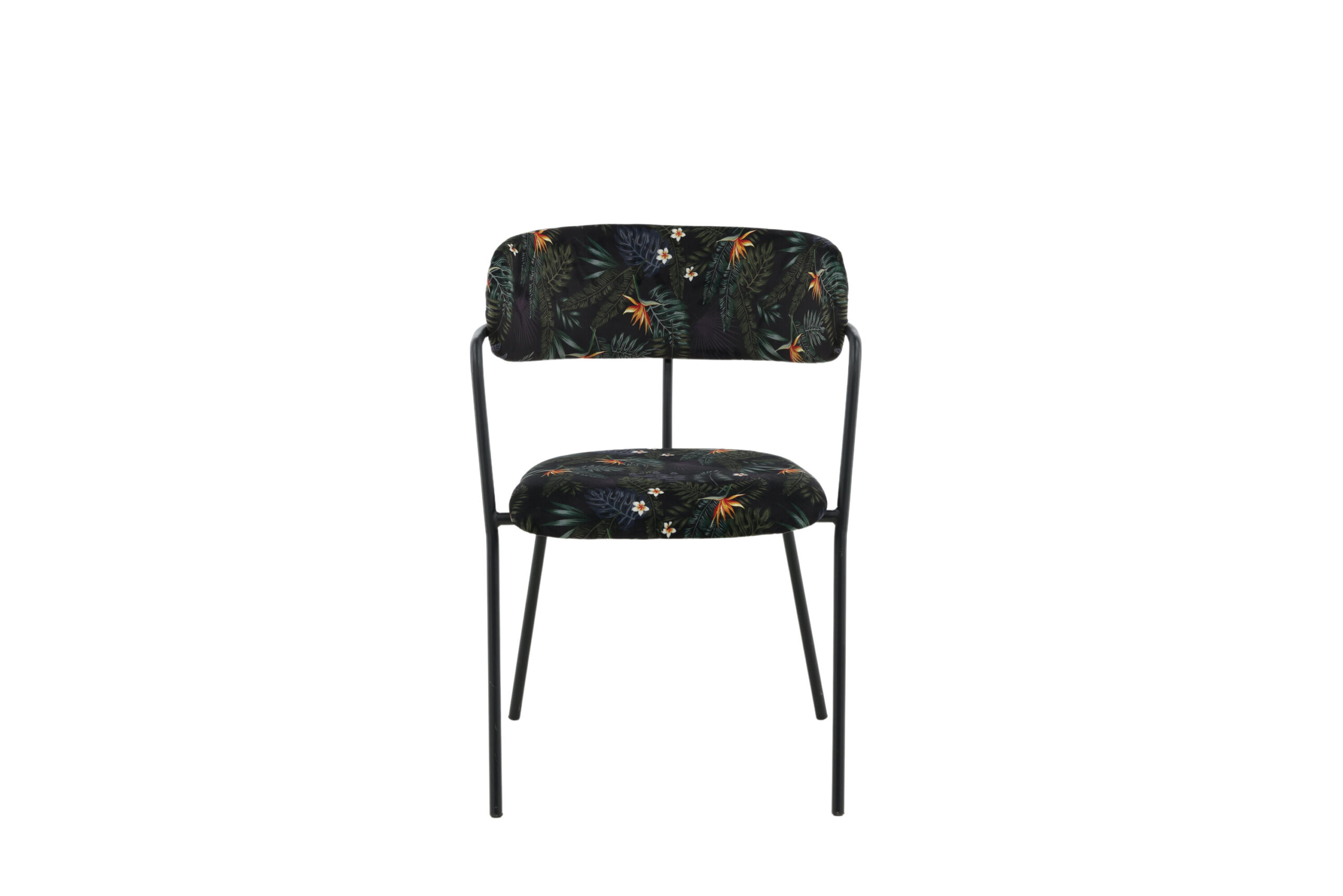 Fotelis su juodu milteliniu būdu dengtu metaliniu rėmu, kojomis ir integruotais porankiais. Suapvalintas atlošas ir sėdimoji dalis iš juodos spalvos gėlių raštais dekoruoto poliesterio audinio su paminkštinimu. Sukurkite išskirtinį dėmesio centrą su įvairiaspalvėmis valgomojo kėdėmis iš kolekcijos Arrow! Atlošo ir sėdimosios dalies, kurie apmušti juodu gėlių raštuotu poliesterio audiniu dėka, sukuriamas individualų interjero vaizdas. Nesudėtingai surenkama.