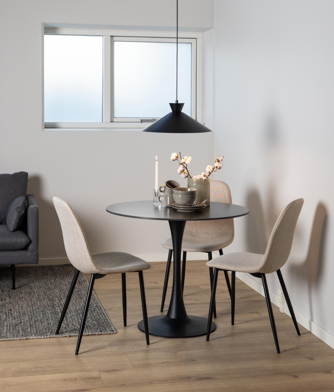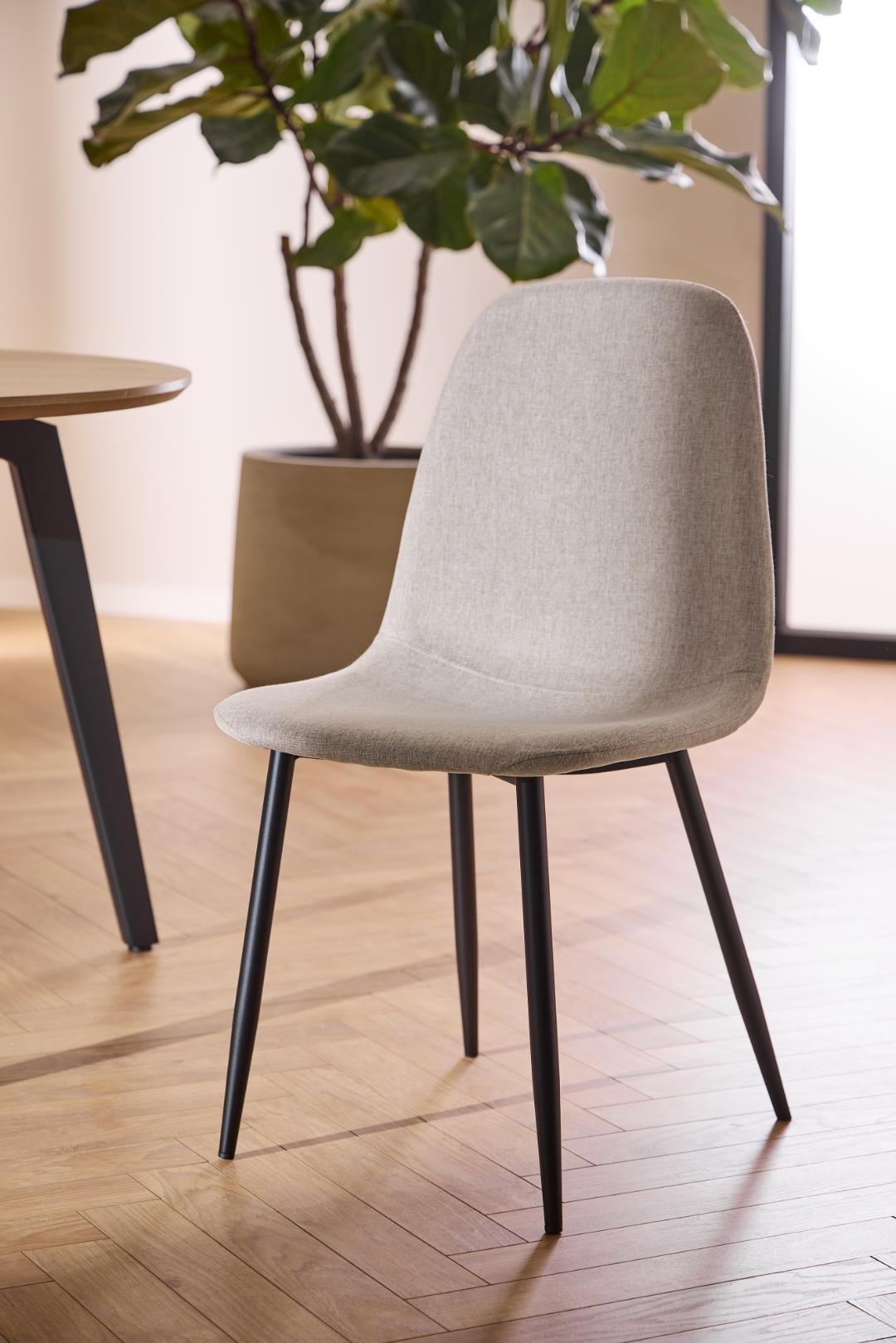 Celia valgomojo kėdė, Nesia kolekcijos smėlio spalvos audinys 2, plieninės kojos, dengtos juoda matine šiurkščios faktūros milteline danga, su horizontaliais dygsniais.