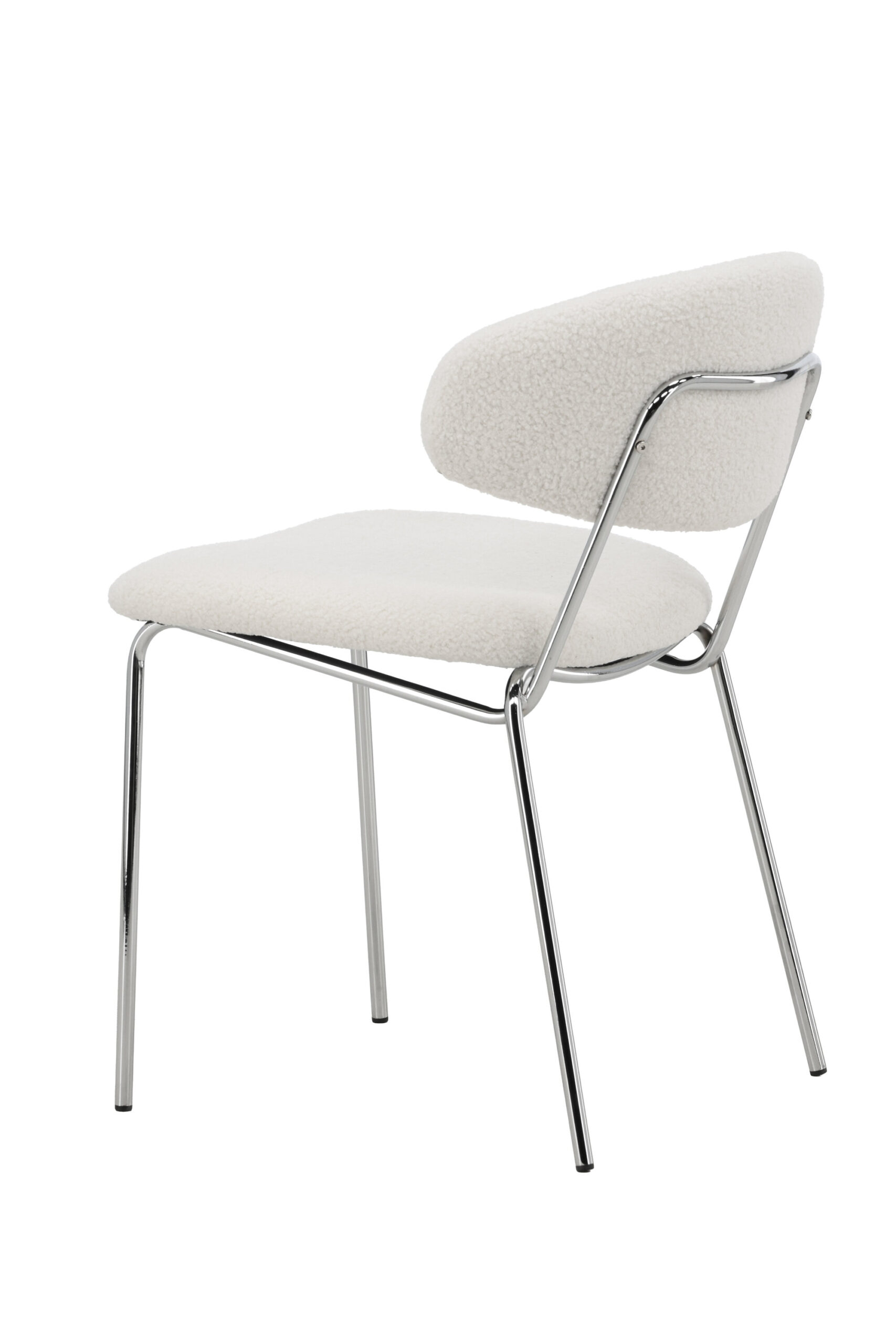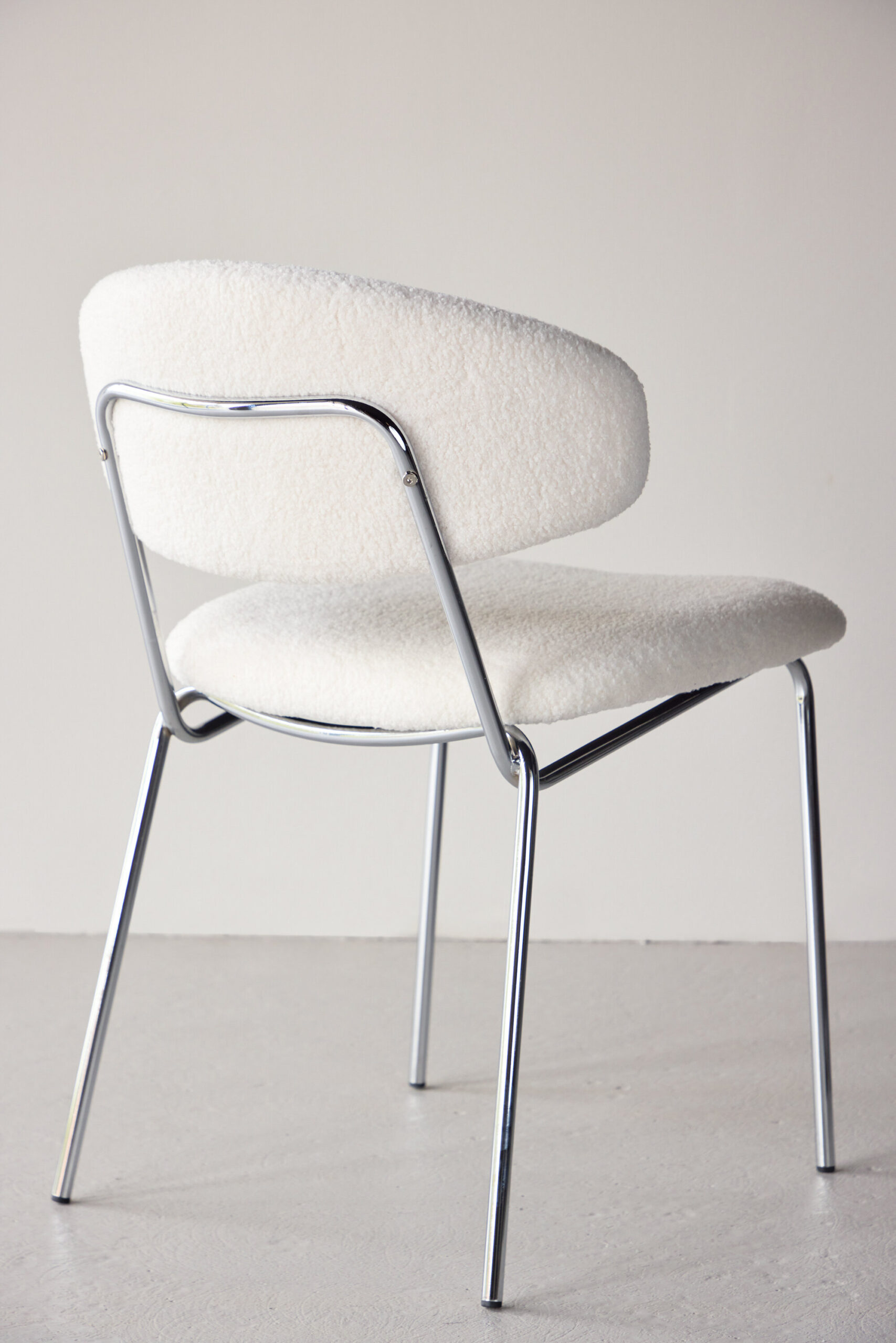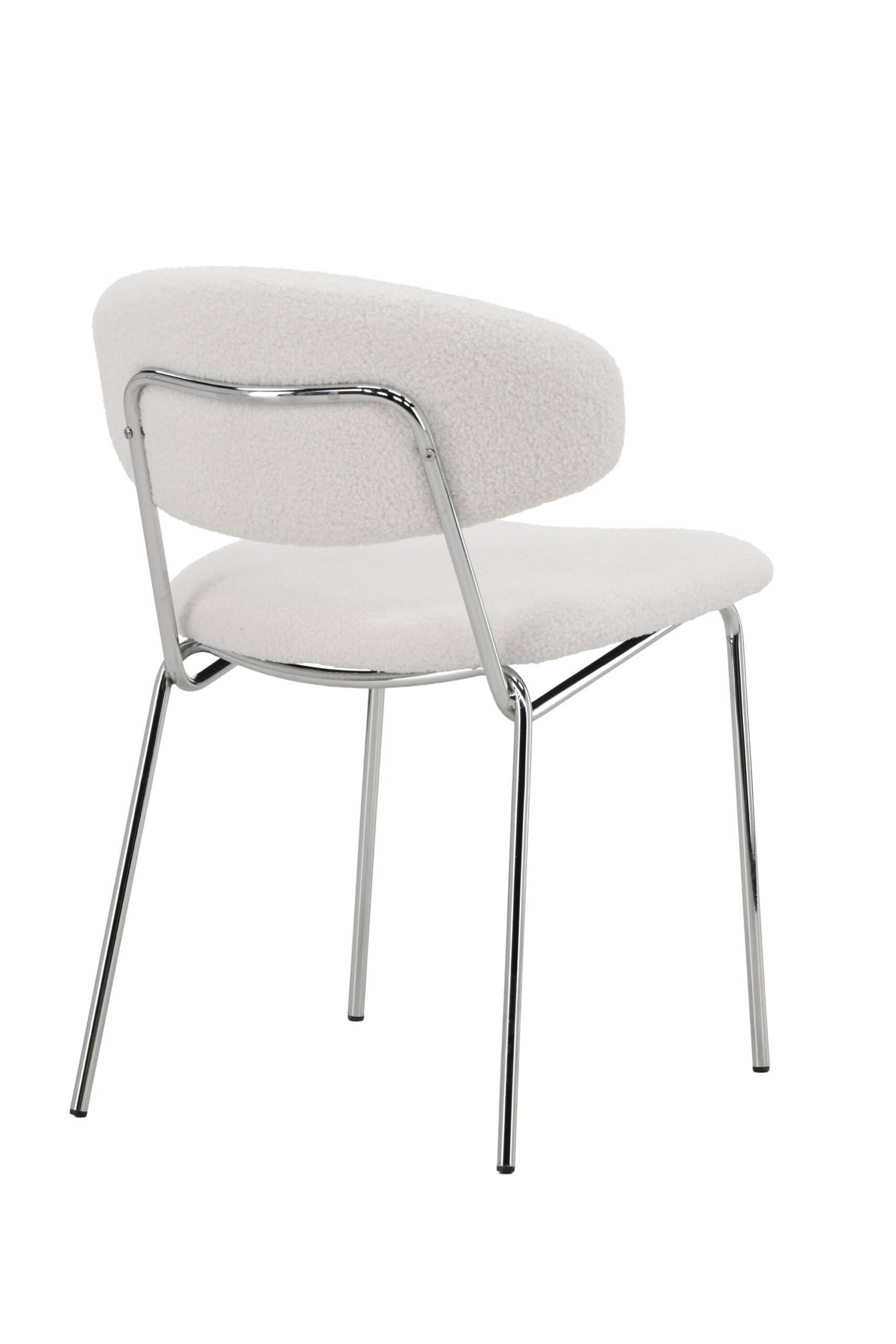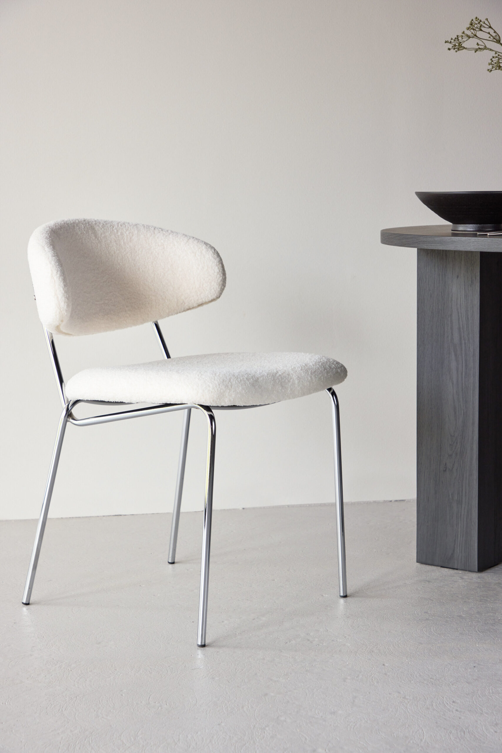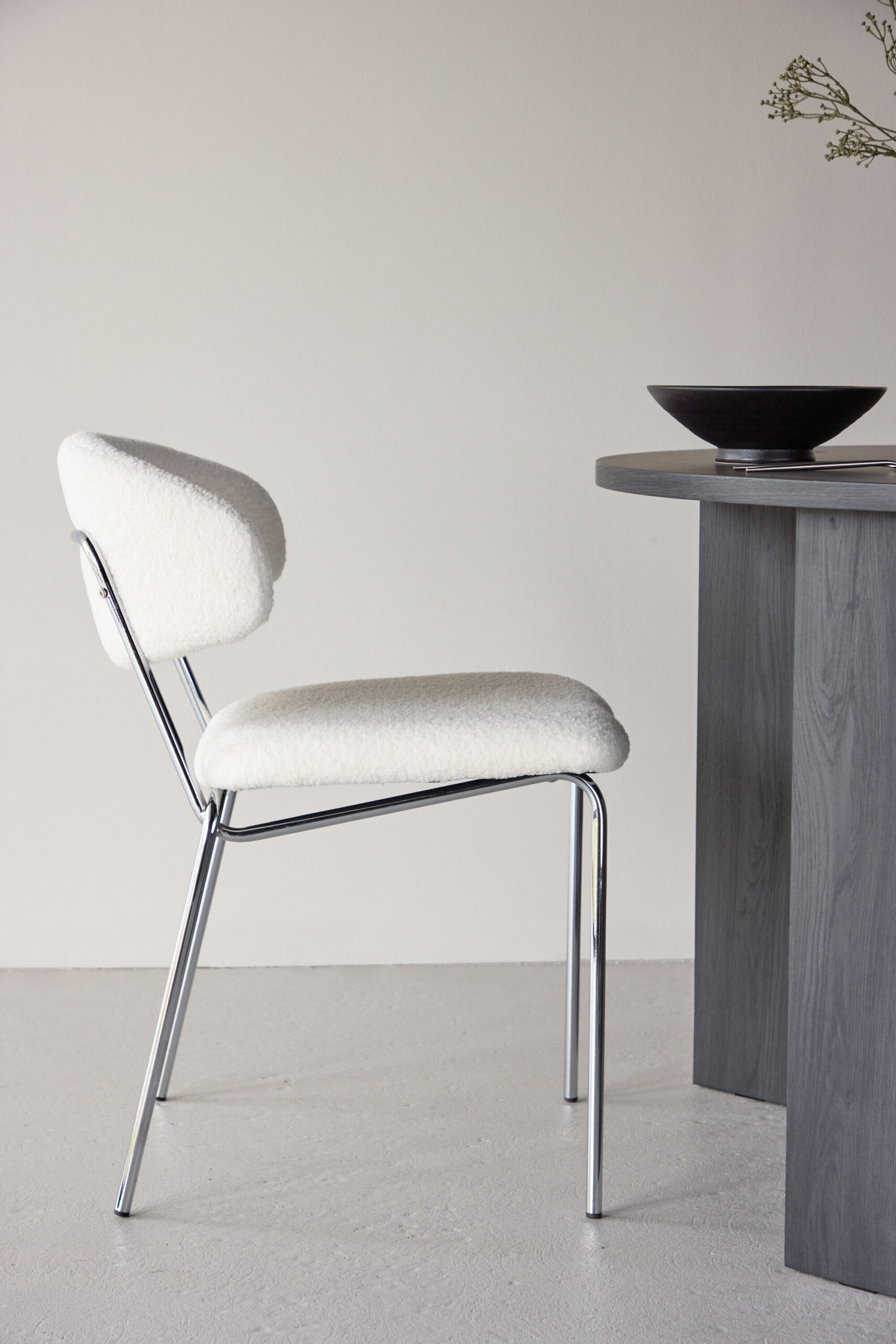 Chico – moderni valgomojo kėdė, kurioje išgrynintas dizainas dera su išskirtiniu patogumu. Sėdimoji dalis ir atlošas aptraukti balta buklė Audinys, kuri suteikia minkštą ir patrauklų pojūtį, kartu įnešdama tekstūros ir charakterio į erdvę. Chromuoto plieno kojelės sukuria elegantišką kontrastą ir pabrėžia lengvą bei grakštų siluetą.