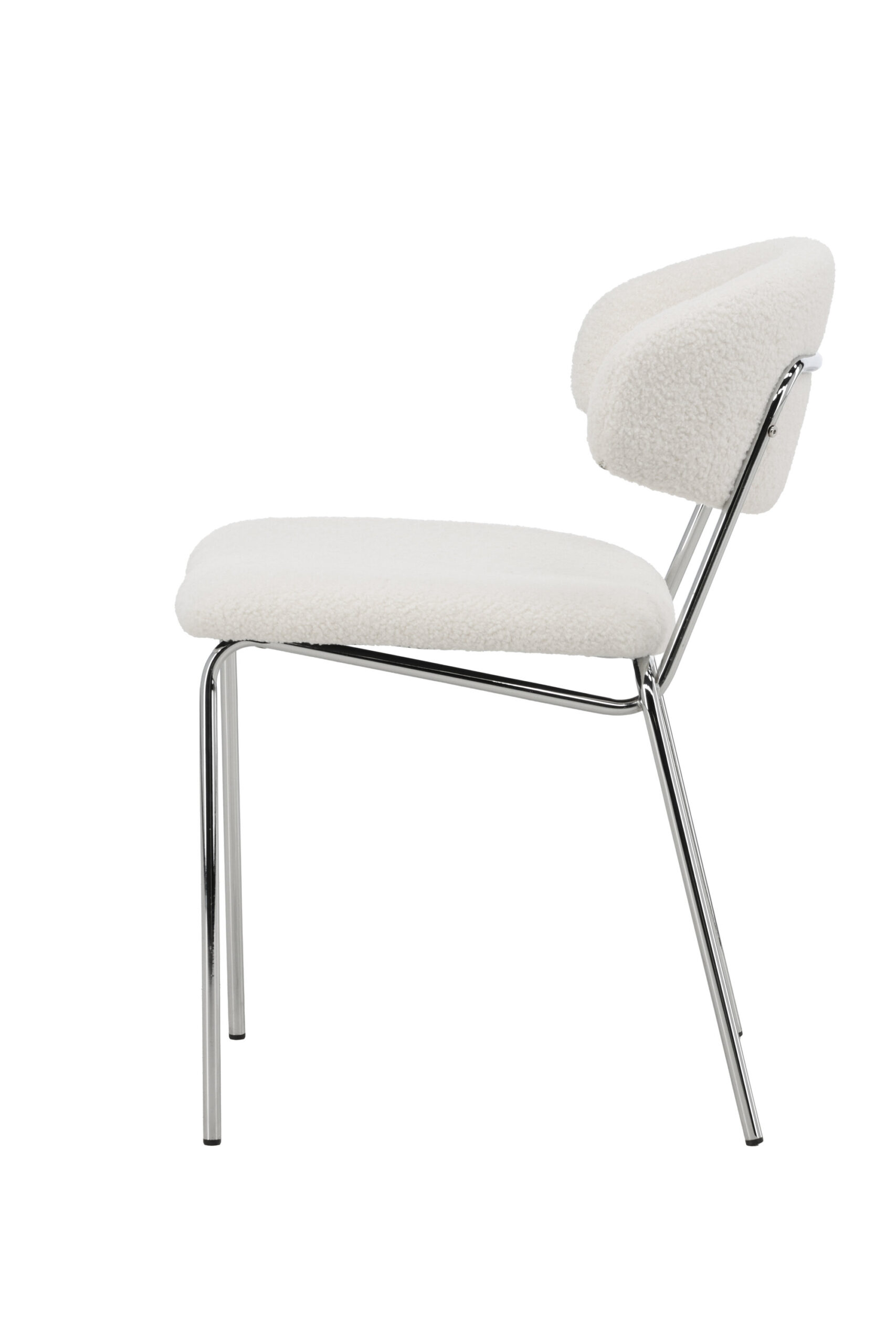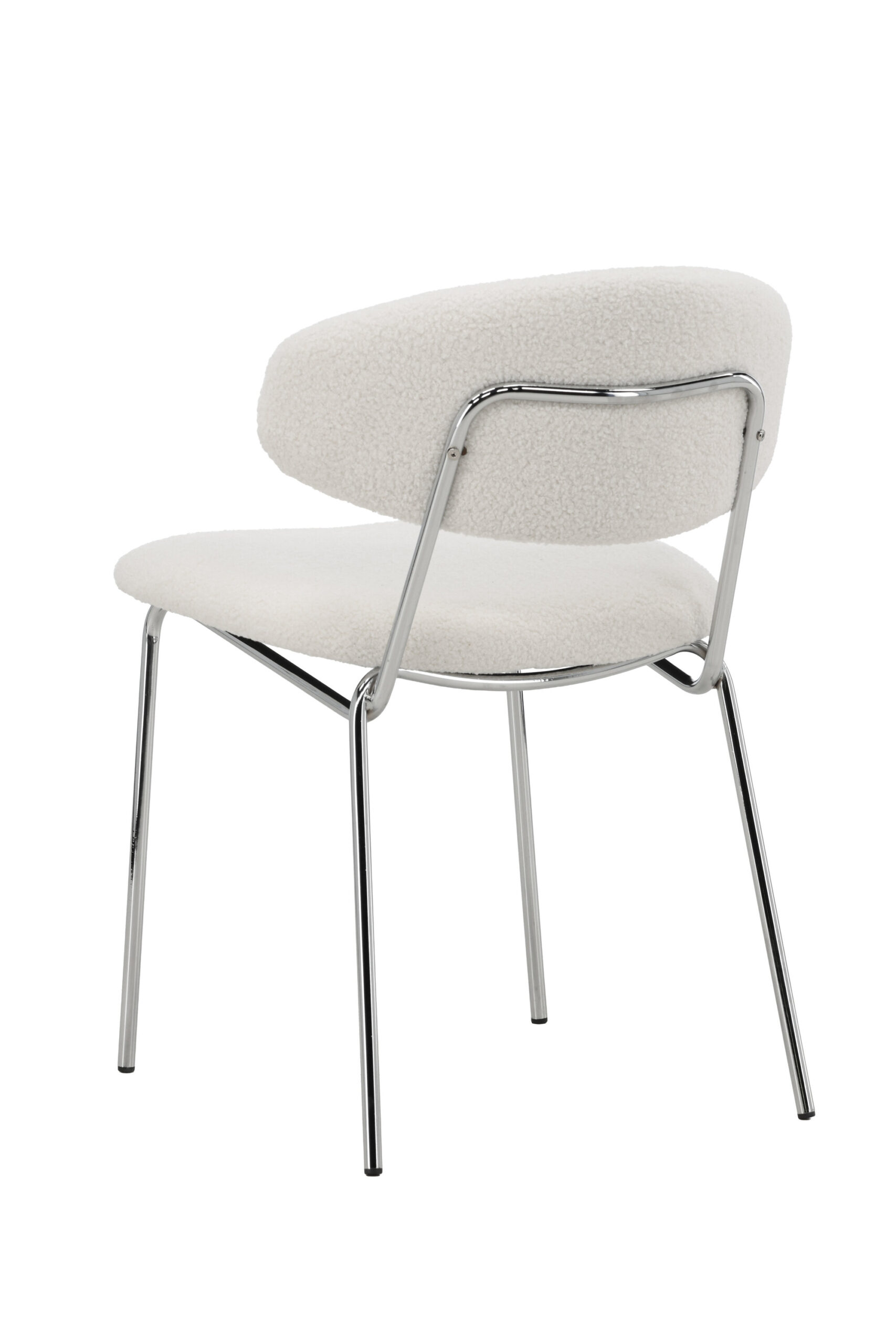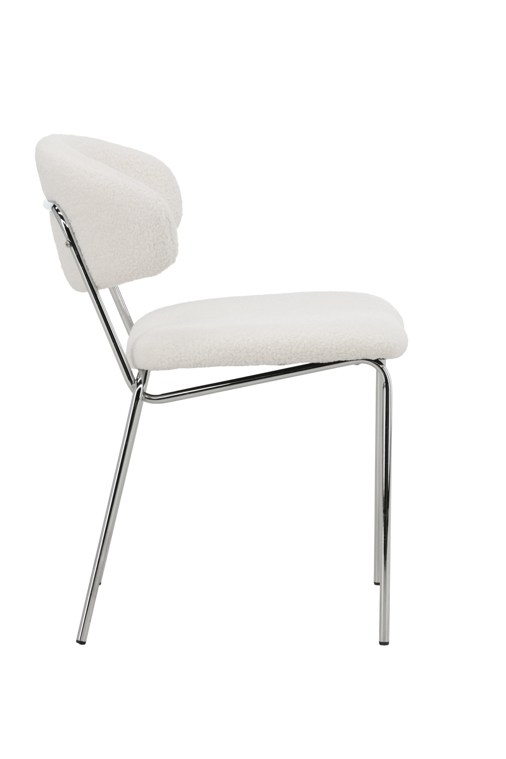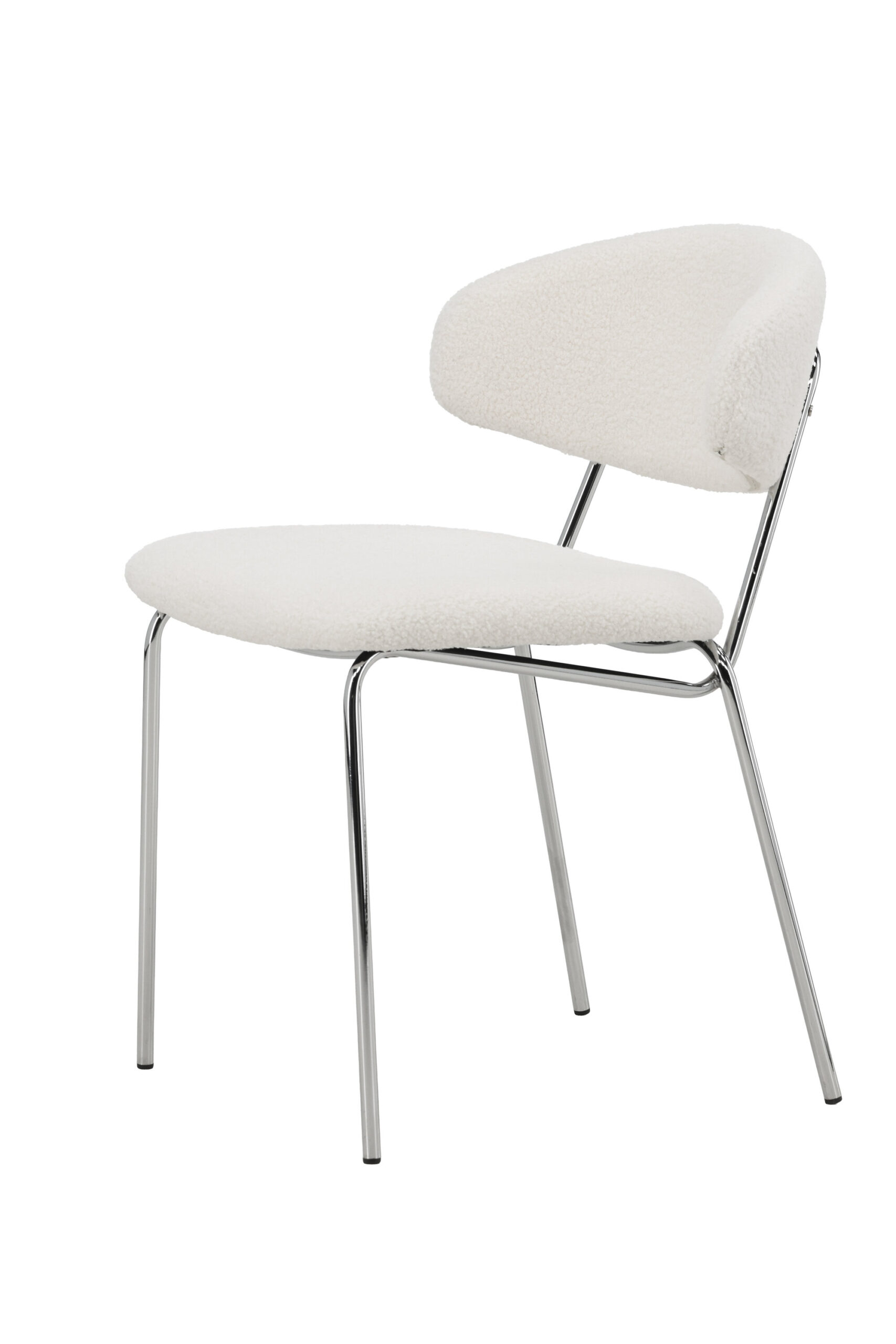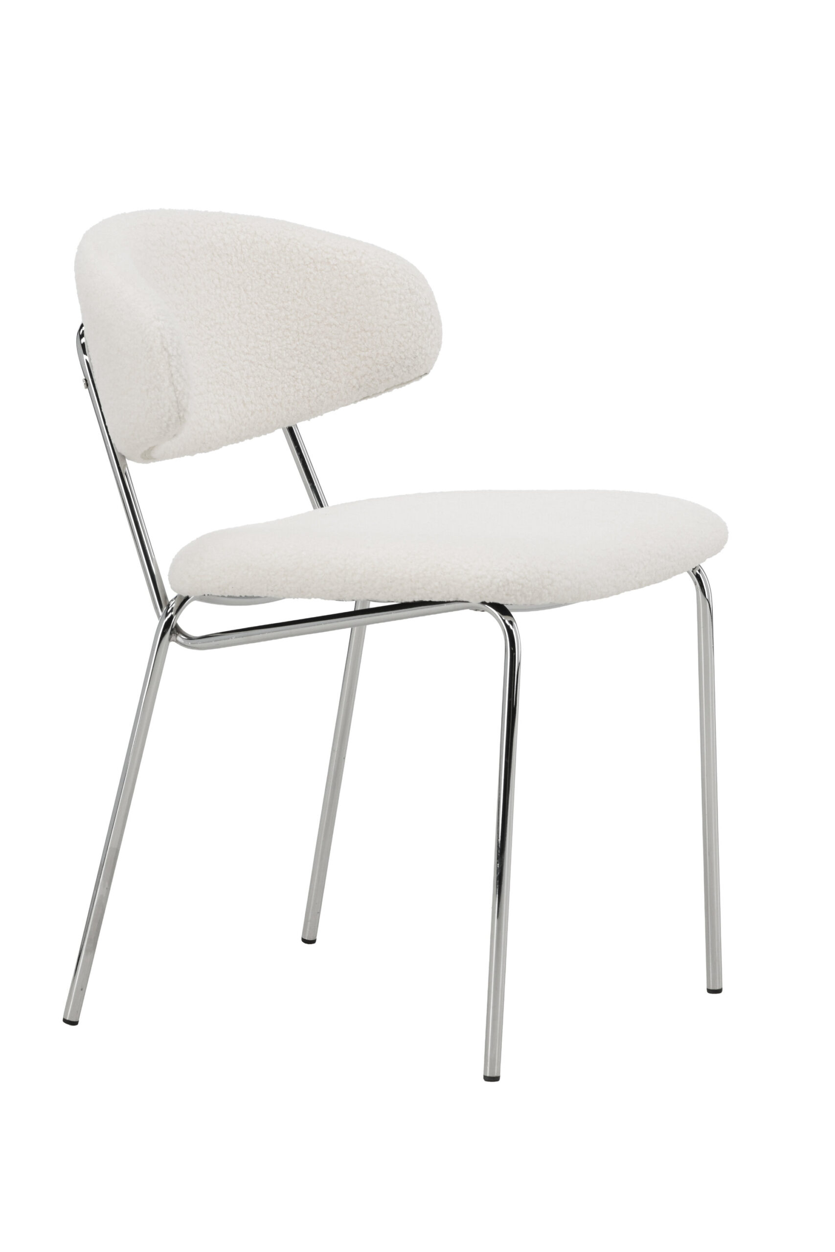 Chico – moderni valgomojo kėdė, kurioje išgrynintas dizainas dera su išskirtiniu patogumu. Sėdimoji dalis ir atlošas aptraukti balta buklė Audinys, kuri suteikia minkštą ir patrauklų pojūtį, kartu įnešdama tekstūros ir charakterio į erdvę. Chromuoto plieno kojelės sukuria elegantišką kontrastą ir pabrėžia lengvą bei grakštų siluetą.