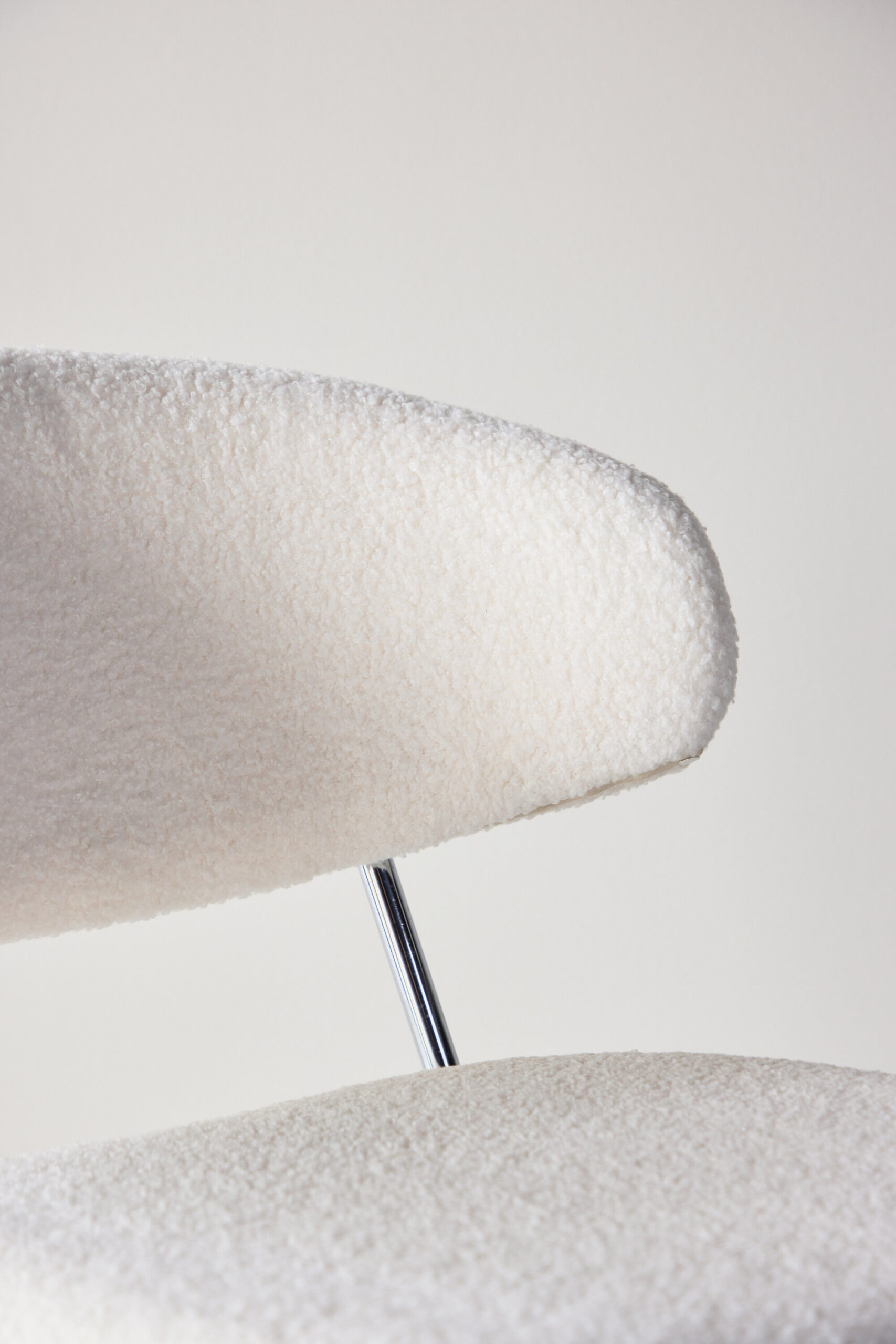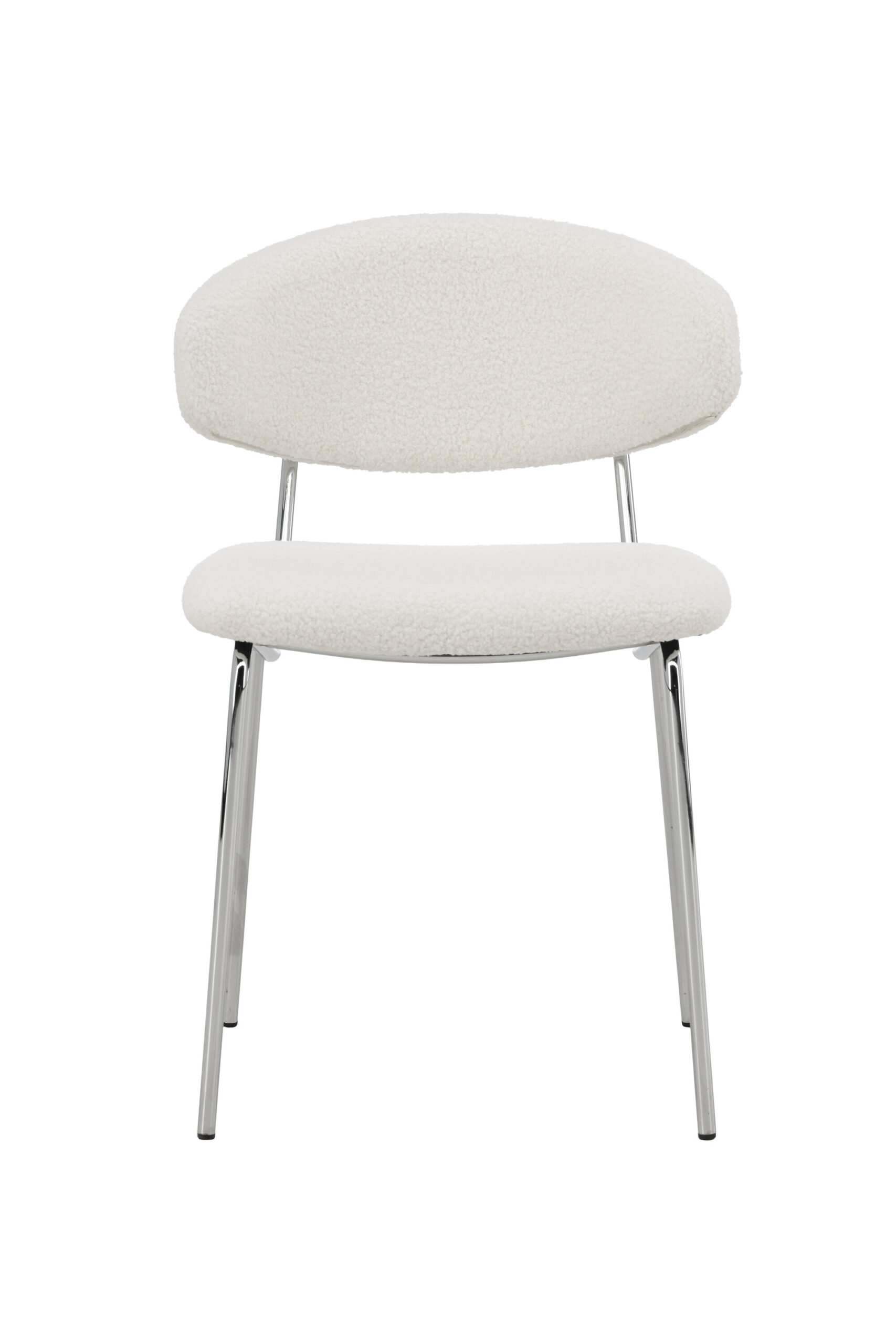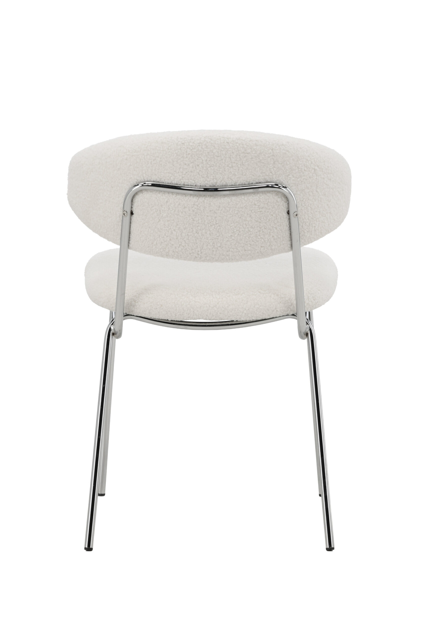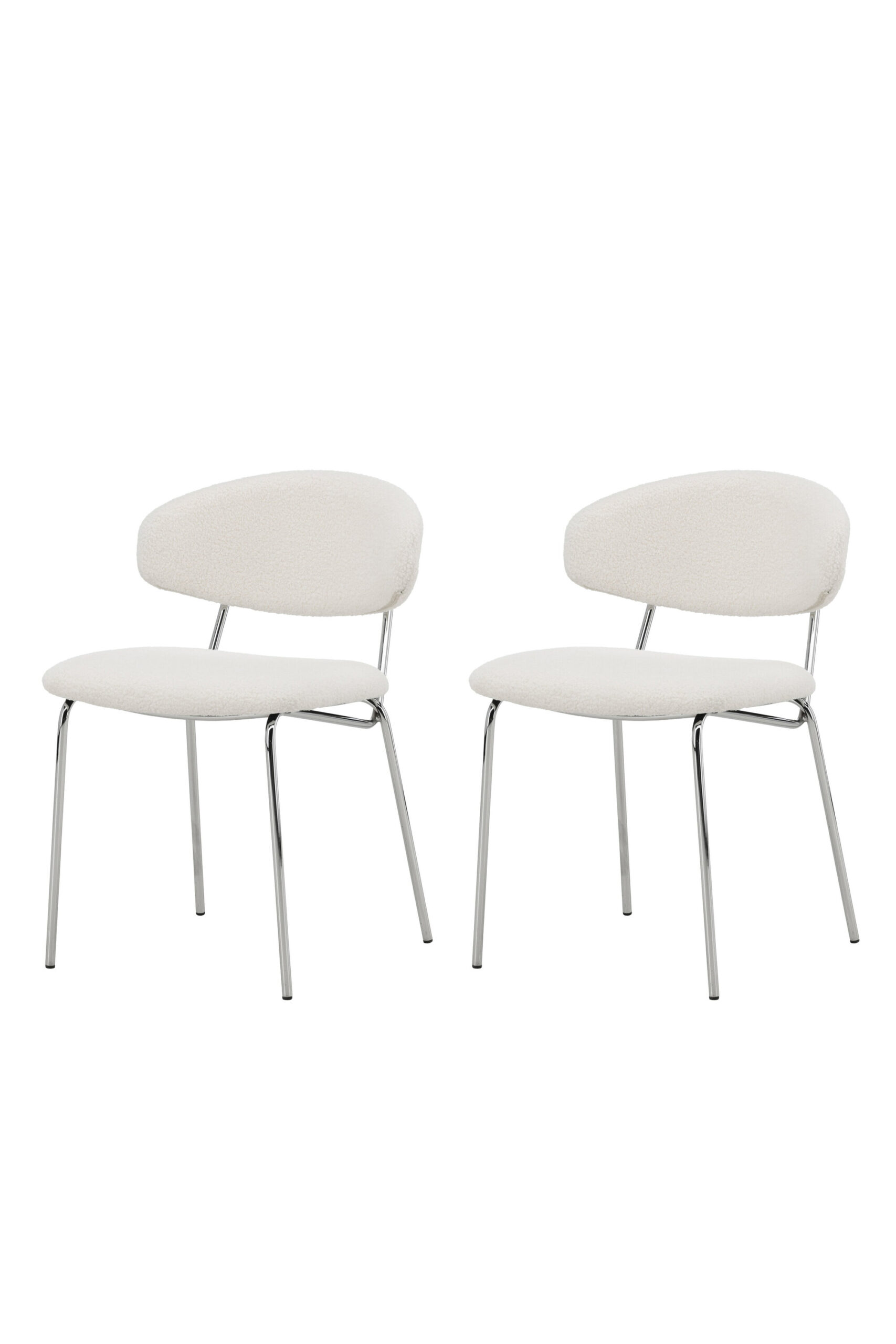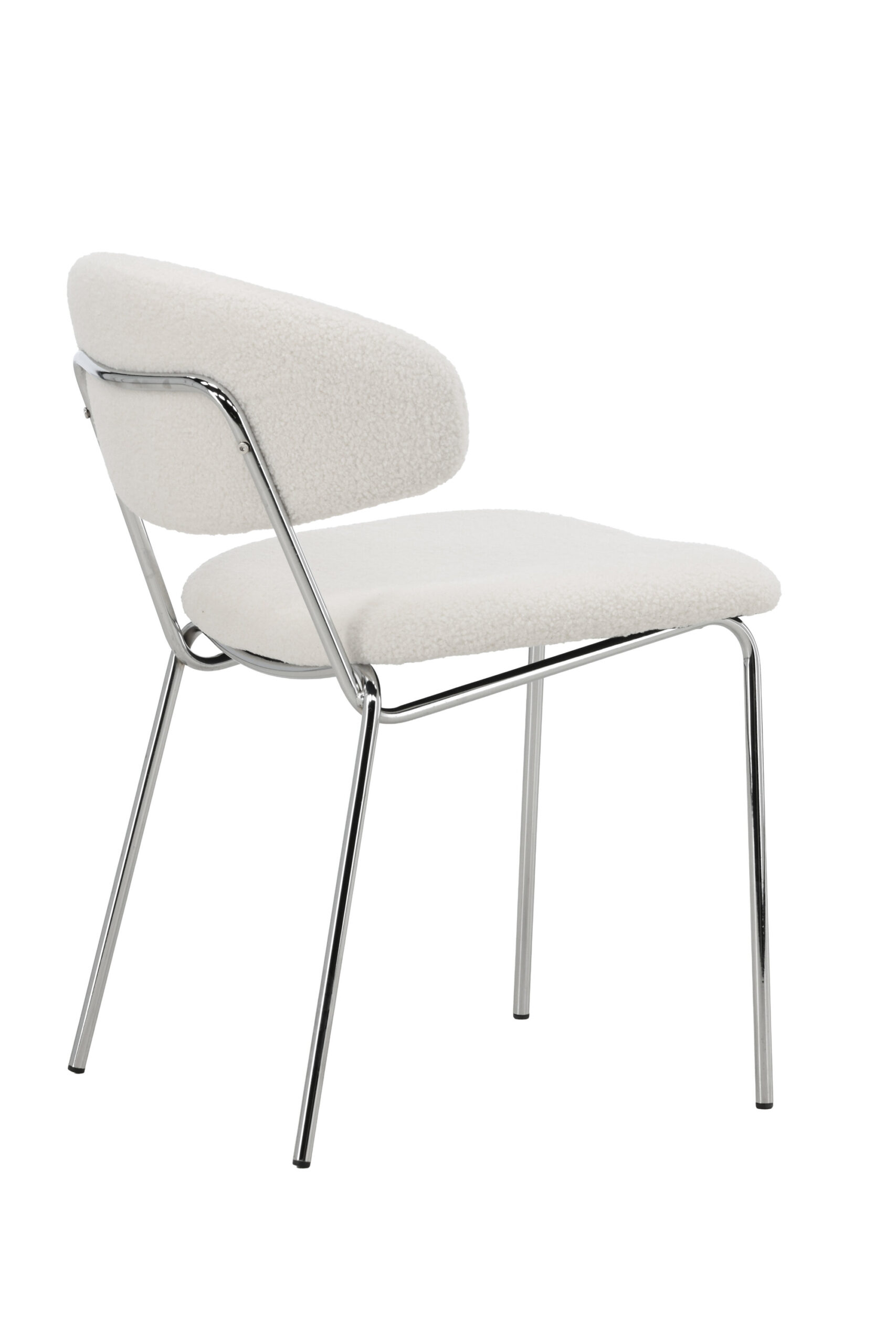 Chico – moderni valgomojo kėdė, kurioje išgrynintas dizainas dera su išskirtiniu patogumu. Sėdimoji dalis ir atlošas aptraukti balta buklė Audinys, kuri suteikia minkštą ir patrauklų pojūtį, kartu įnešdama tekstūros ir charakterio į erdvę. Chromuoto plieno kojelės sukuria elegantišką kontrastą ir pabrėžia lengvą bei grakštų siluetą.