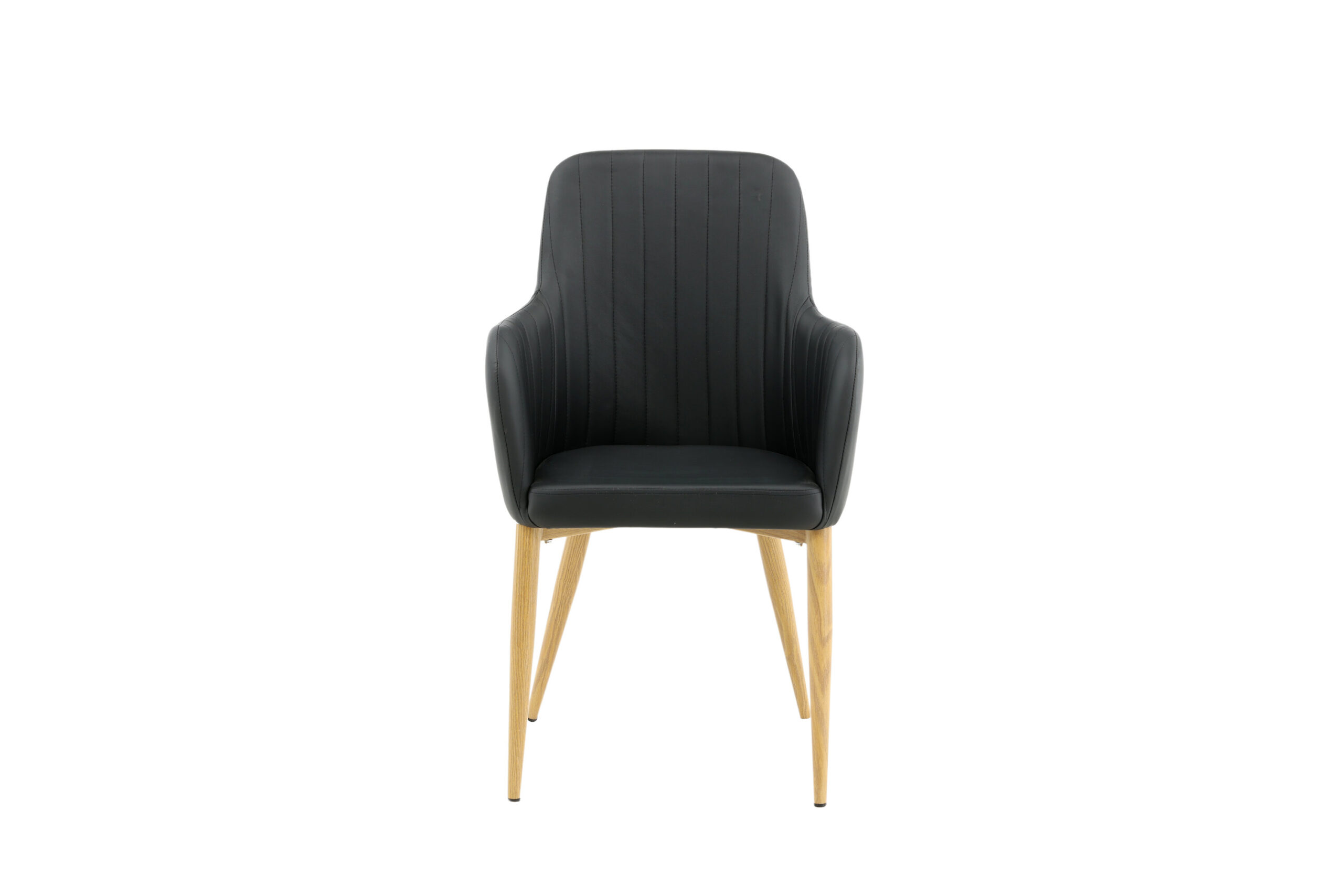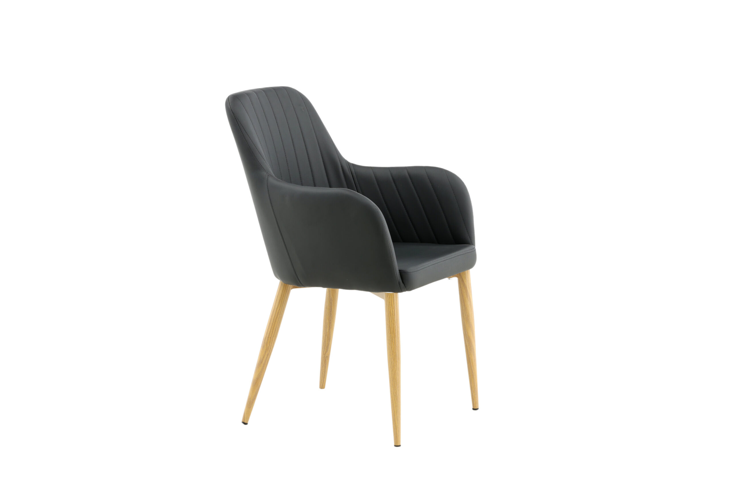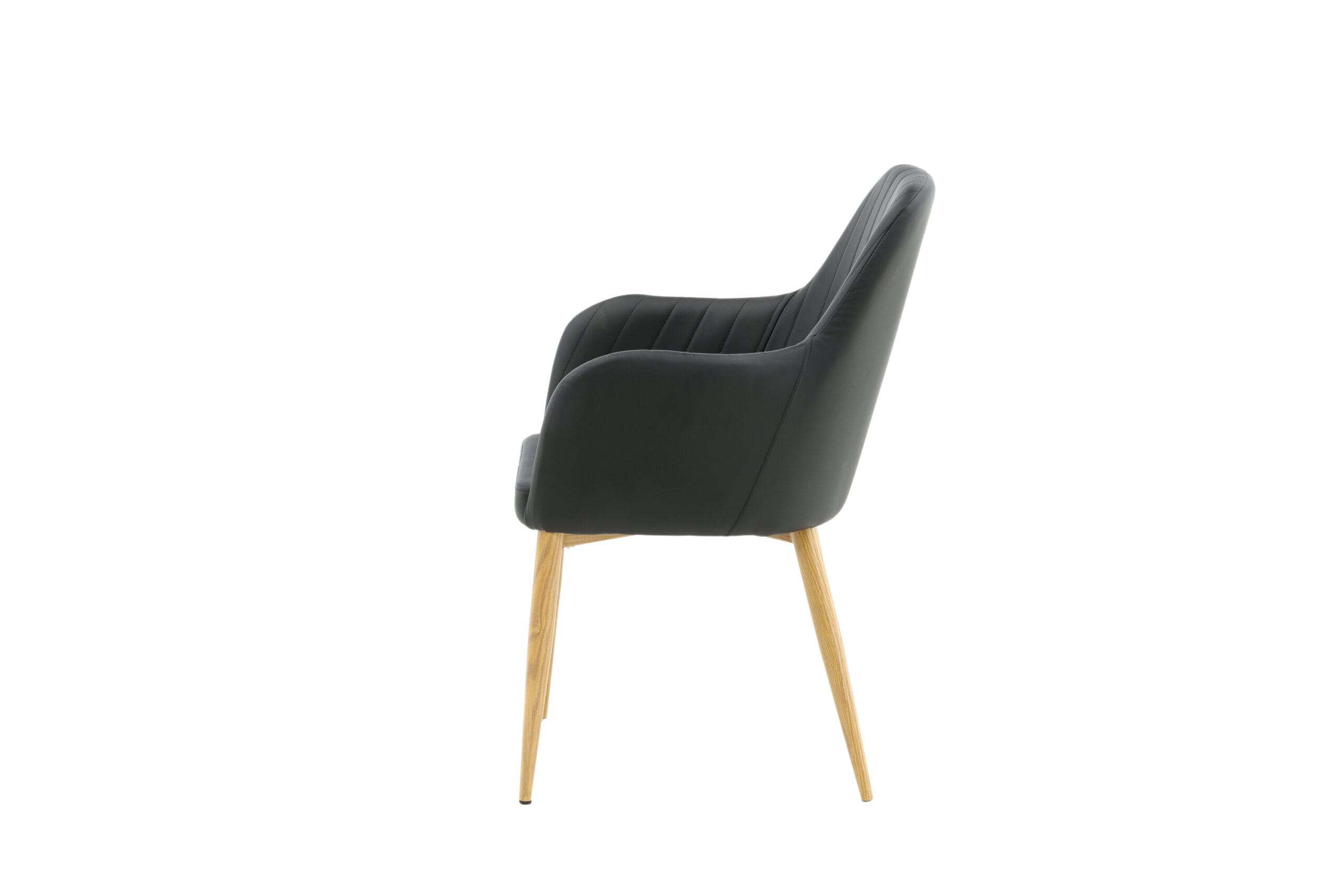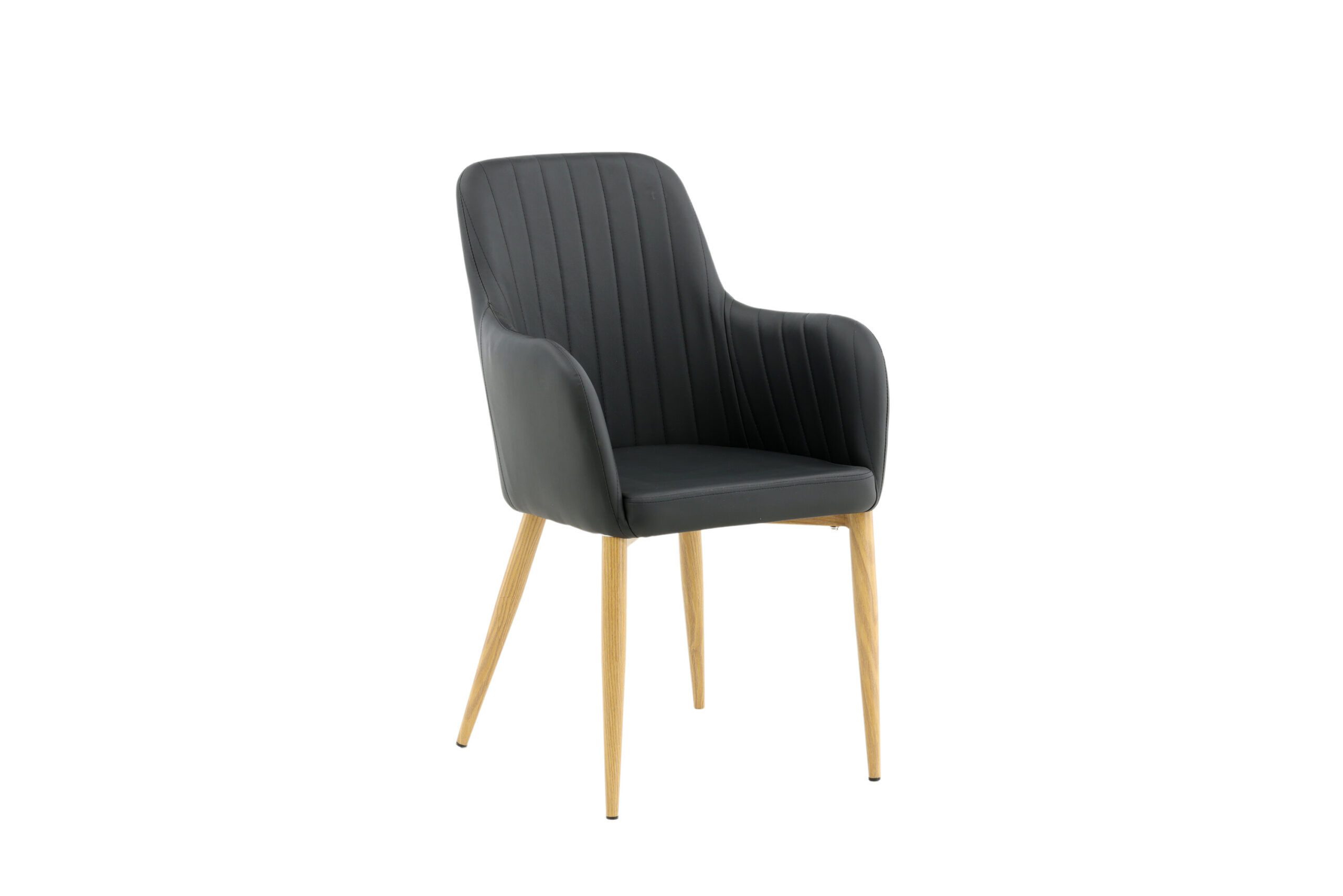 Mūsų skoninga valgomojo kėdė iš kolekcijos Comfort yra tvirtos pilnai apmuštos konstrukcijos su ąžuolo apdailos metalinėmis kojomis. Atlošas ir sėdimoji dalis su integruotais porankiais, aptraukti juoda dirbtine oda. Dekoratyvinės siūlės atlošo ir porankių vidinėje pusėje suteikia stilingumo. Patogiai įsitaisykite ir kvieskite prie stalo! Nesudėtingai surenkama.