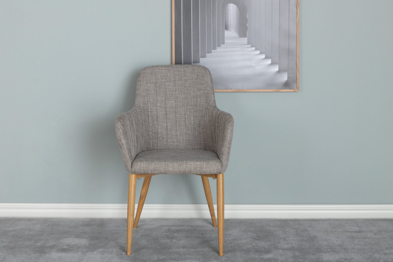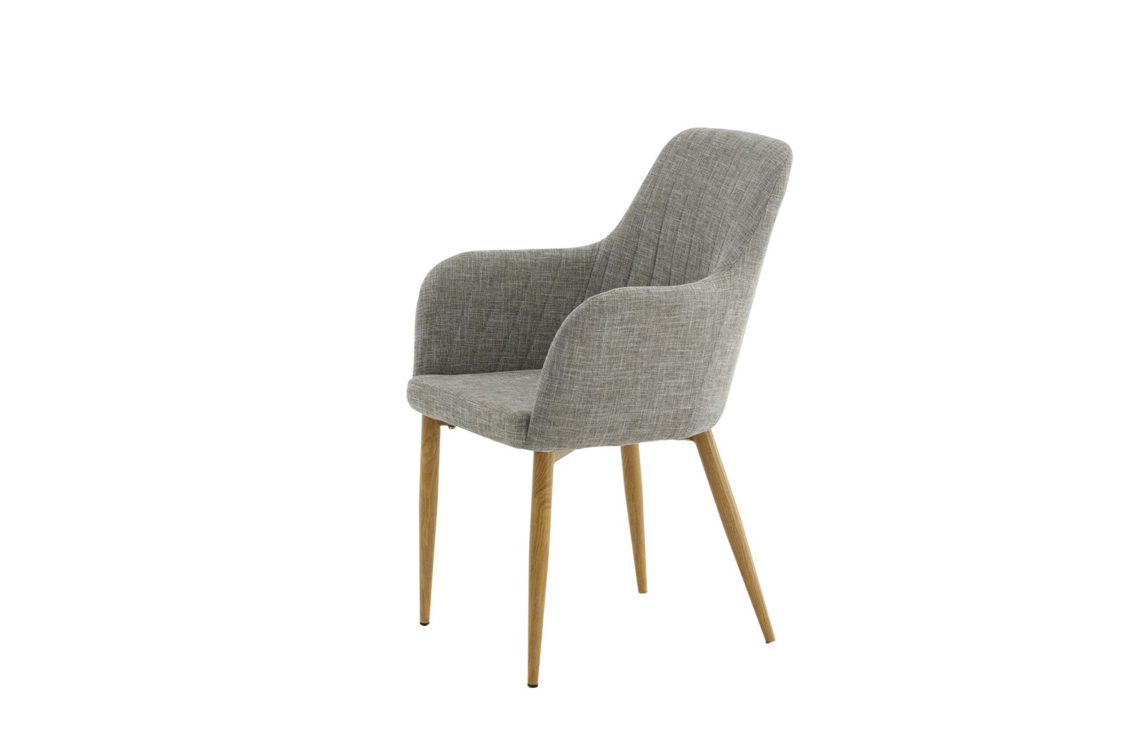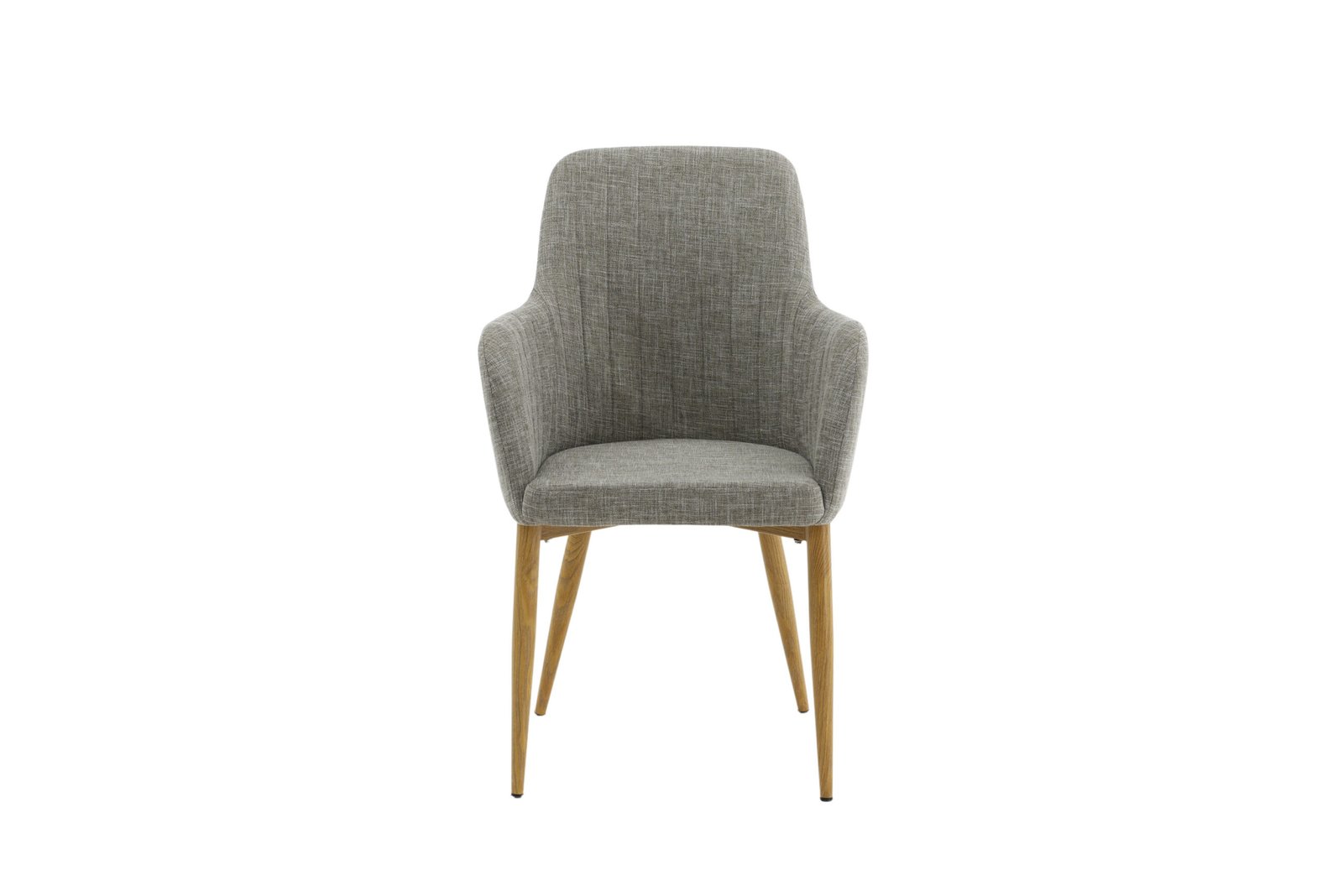 Venkite kompromisų tarp dizaino ir patogumo! Ši Comfort kolekcijos valgomojo kėdė - tai geriausias variantas. Kėdė yra solidaus dizaino, pilnai apmušta, su metalo kojomis su ąžuolo apdaila ir šviesiai pilko poliesterio audinio atlošu bei sėdimąja dalimi su integruotais porankiais. Dekoratyvinės siūlės atlošo ir porankių vidinėje pusėje suteikia stilingumo. Nesudėtingai surenkama.