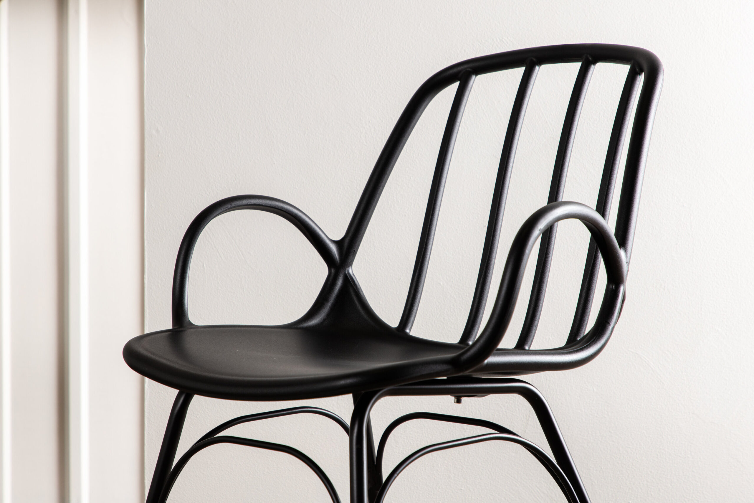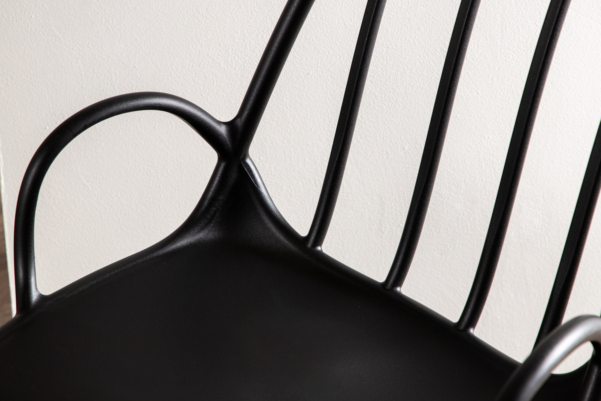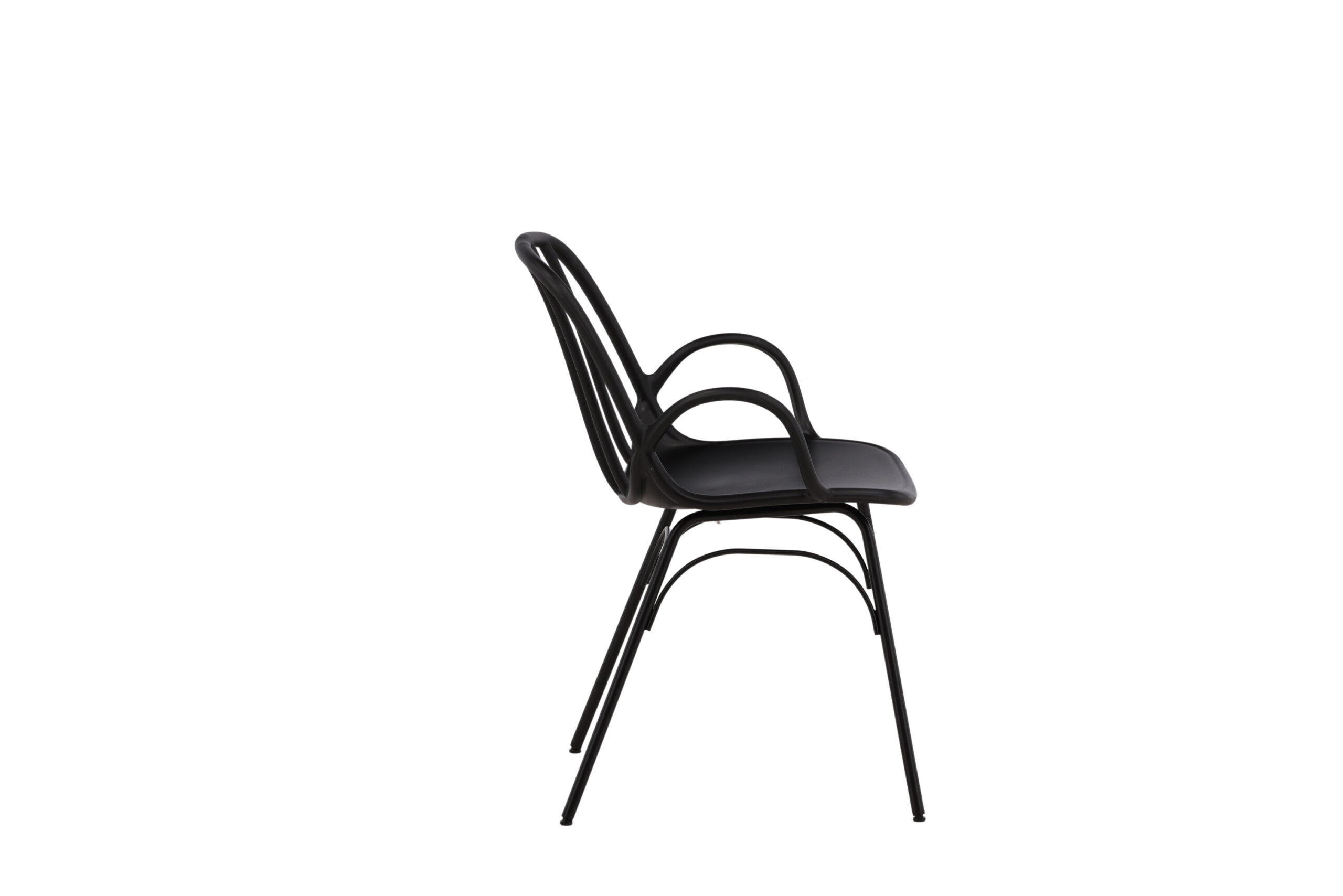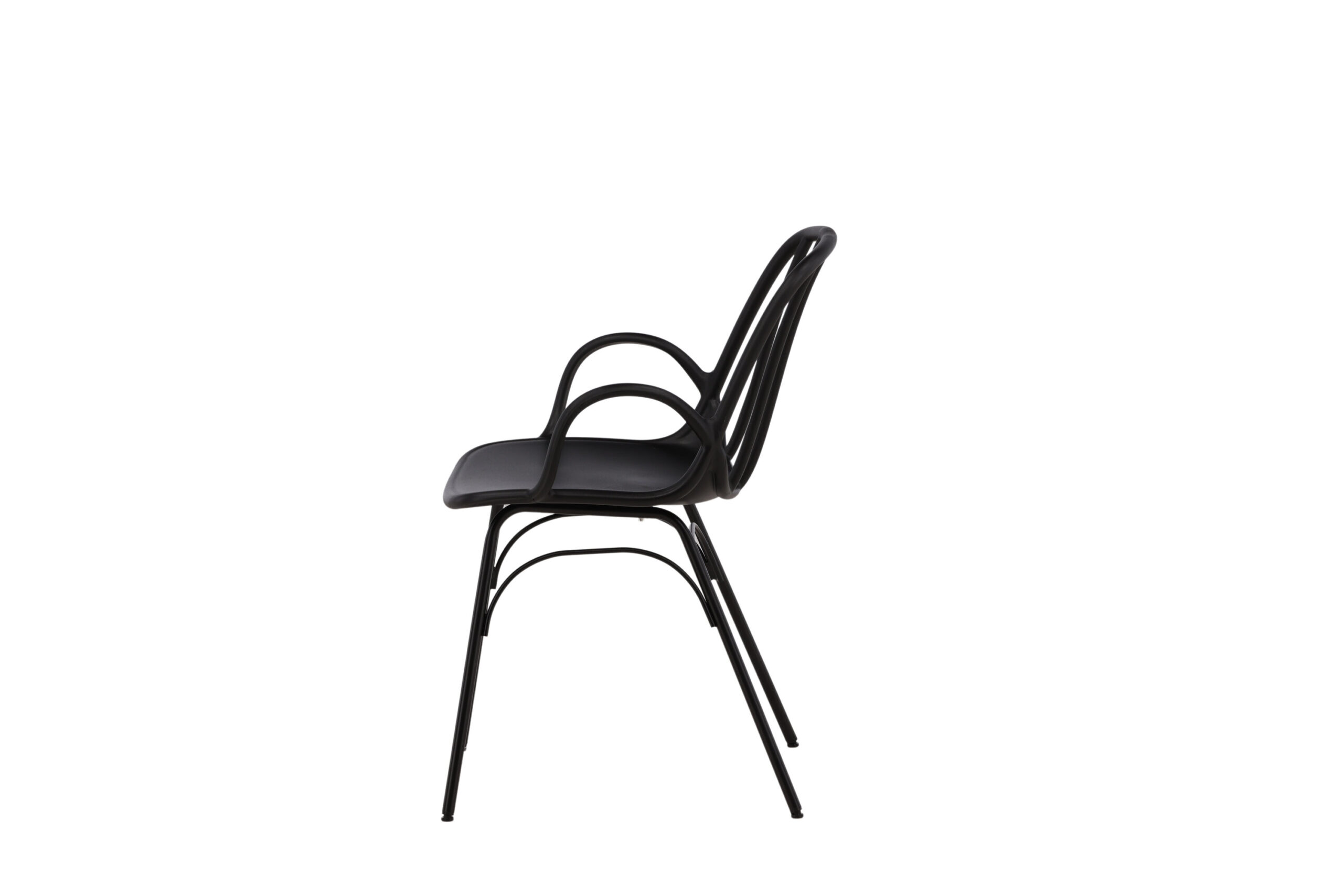 Dyron - juoda valgomojo kėdė, kuri jūsų namuose sukurs individualią ir modernią atmosferą! Ši daili valgomojo kėdė, pagaminta iš juodo plastiko ir plieno, yra tiek pat elegantiška, kiek ir praktiška. Sėdimojoje dalyje integruoti porankiai, o švelniai suapvalinto atlošo formos yra briaunuotos. Kėdės kojos yra elegantiškai plonos ir švelniai platėjančios, skandinaviško modelio. Priderinkite prie jos valgomojo stalą ir sukurkite pilną valgomojo komplektą, prie kurio galėsite mėgautis maistu!