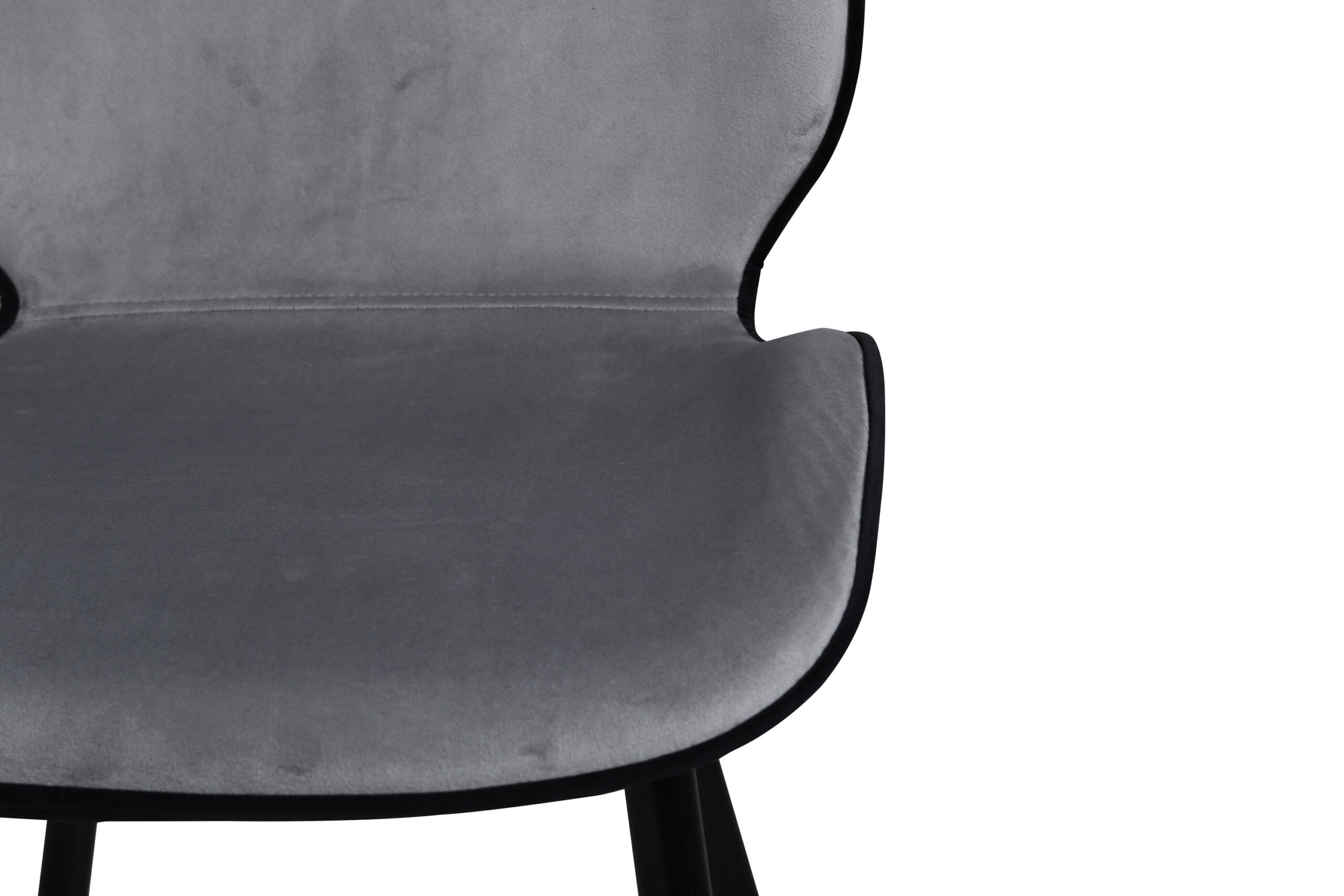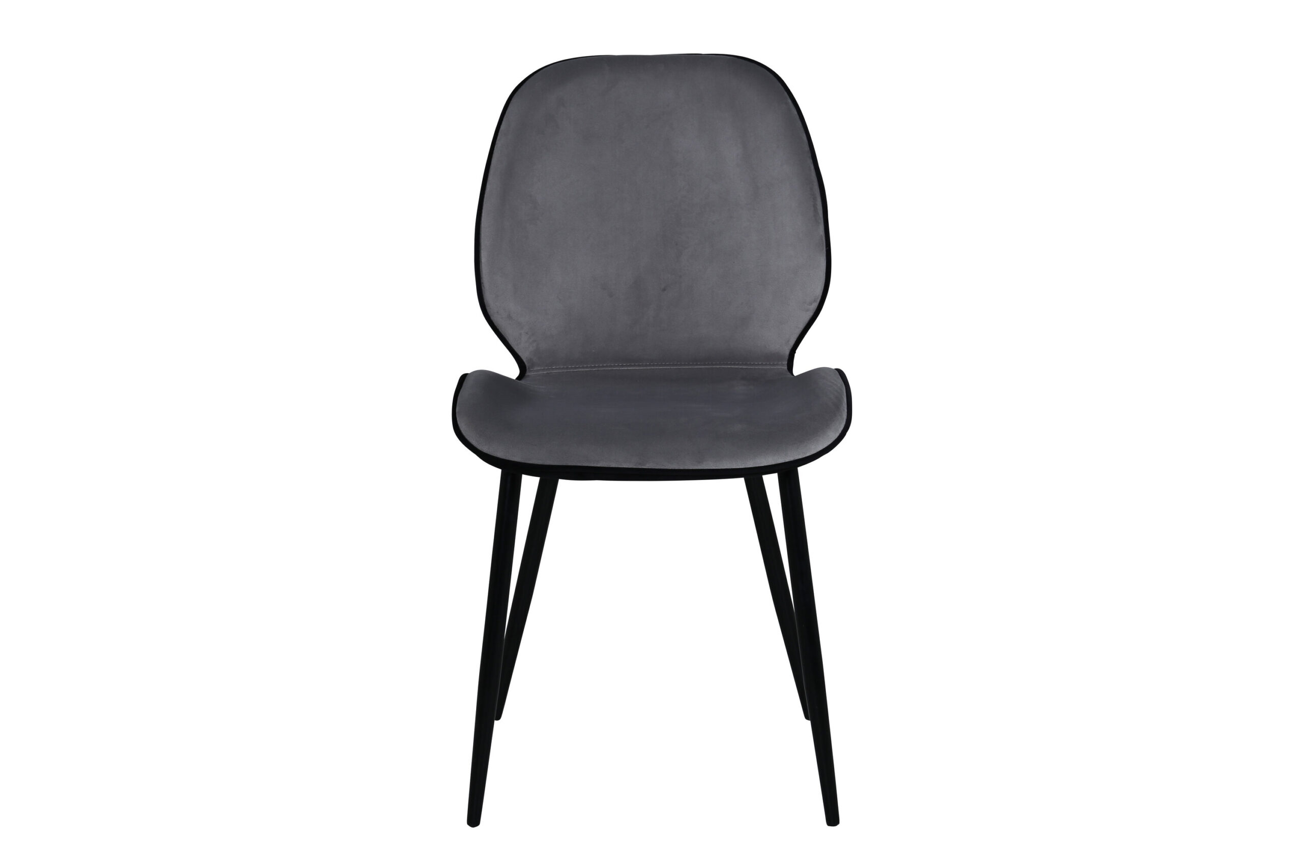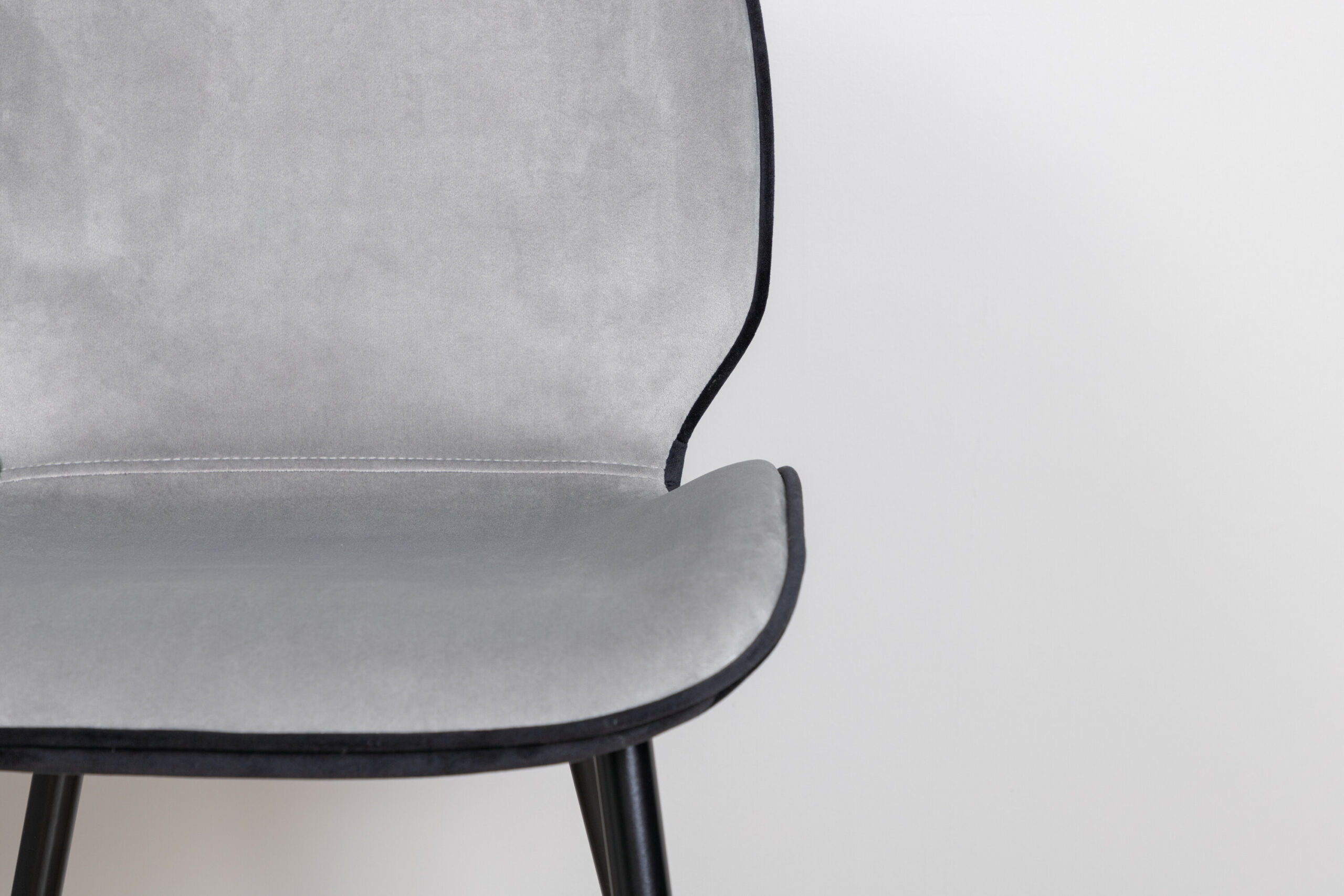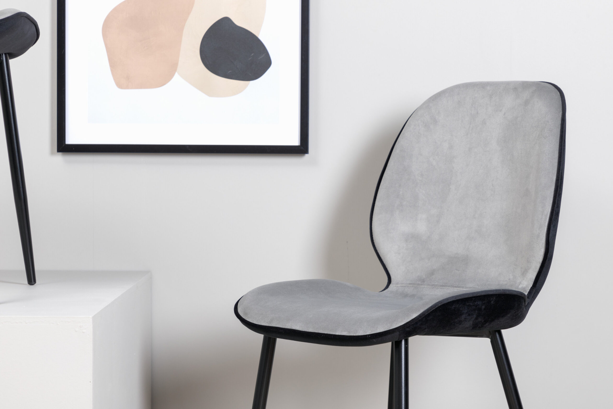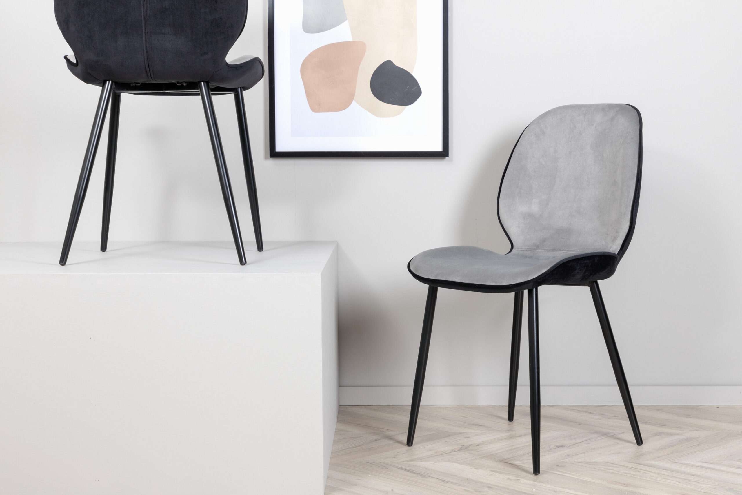 Sukurkite modernų akcentą gyvenamajame kambaryje su elegantiško dizaino valgomojo kėdėmis iš kolekcijos Emma! Kėdė yra švelniai suapvalintos formos, sėdimoj dalis pasiūta iš pilko aksomo ir poliesterio audinio, o kėdės kojos švelniai išlenktos, iš juodos geležies. Kėdės nugarėlė yra juodos spalvos, kuri sukuria madingą kontrastą. Tegul čia praleistas laikas tampa svarbiausiu dienos akcentu, nereikia ieškoti kompromiso tarp patogumo ir stiliaus!