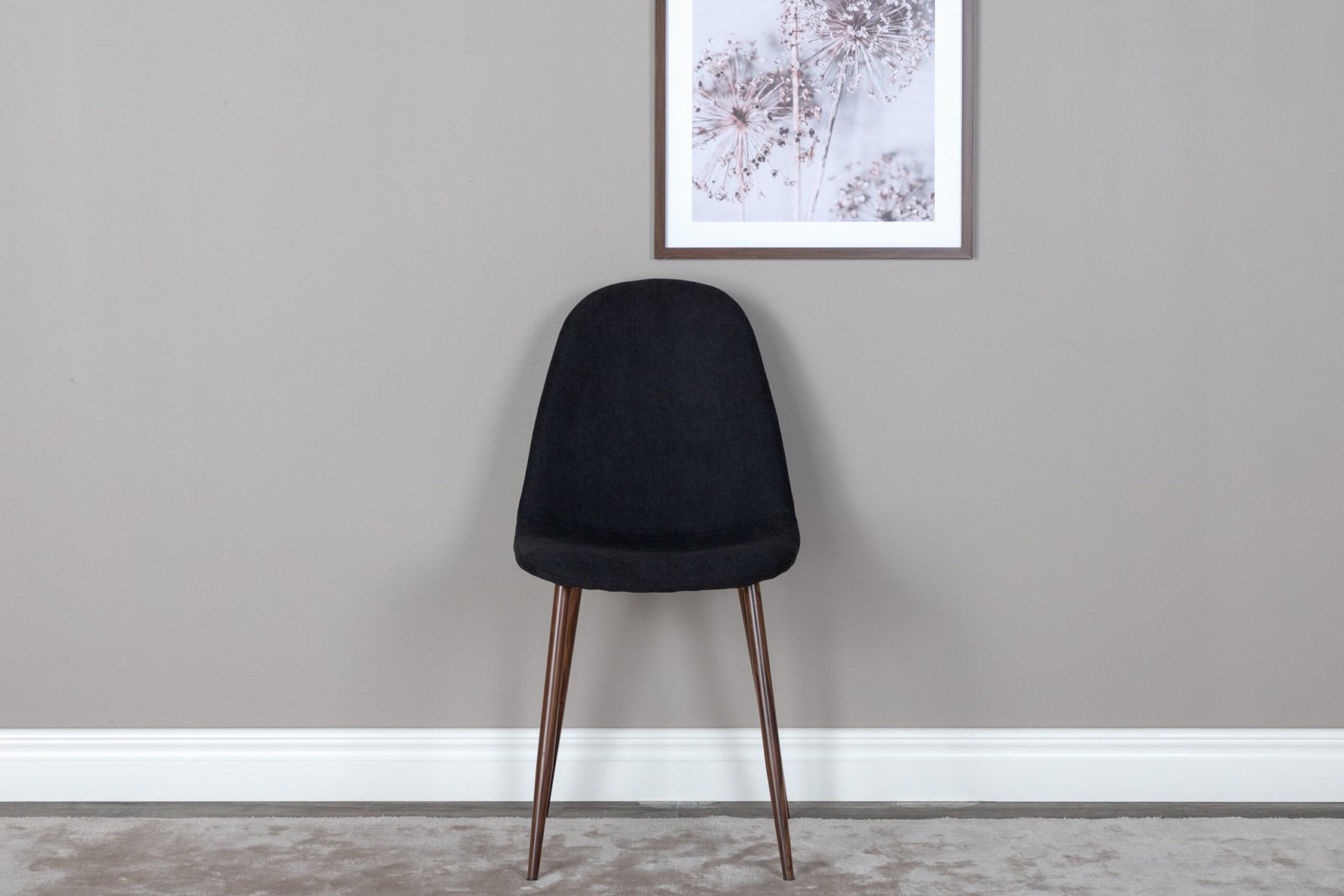 Polar valgomojo kėdė su riešutmedžio spalvos metalinėmis kojomis, kurios dizainas traukia akį ir pirmauja tendencijų sąrašuose! Švelniai suapvalintas klasikinis atlošas, su plokščia juodos spalvos poliesterio audiniu aptraukta ir paminkštinta, sėdimąja dalimi. Nesudėtingai surenkama. Čia su šeima ir draugais patogiai praleisite valandų valandas!