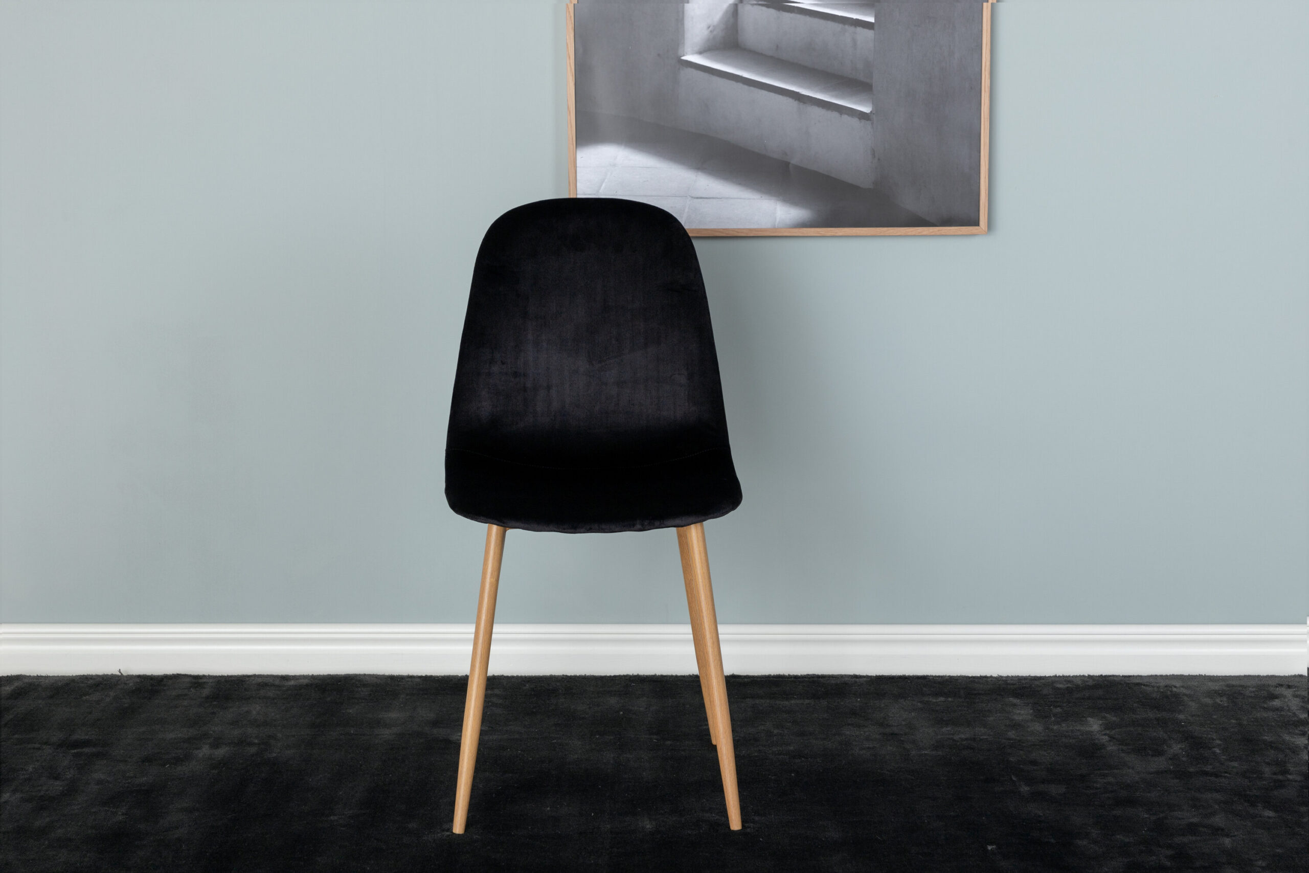 Stilinga juodos spalvos ir modernaus dizaino valgomojo kėdė - ko daugiau galite norėti? Polar yra visiškai išbaigto dizaino, su riešutmedžio spalvos metalinėmis kojomis, kurios dailiai dera su užapvalinta nugarėle ir juodo aksomo audinio sėdimąja dalimi su paminkštinimu. Lengvai surenkama. Nereiks ieškoti kompromiso tarp patogumo ir dizaino!