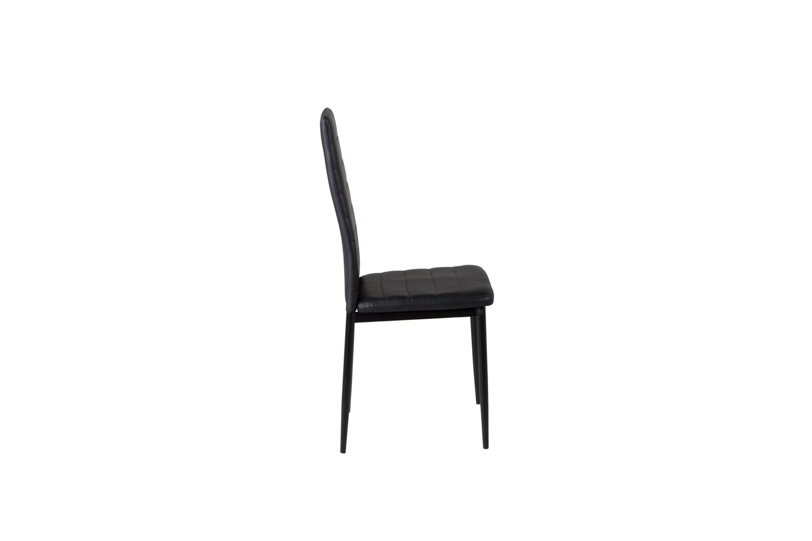 Valgomojo kėdė Slim su aukštu atlošu, pilnai apmušta, modernaus dizaino. Atlošas ir sėdimoji dalis aptraukti juoda dirbtine oda, atlošo ir sėdimosios dalies vidinėje pusėje esančios dekoratyvinės siūlės sudaro dryžuotą raštą, paminkštinta. Kojos yra iš juodos spalvos, milteliniu būdu dažyto metalo. Ant šios kėdės jūs ir jūsų svečiai patogiai sėdėsite valandų valandas! Lengvai surenkama.