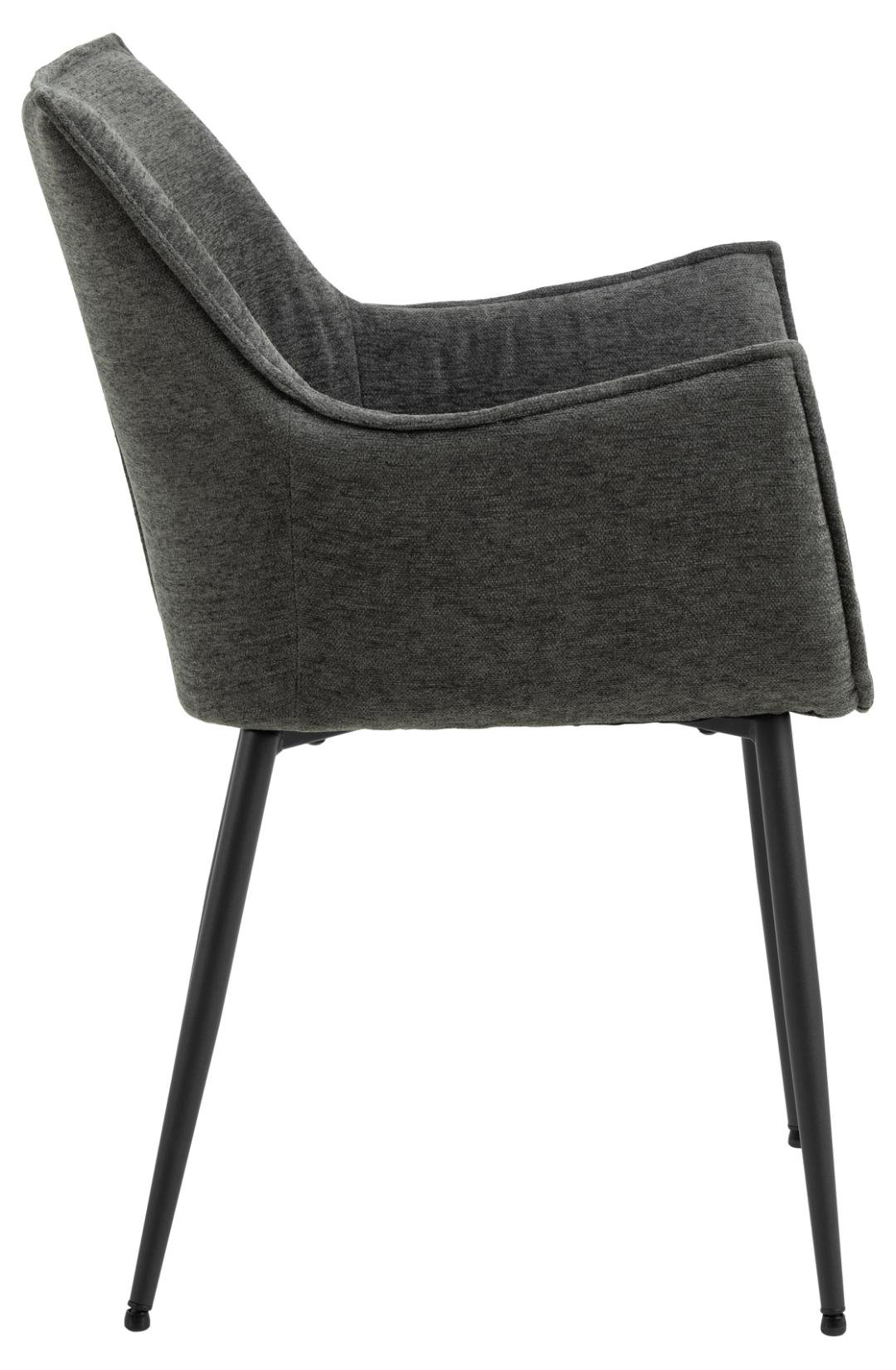 Bonita valgomojo kėdė su porankiais, Apia kolekcijos tamsiai pilkos spalvos audinys 458, pagrindas juodas matinis šiurkščios faktūros milteliniu būdu dengtas plienas su prancūziškomis siūlėmis, su užtrauktuku.
