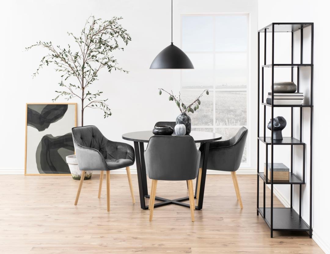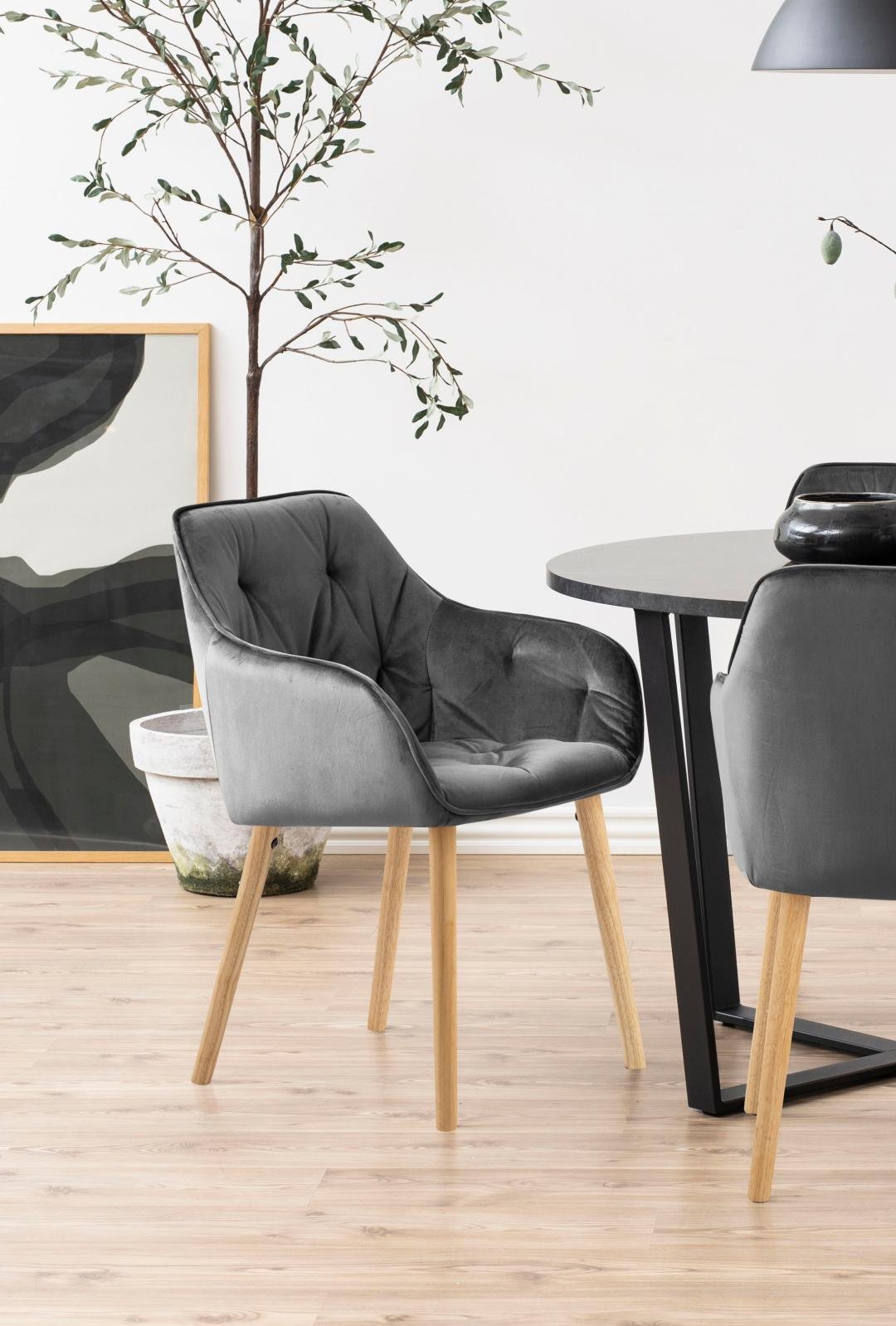 Brooke valgomojo kėdė su porankiais, Vic kolekcijos tamsiai pilkos spalvos audinys 28, pagrindas ąžuolo spalvos NC lakuotas kaučiukmedis su sagutėmis.