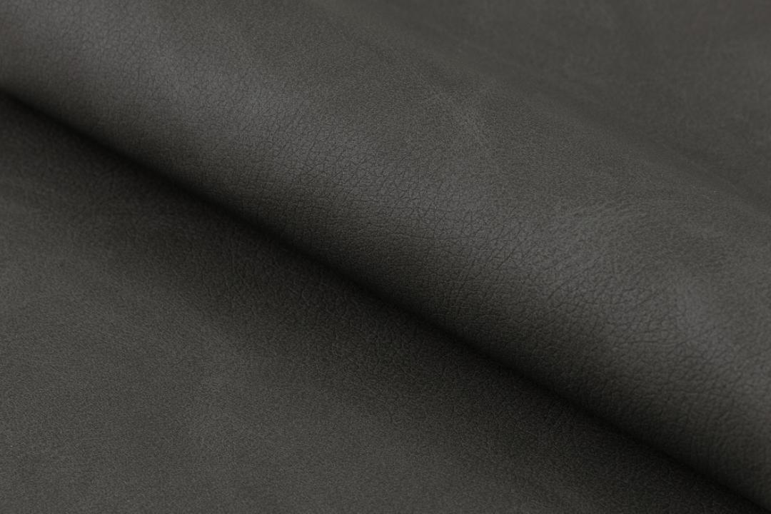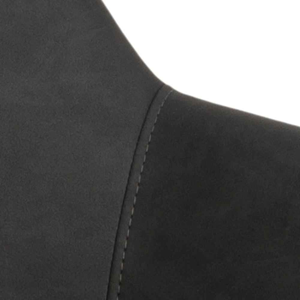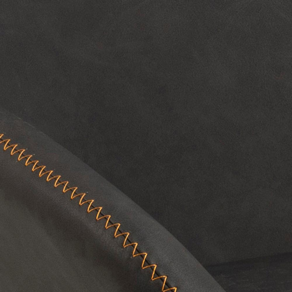 Candis valgomojo kėdė su porankiais, pilkos spalvos PU Dove FPU-11, pagrindas – plieninis, dengtas juoda matine milteline danga, su oranžiniais ir zigzaginiais dygsniais.