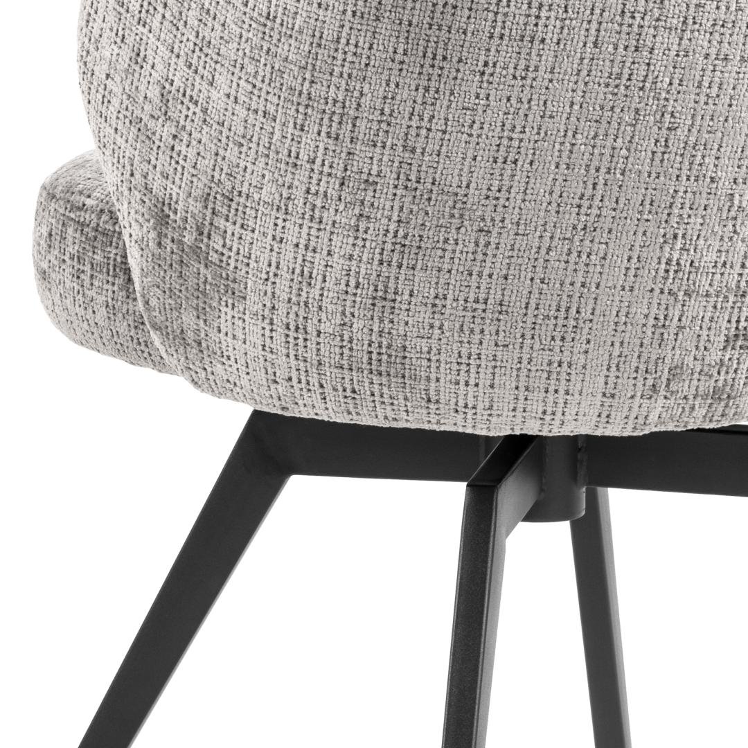 Darlene valgomojo kėdė su porankiais, Juto kolekcijos pilkos spalvos audinys 85 FR, pagrindas – plieninis, dengtas juoda matine šiurkščios faktūros milteline danga; trys siuvimo linijos, automatinio grįžimo funkcija, kišeninės Spy kolekcijosruoklės, pasukimo funkcija, su užtrauktuku.
