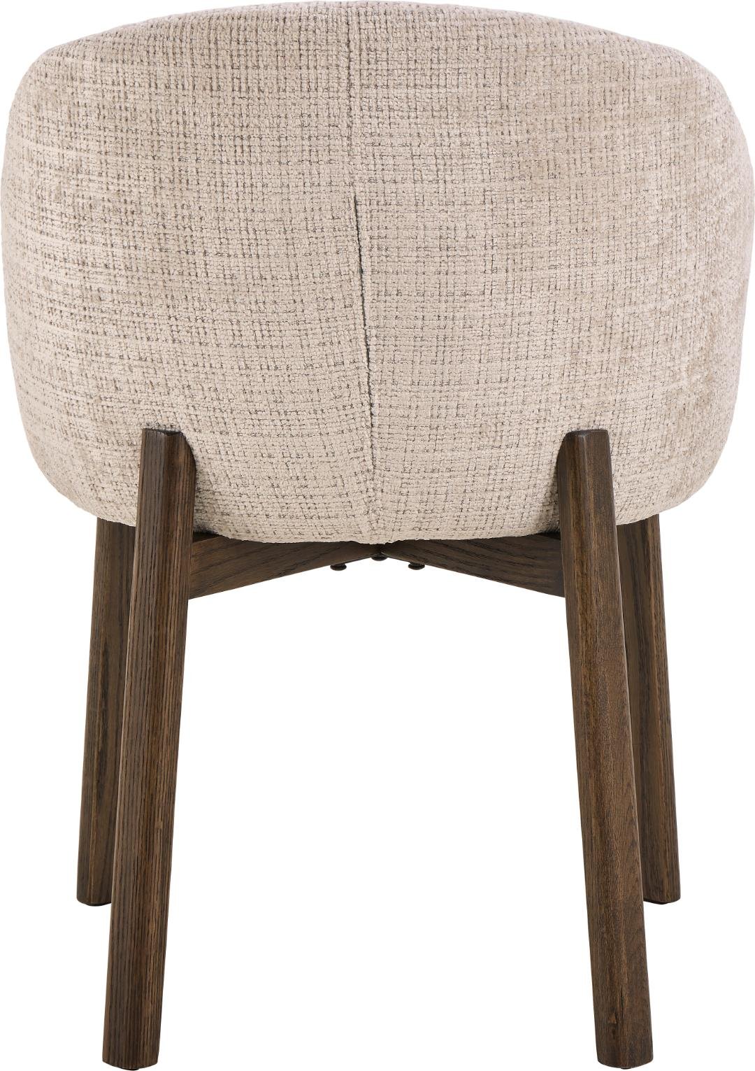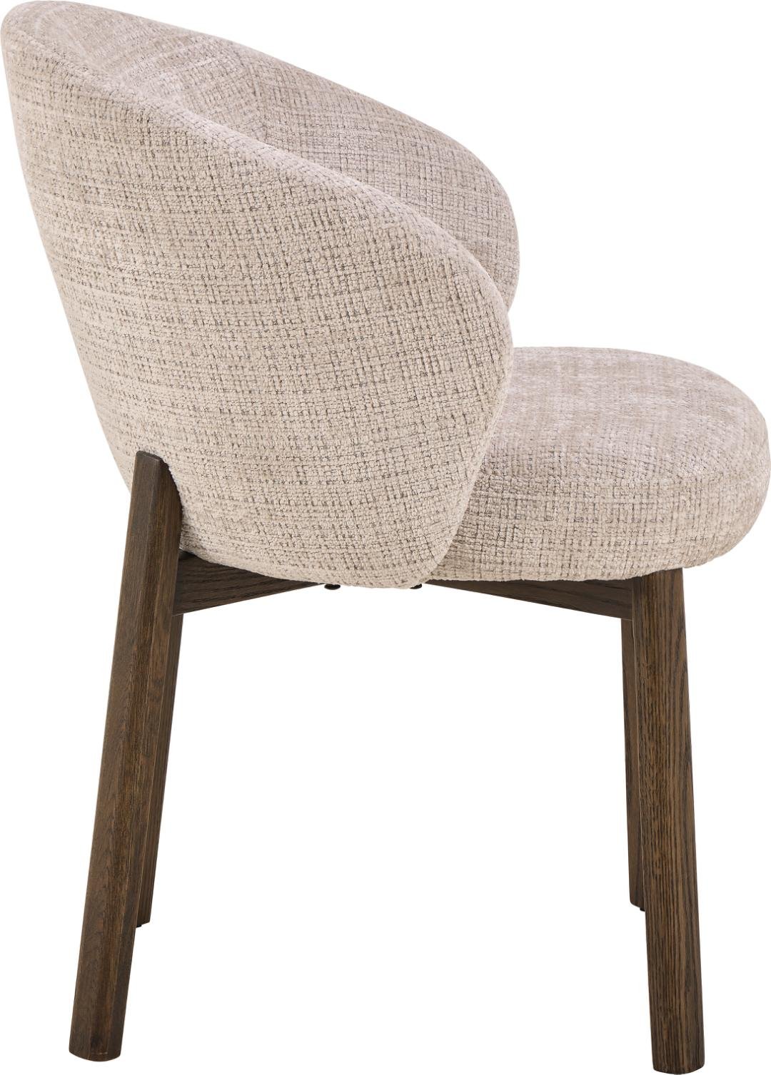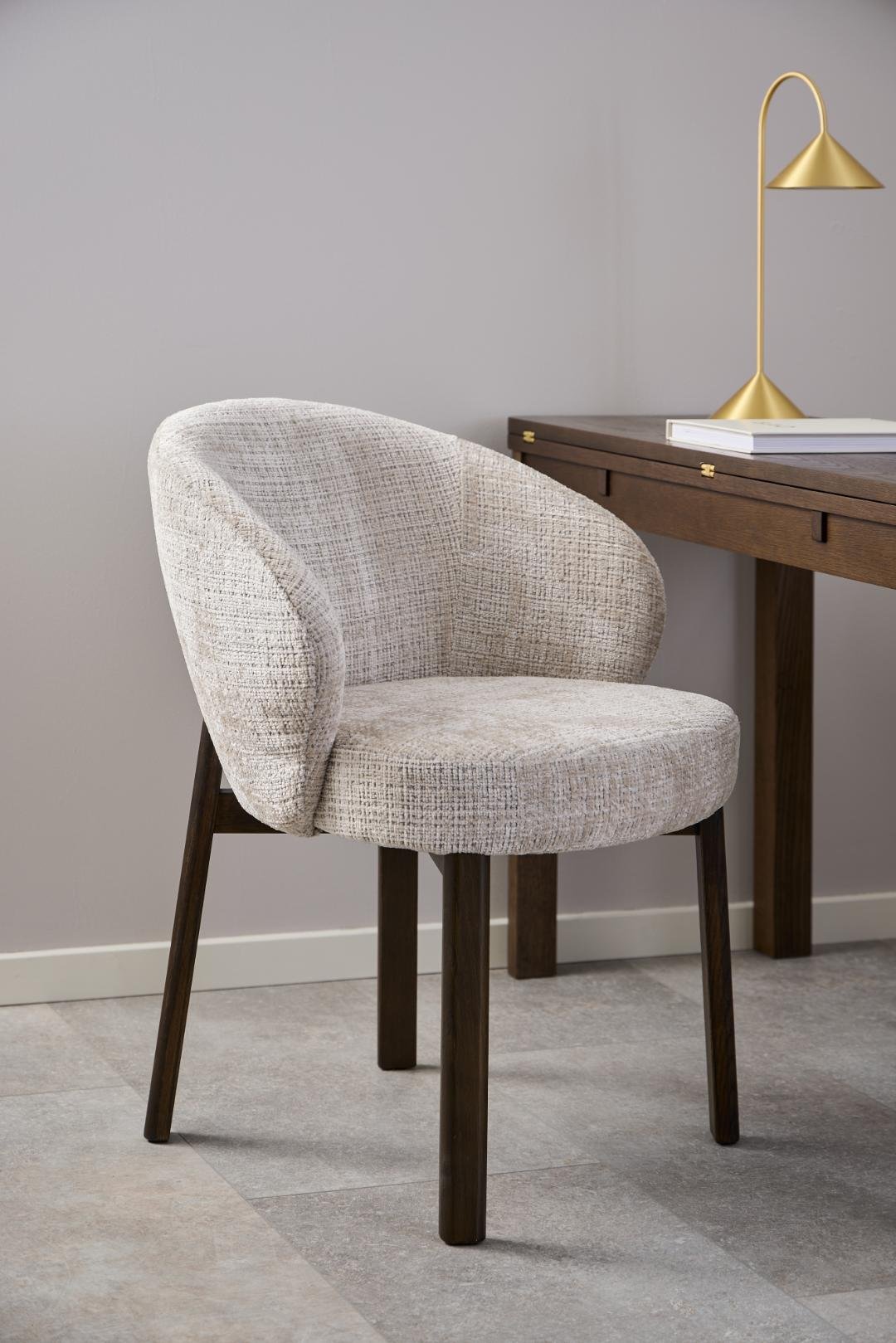 Darlene valgomojo kėdė su porankiais, Juto kolekcijos smėlio spalvos audinys 4 FR, pagrindas – dūmintas ąžuolas, dengtas matiniu NC laku; trys siuvimo linijos ir kišeninės Spy kolekcijosruoklės.