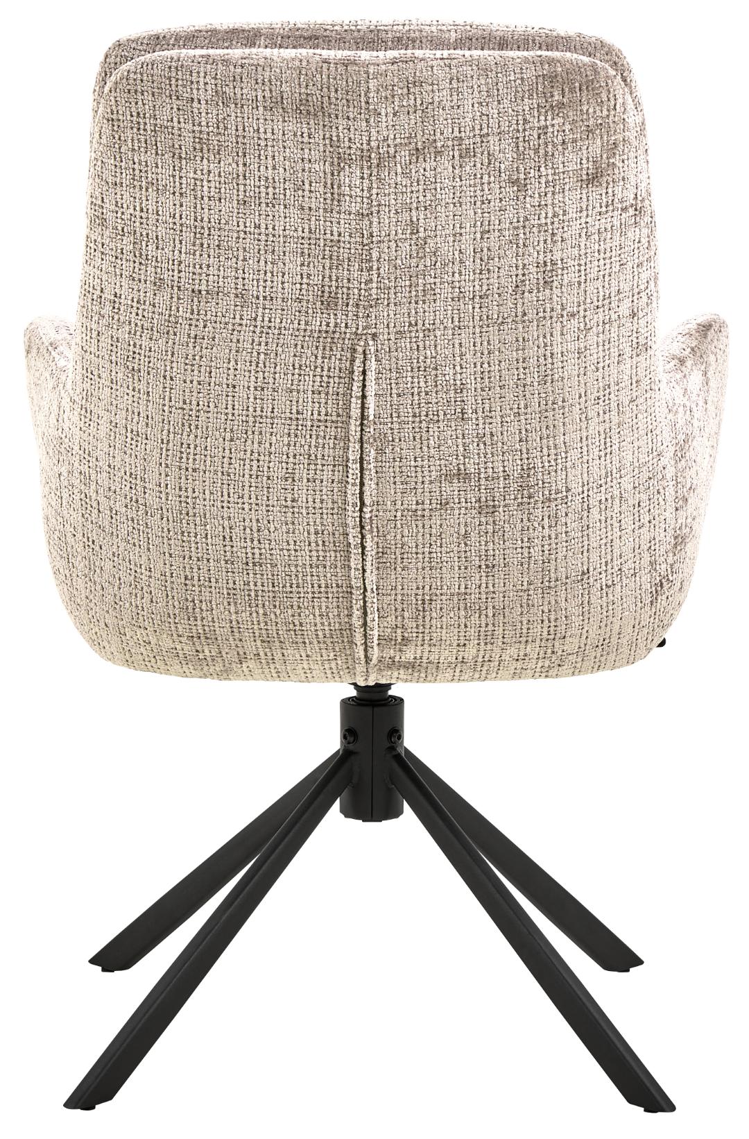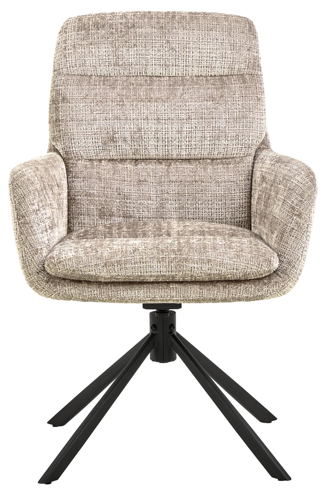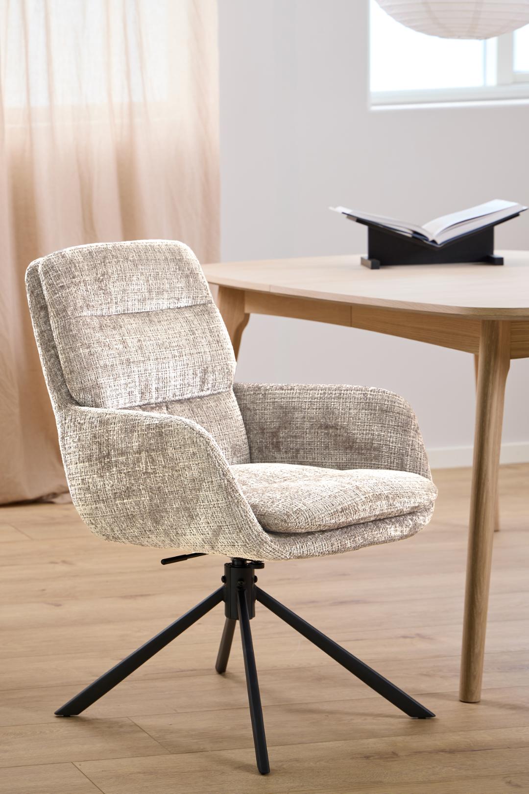 Edgar valgomojo kėdė su porankiais, Juto kolekcijos smėlio spalvos audinys 4, keturių atšakų pagrindas – plieninis, dengtas juoda matine šiurkščios faktūros milteline danga, horizontalūs dygsniai, pasukimo funkcija, pakreipimo funkcija, su užtrauktuku.