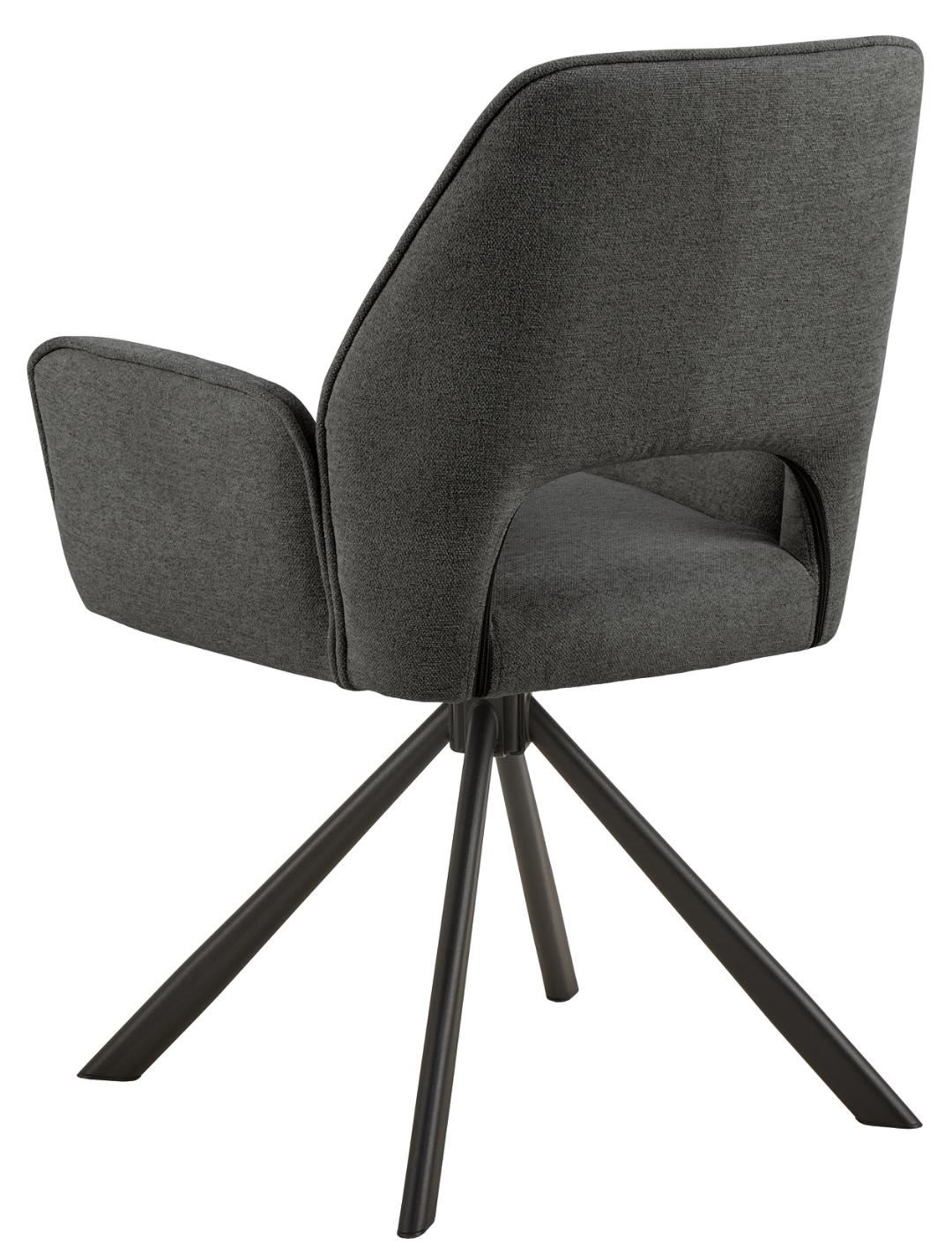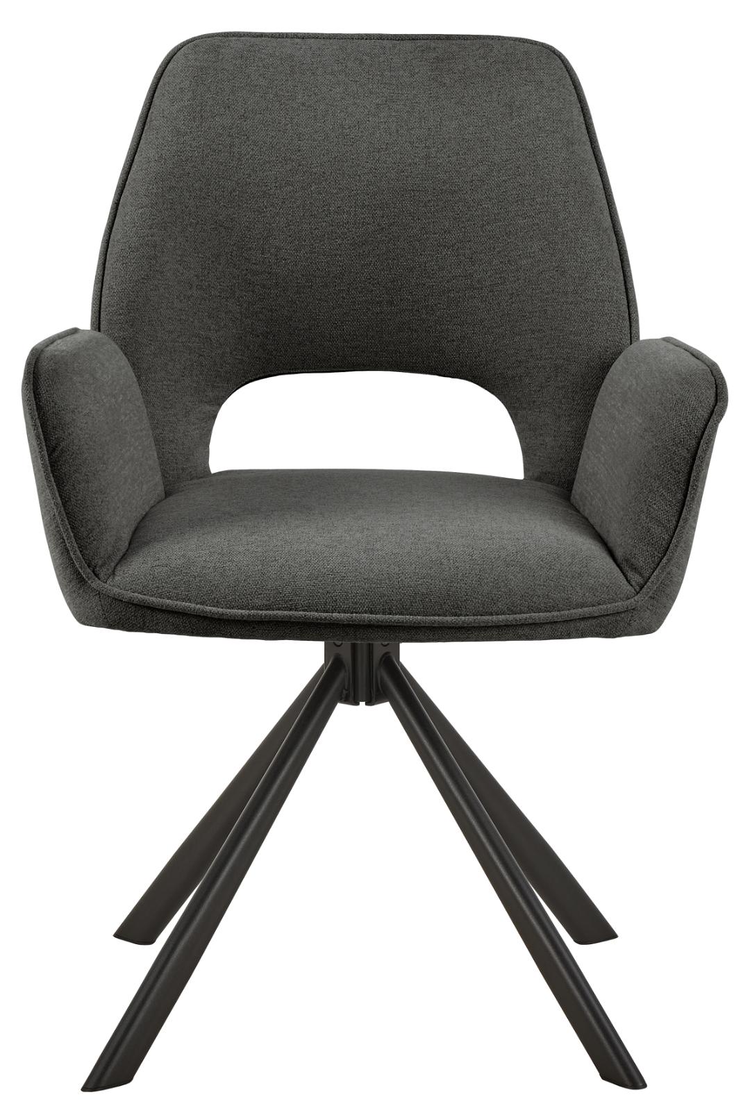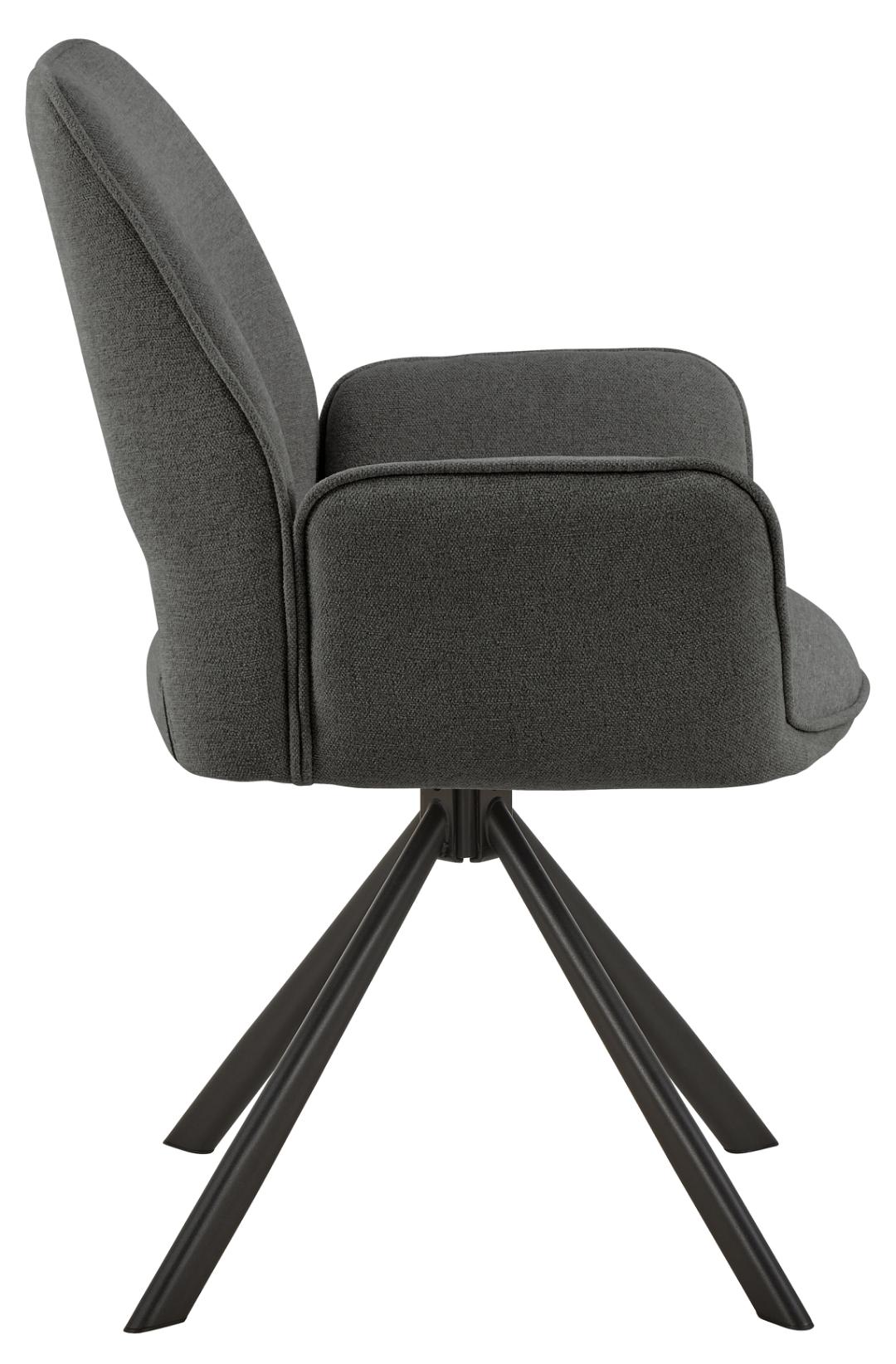 Graham valgomojo kėdė su porankiais, Apia kolekcijos tamsiai pilkos spalvos audinys 458, keturių atšakų pagrindas – juodas matinis šiurkščios faktūros milteliniu būdu dengtas plienas, pasukimo funkcija.
