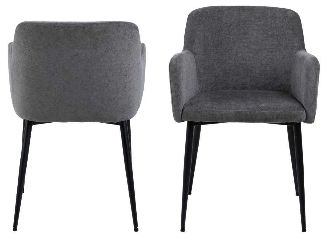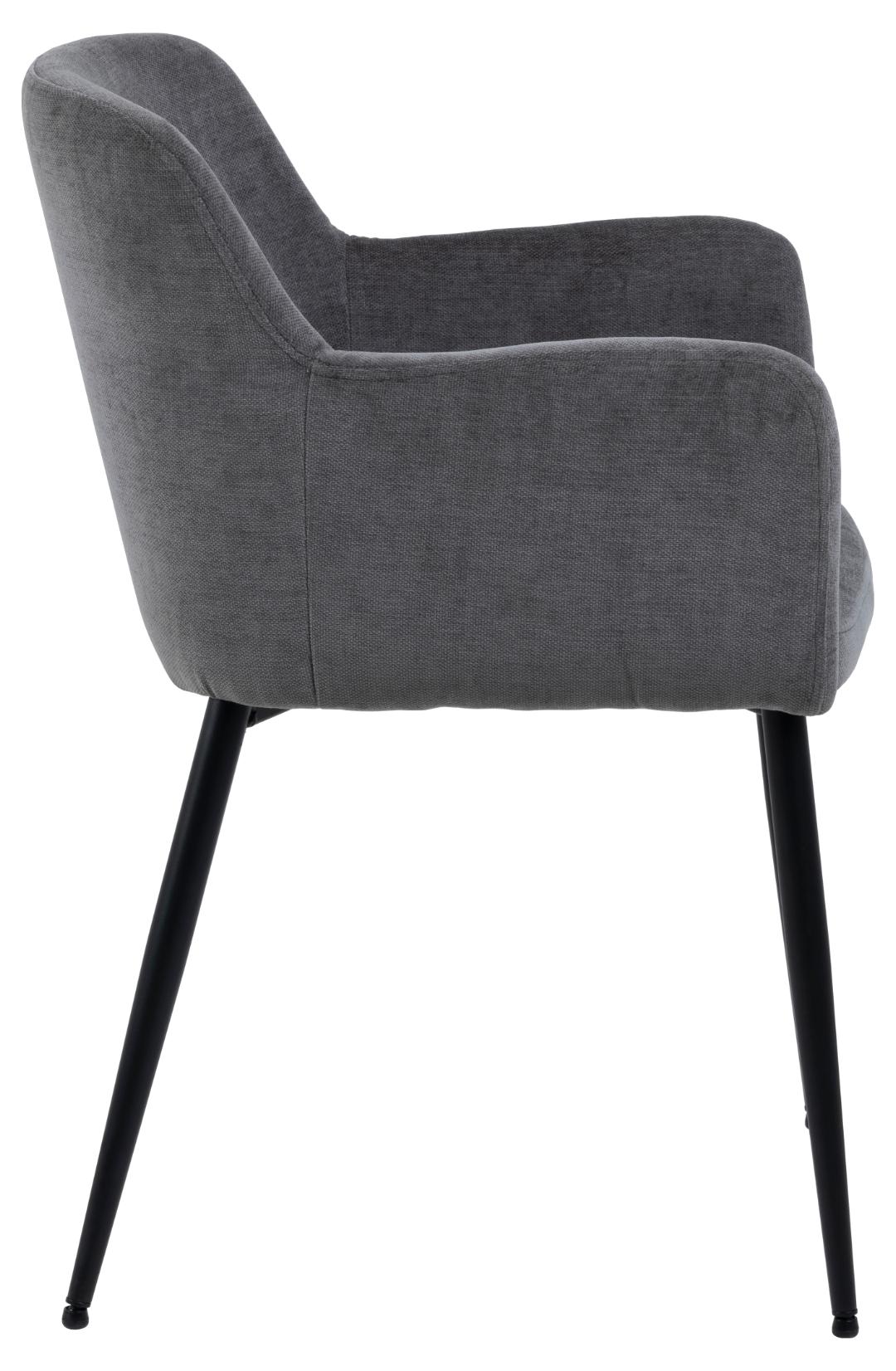 Karen valgomojo kėdė su porankiais, Danny kolekcijos tamsiai pilkos spalvos audinys 18, matinės juodos grublėtos milteliniu būdu dengtos plieninės kojos.