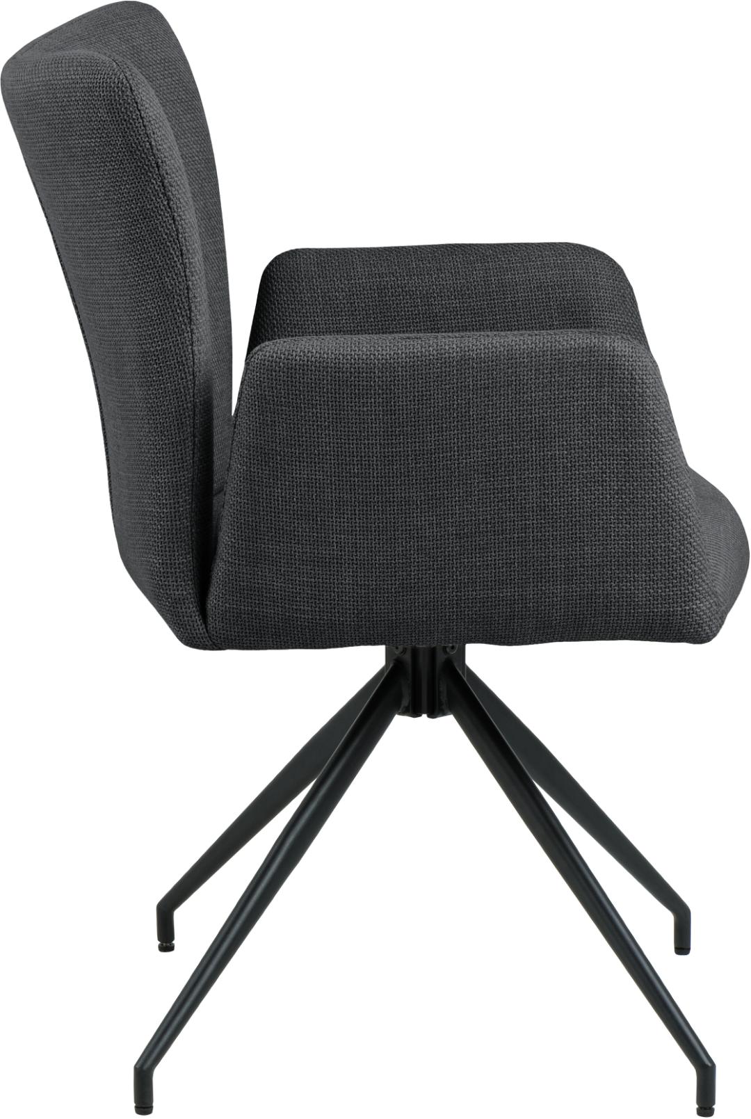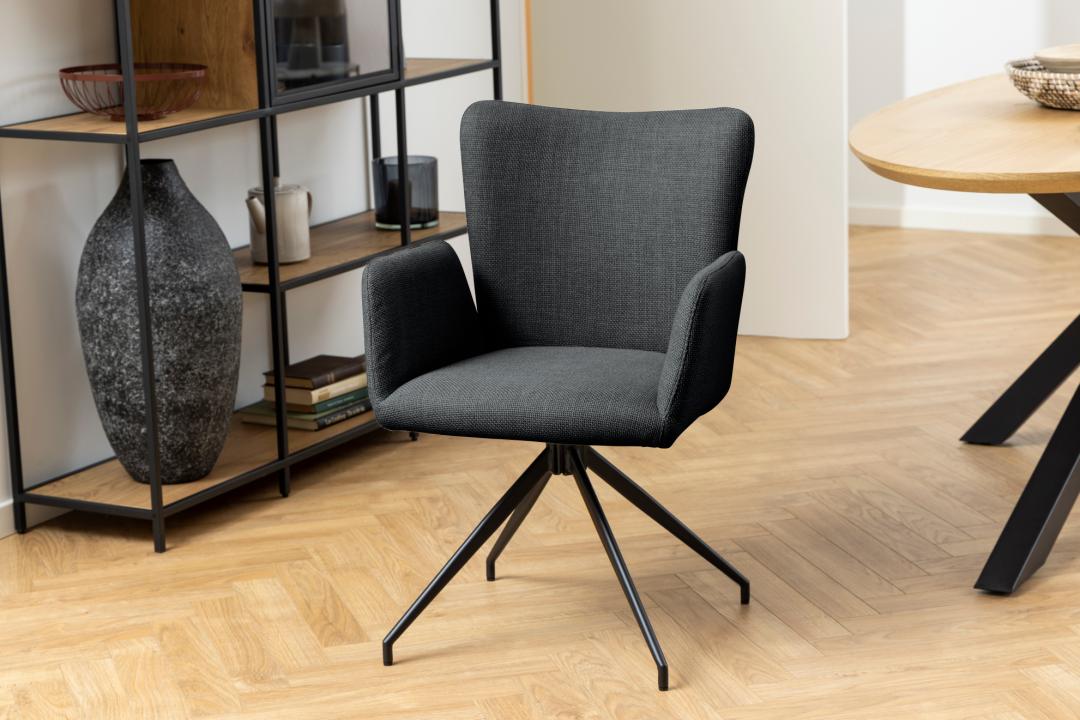 Laura valgomojo kėdė su porankiais, Basel kolekcijos tamsiai pilkos spalvos audinys 19, keturių atšakų matinės juodos grublėtos milteliniu būdu dengtos plieninės kojos, su pasukimo funkcija, su užtrauktuku.