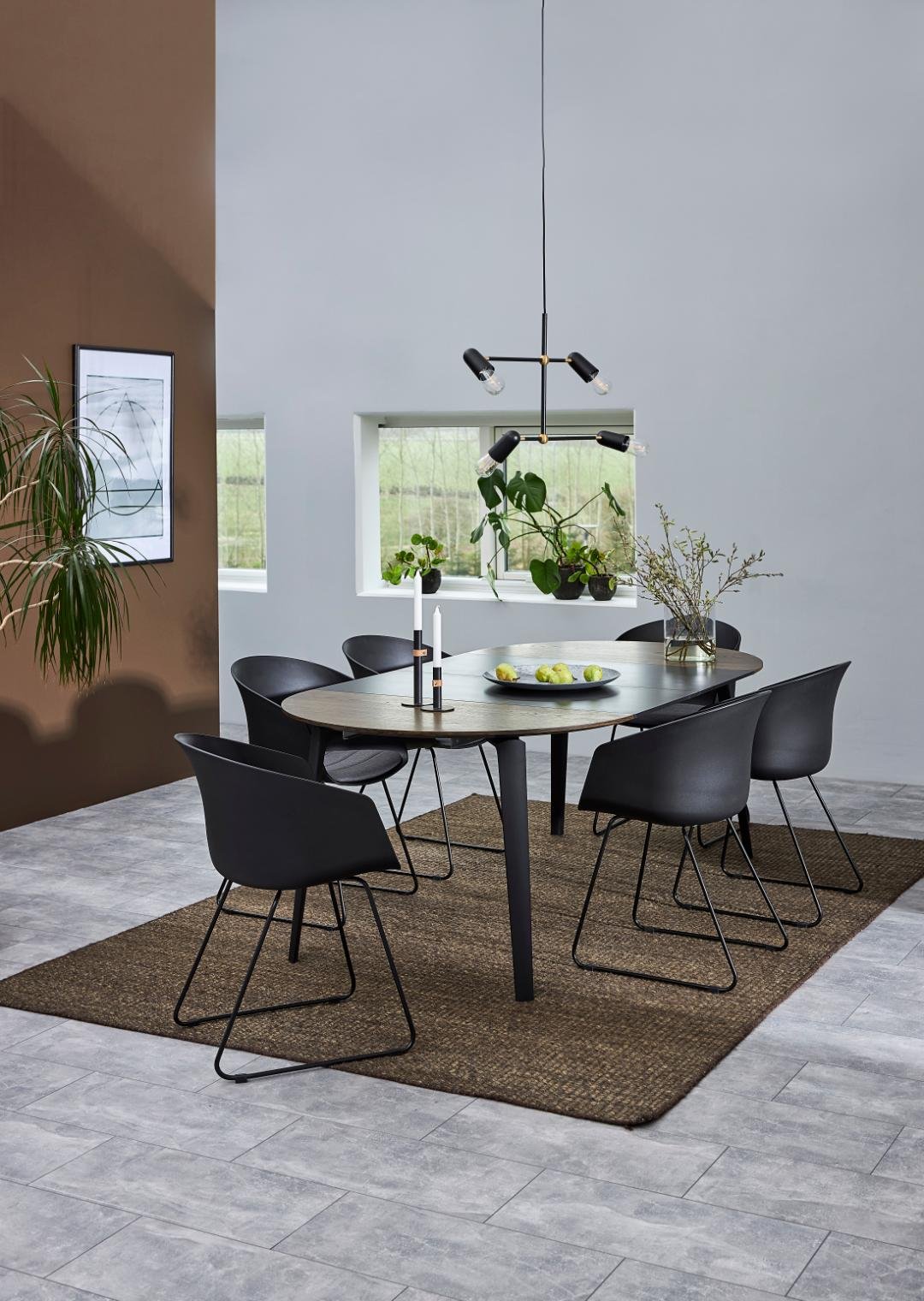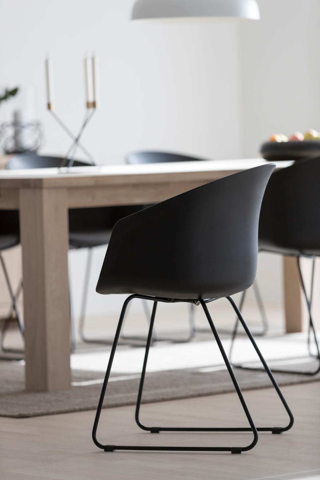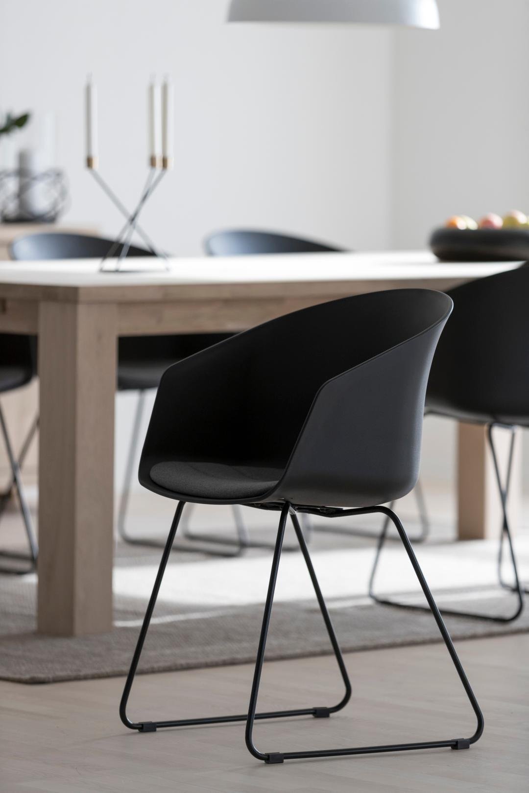 Moon valgomojo kėdė su porankiais, Spy kolekcijos audinys pilkas 20 ir matinio juodo grublėto polipropileno sėdimoji dalis, lenktas pagrindas, juodos milteliniu būdu dengtos plieninės kojos.