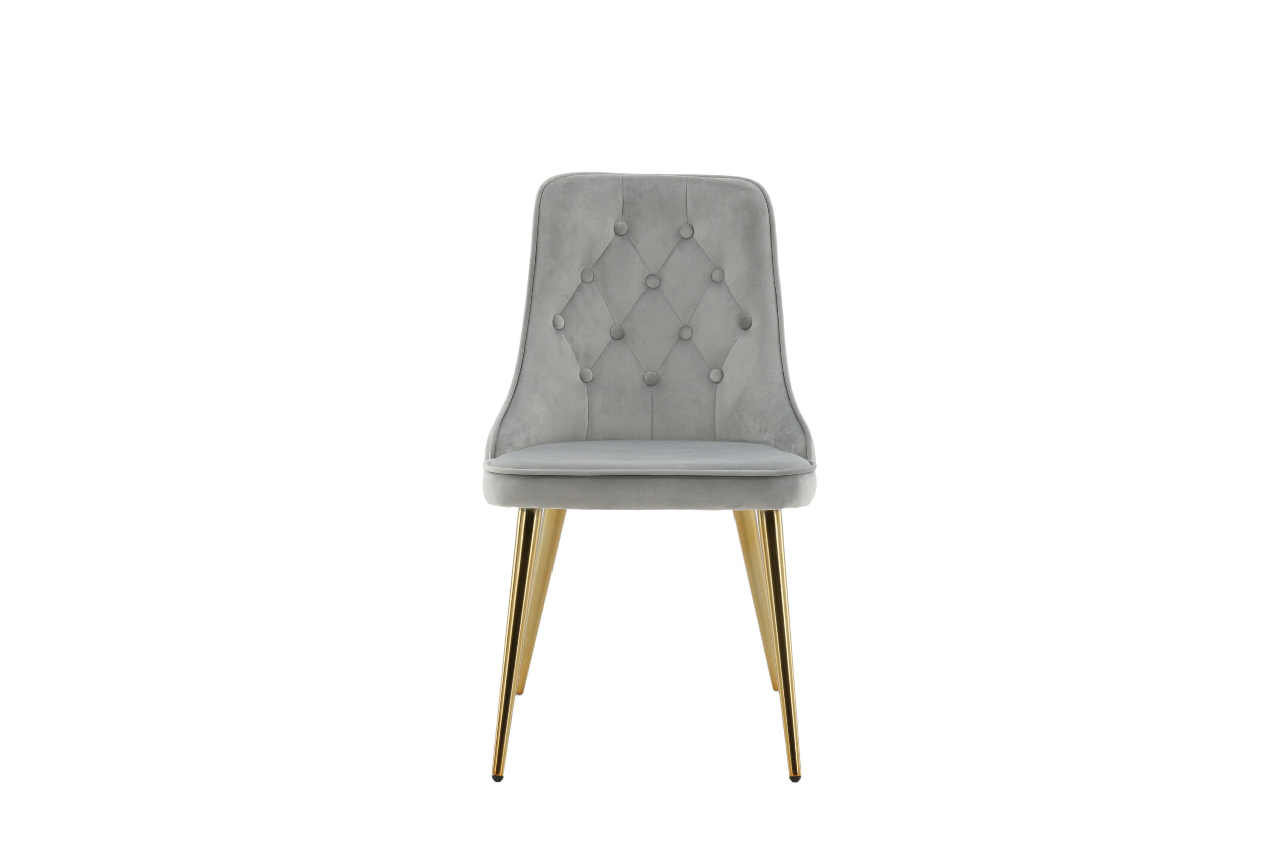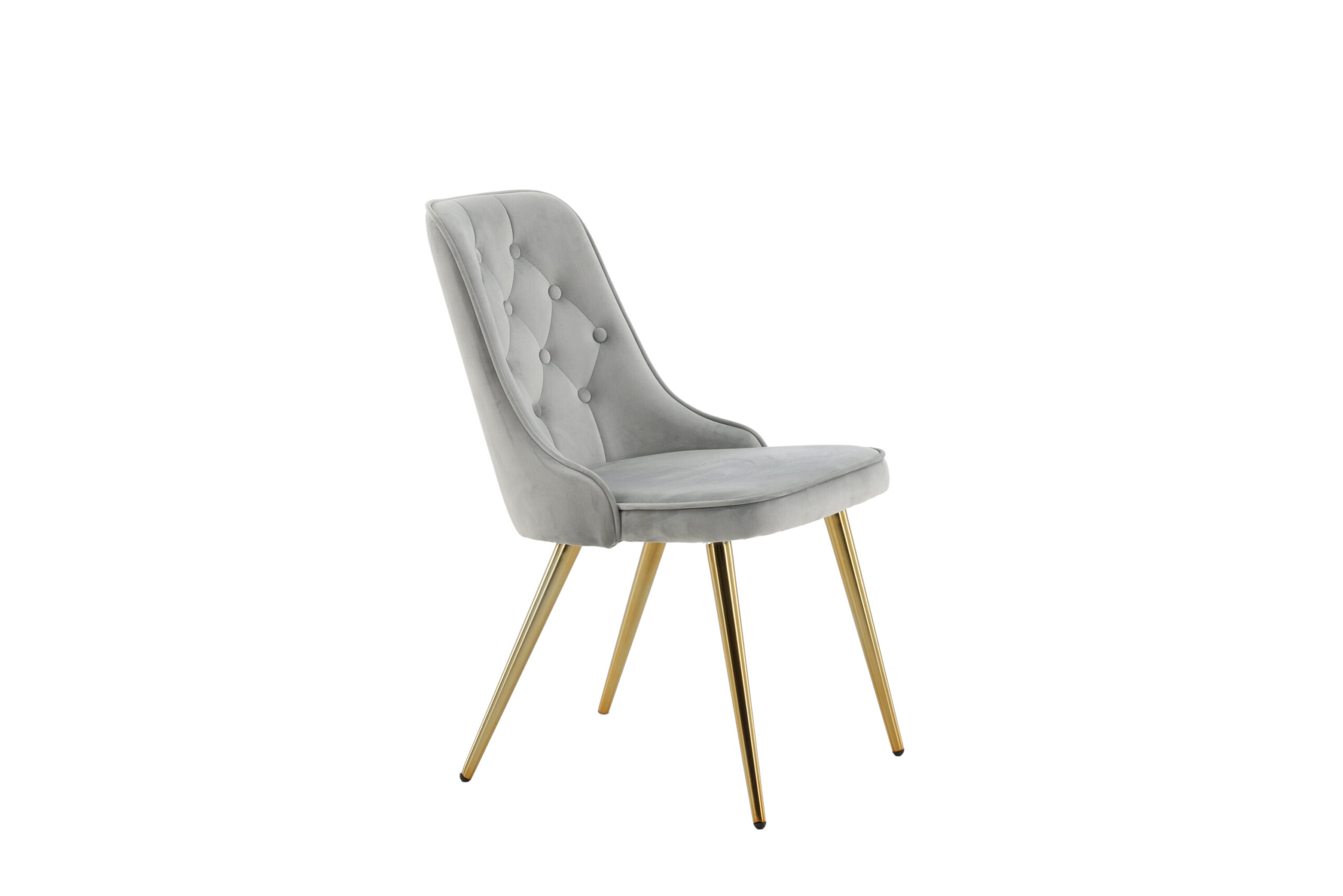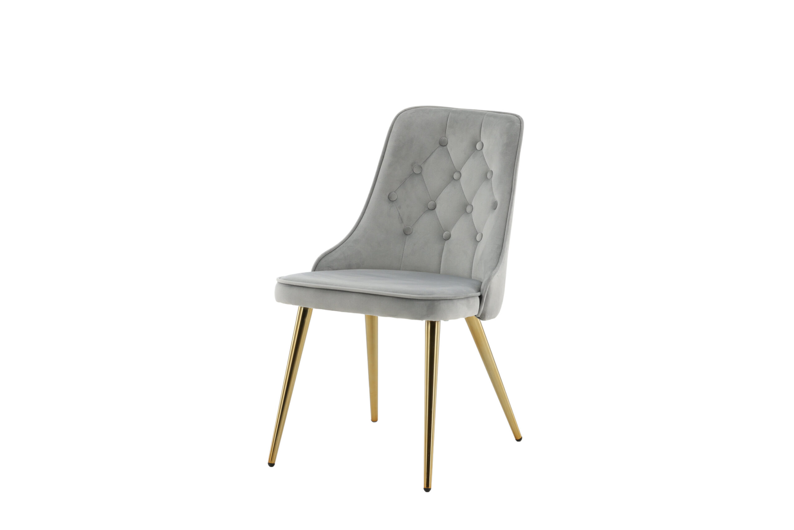 Papuoškite savo namus valgomojo kėdėmis iš kolekcijos Velvet Luxe, kad svetainė taptų elegantiškesnė! Kėdė aptraukta elegantišku pilku aksomo audiniu su sagomis ir dekoratyviniais dygsniais nugaroje, kurie suteikia jai elegantiškumo. Kojos iš žalvario apdaila padengto metalo, o atlošo ir sėdimosios dalies paminkštinimas, suteikia papildomo komforto. Nesudėtingai surenkama. Sukurkite modernų dėmesio traukos centrą.