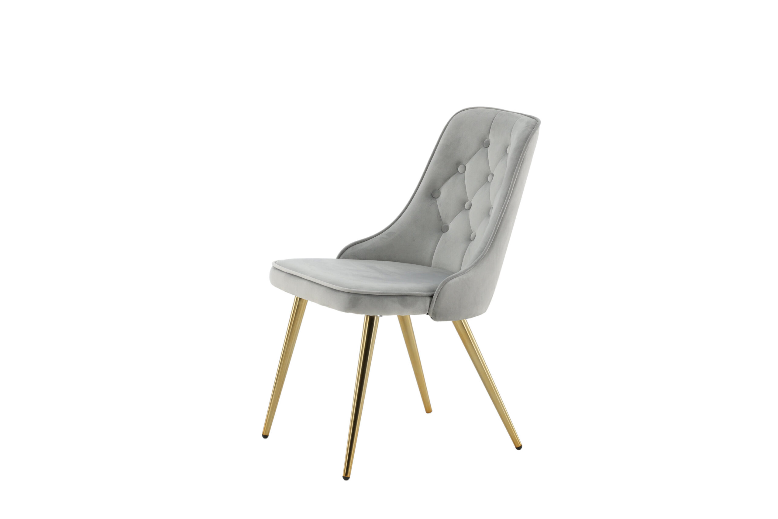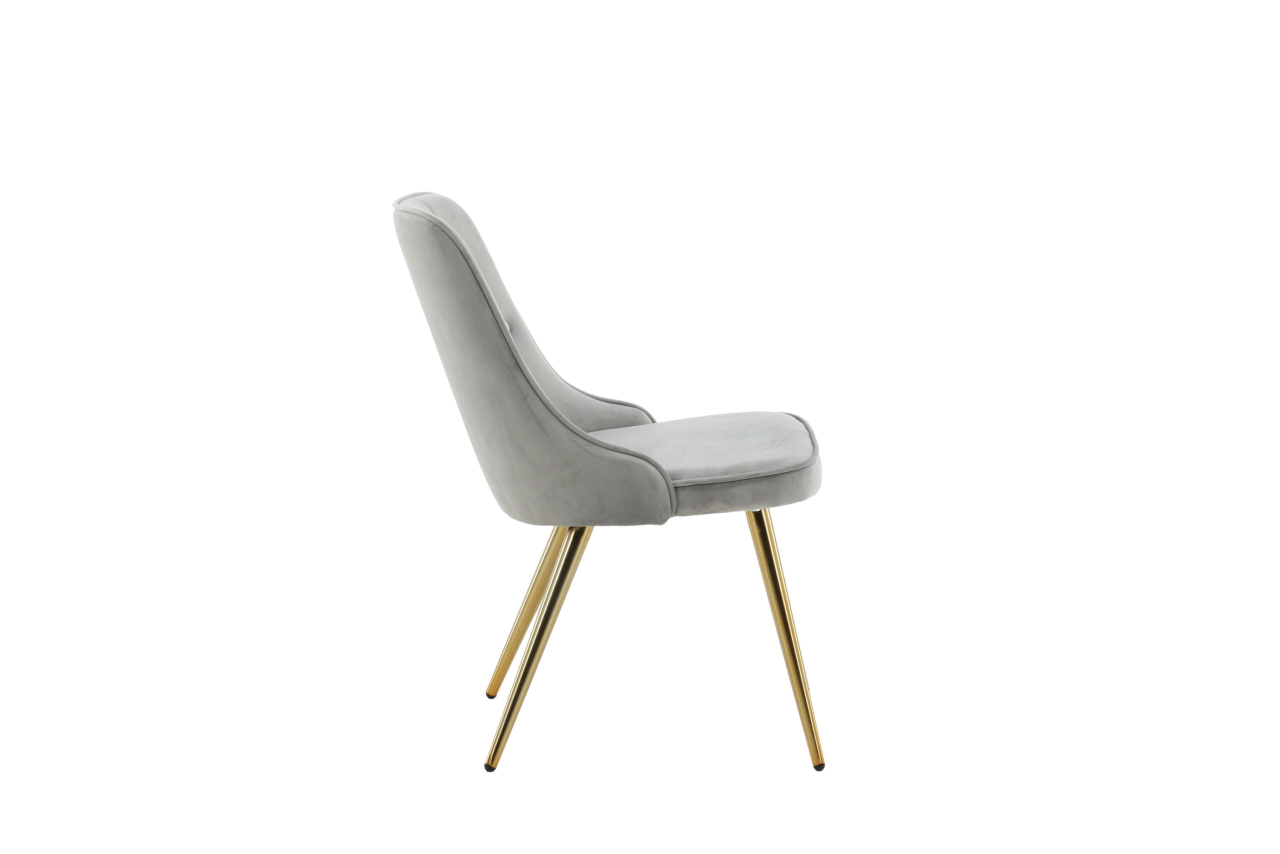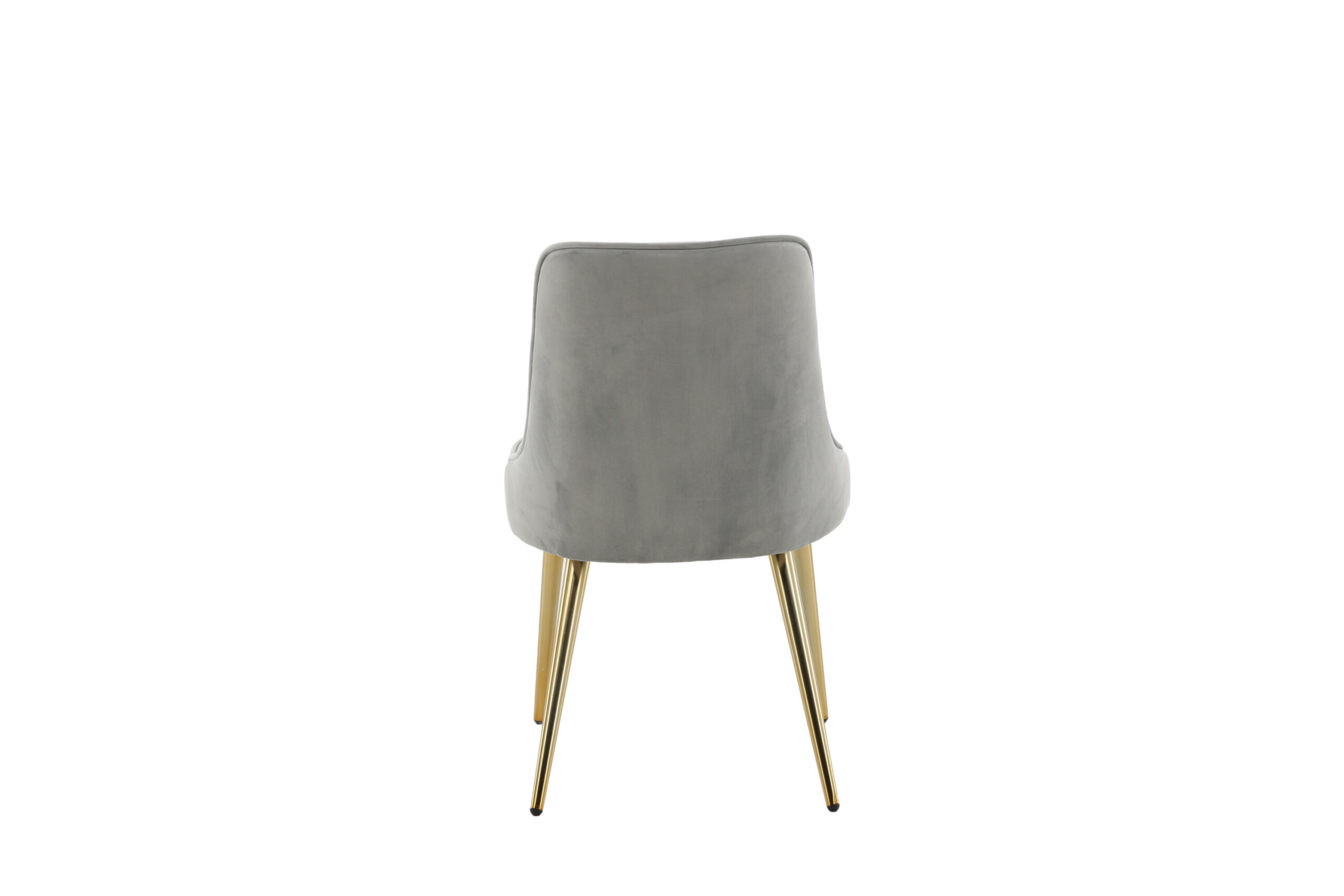 Papuoškite savo namus valgomojo kėdėmis iš kolekcijos Velvet Luxe, kad svetainė taptų elegantiškesnė! Kėdė aptraukta elegantišku pilku aksomo audiniu su sagomis ir dekoratyviniais dygsniais nugaroje, kurie suteikia jai elegantiškumo. Kojos iš žalvario apdaila padengto metalo, o atlošo ir sėdimosios dalies paminkštinimas, suteikia papildomo komforto. Nesudėtingai surenkama. Sukurkite modernų dėmesio traukos centrą.