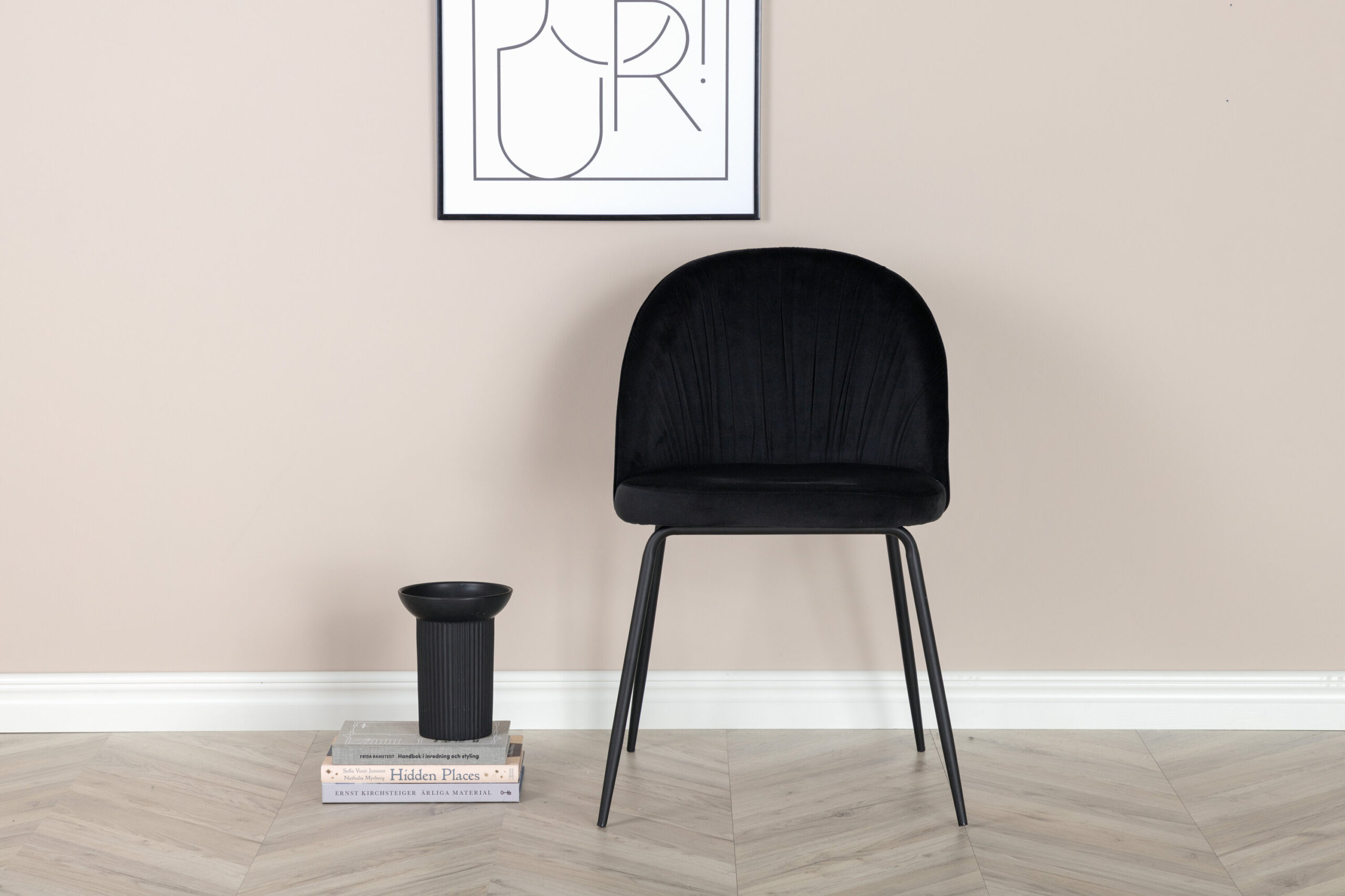 Moderni kėdė, kurios nusipelno kiekvienas - patogi, stilinga ir šiuolaikiška! Valgomojo kėdė Wrinkles yra išskirtinio dizaino, juodos spalvos milteliniu būdu dažyto metalo kojomis. Suapvalintas atlošas ir sėdimoji dalis su paminkštinimu, aptraukti rauktu juodo aksomo audiniu, kuris sukuria stilingą ir patrauklią visumą. Lengvai surenkama.